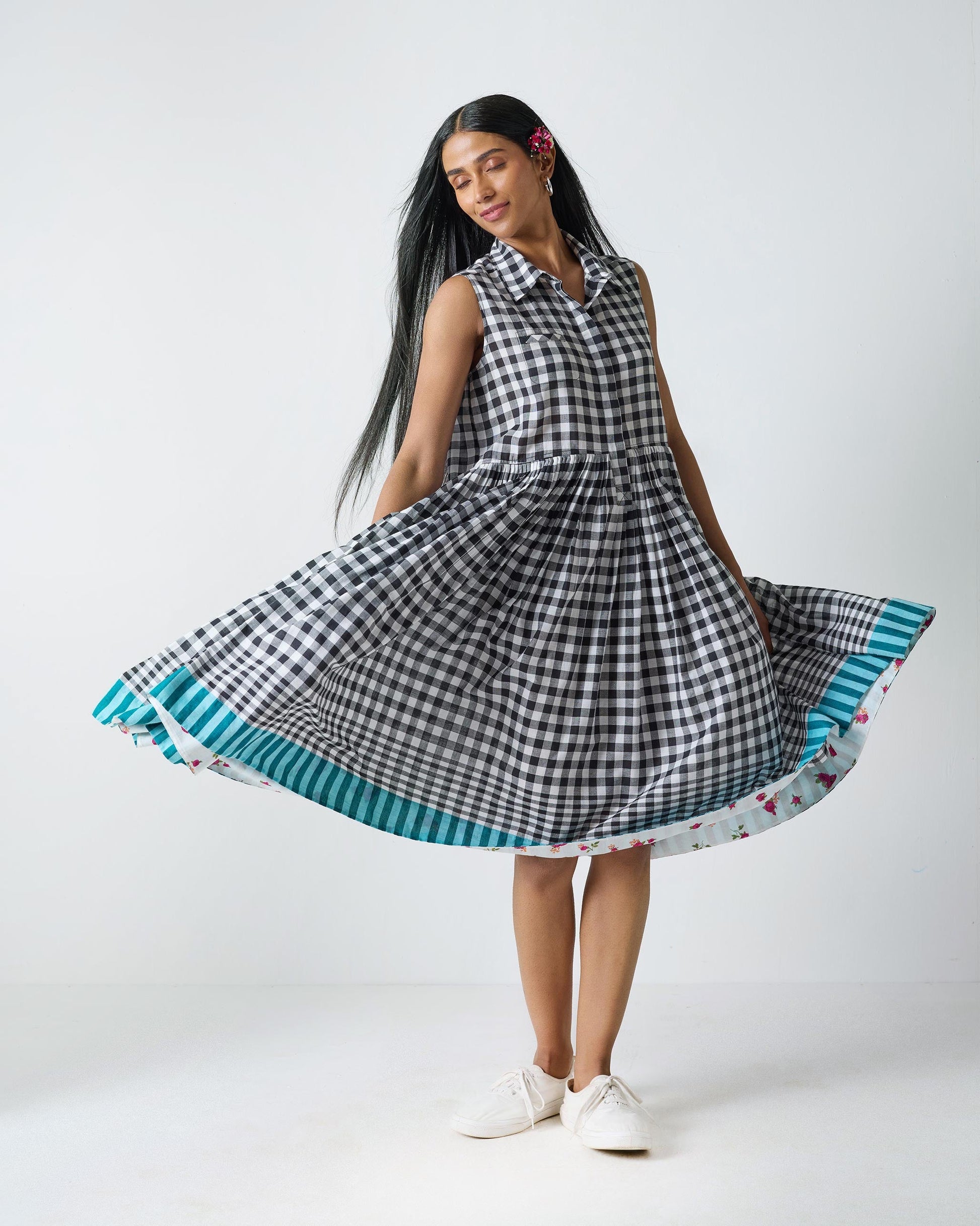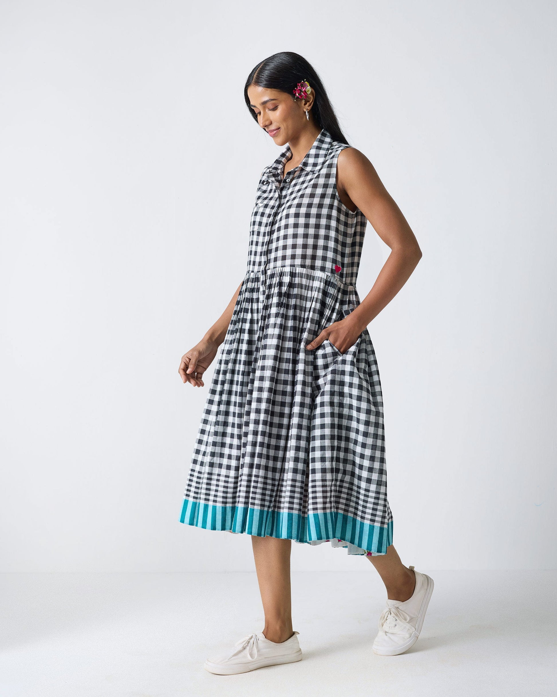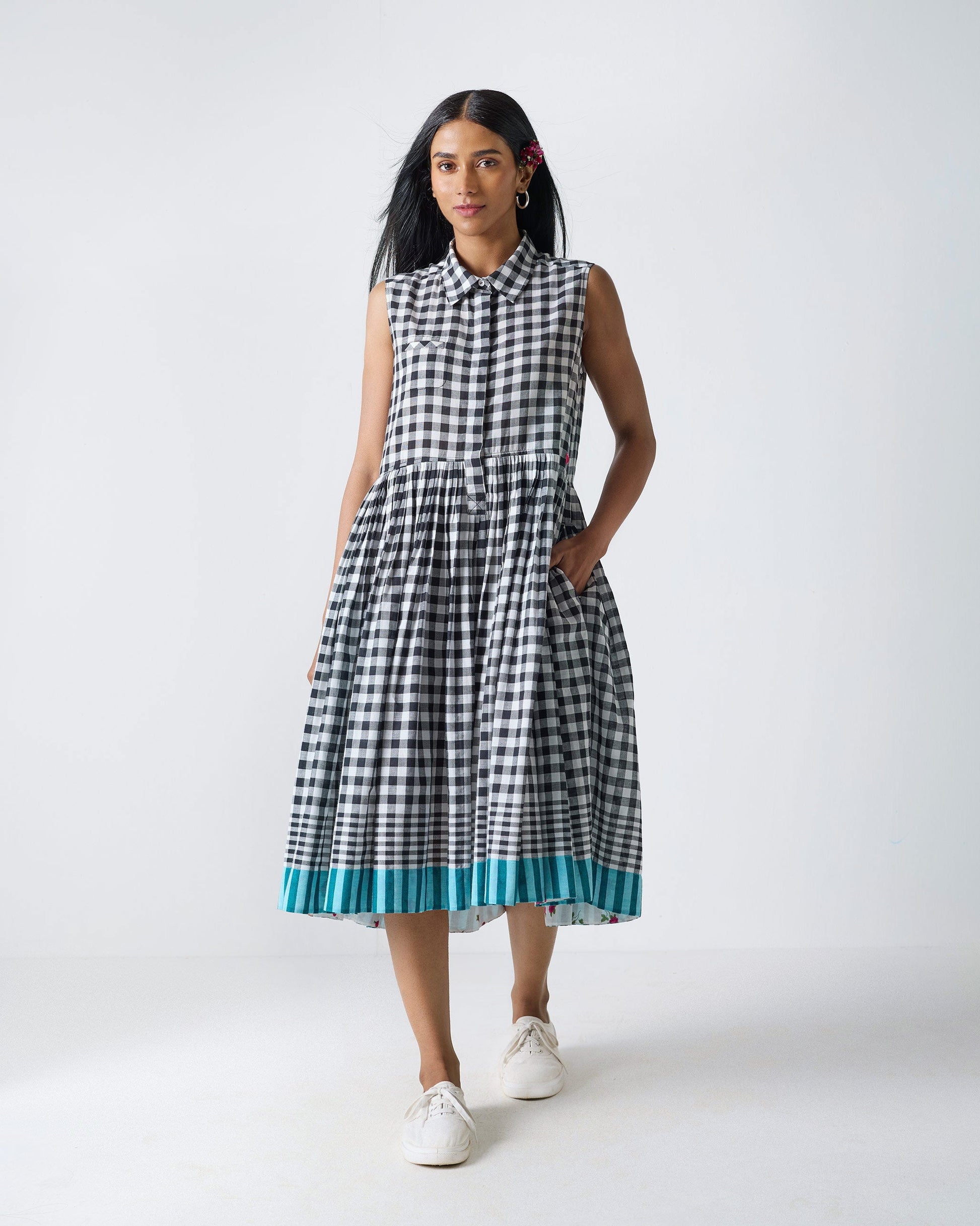 - The Ada Dress is a classic yet contemporary piece that effortlessly combines bold patterns with a pop of color. Made from 100% cotton, the dress features a sharp black and white checked selvedge fabric, with a refreshing aqua selvedge detail at the bottom hem that adds a modern twist.