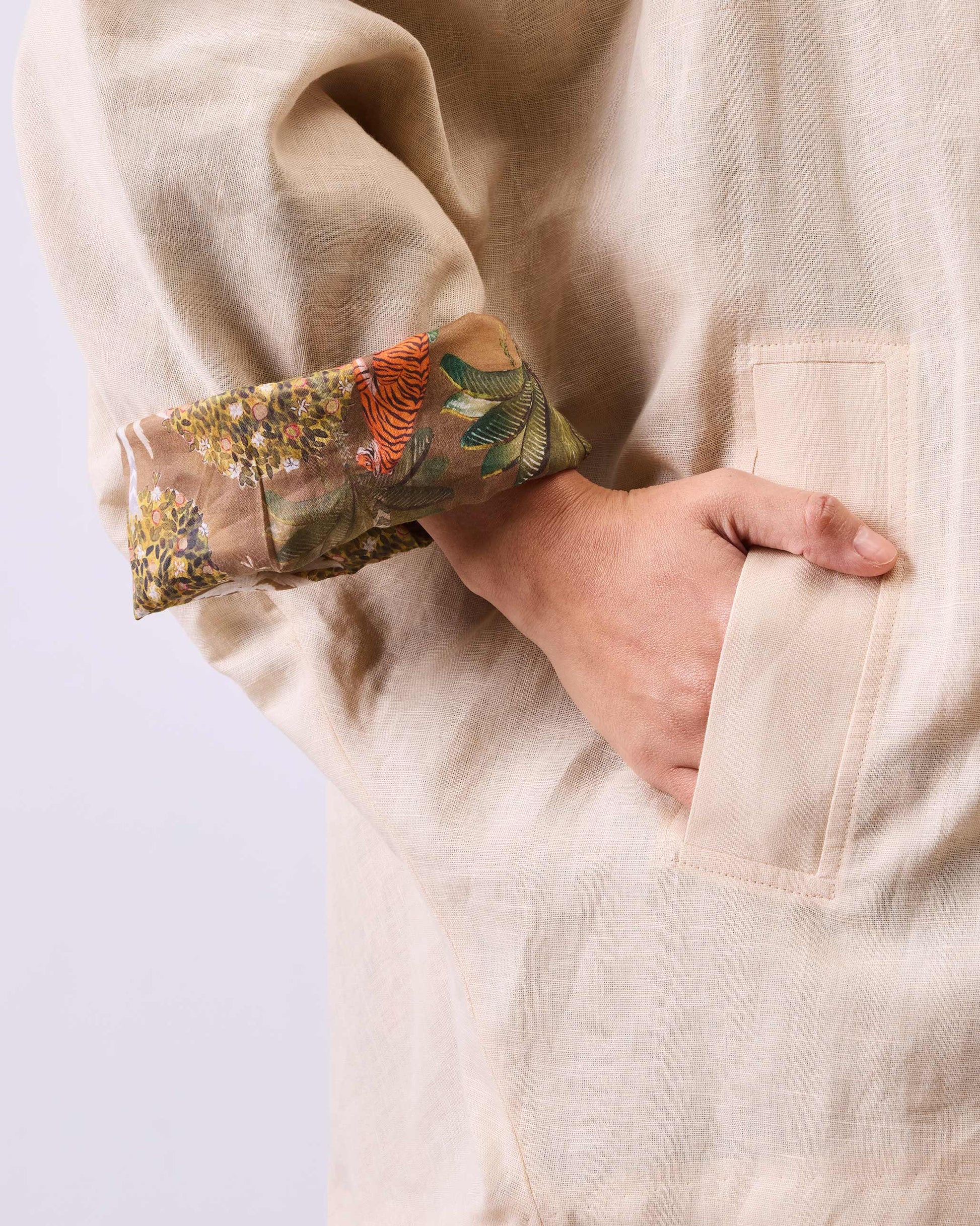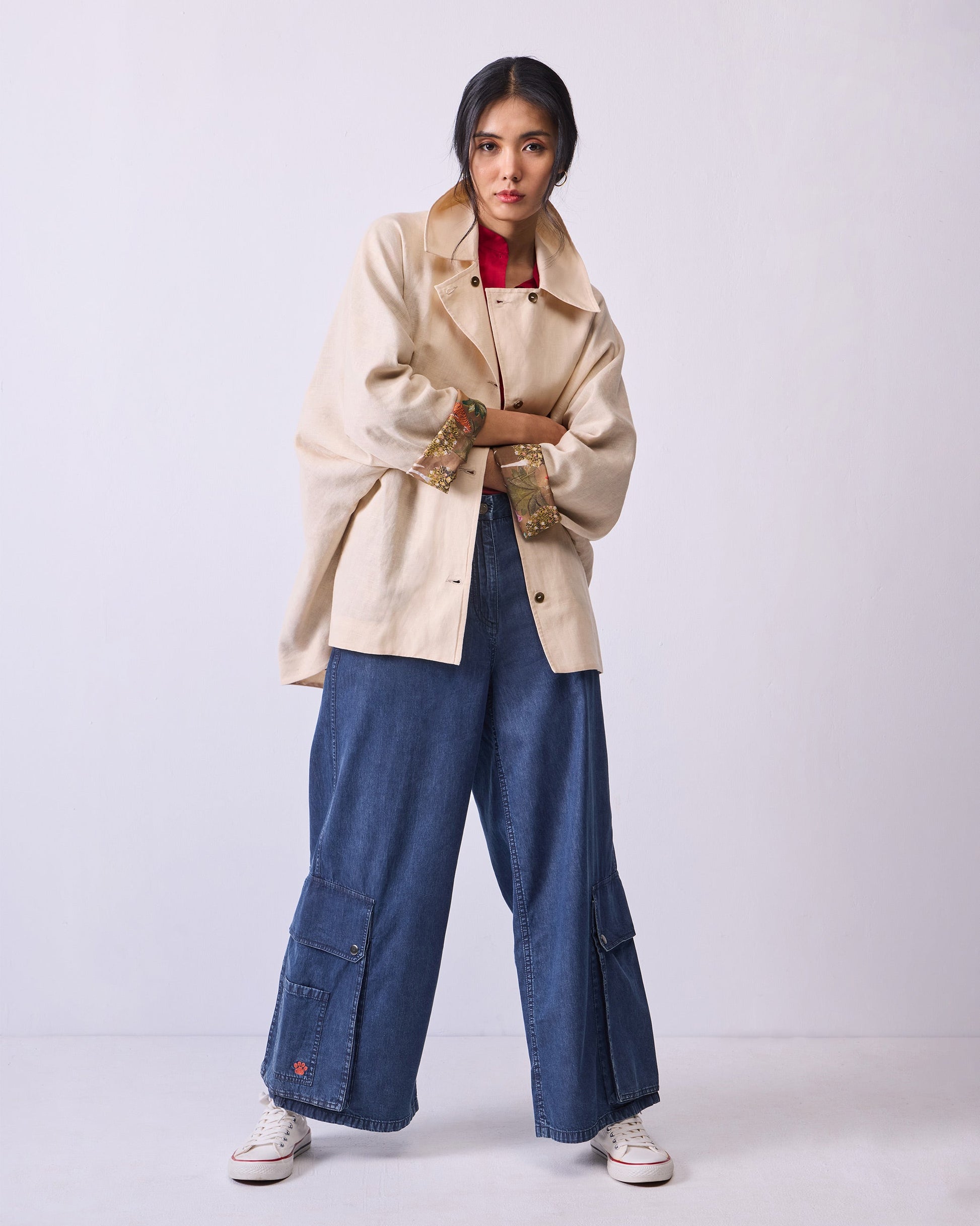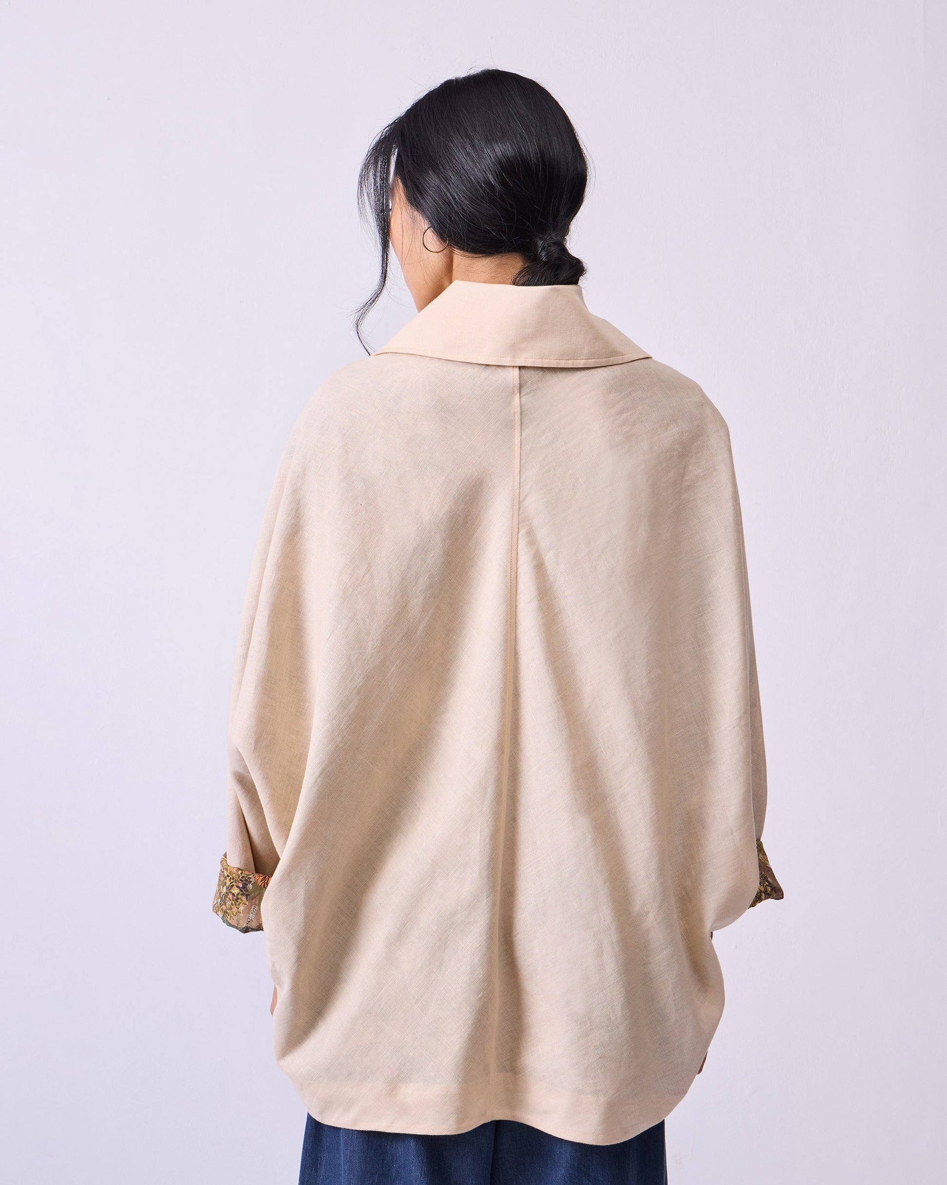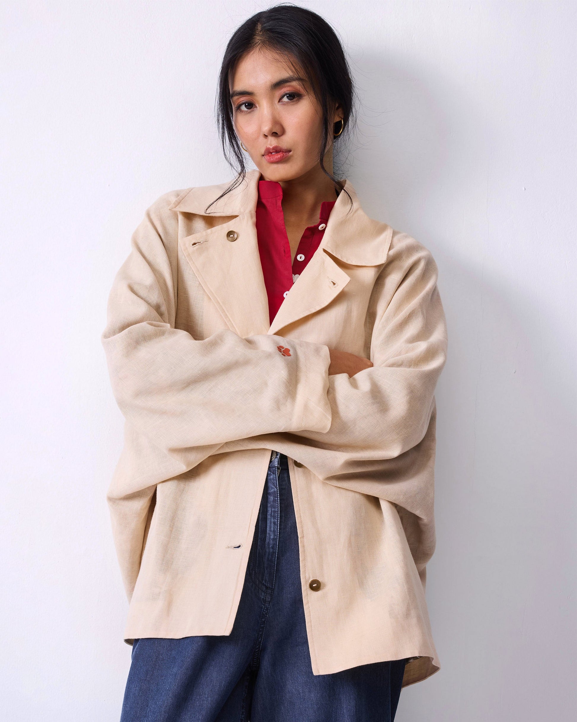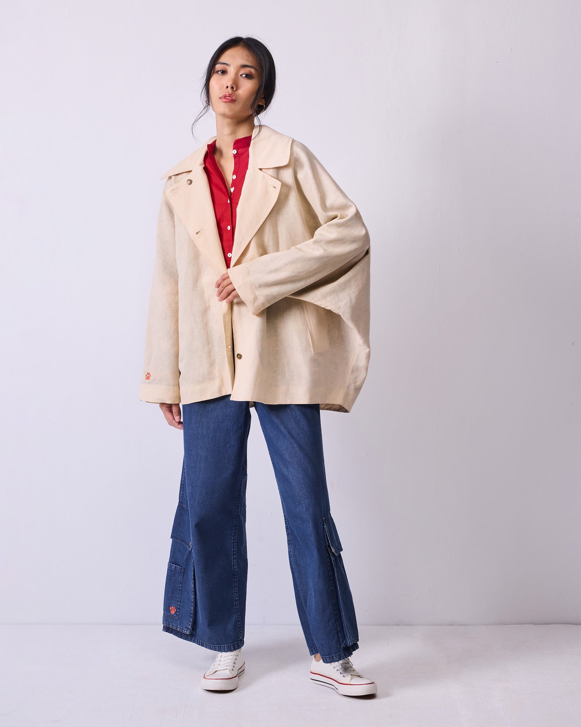 - The Batwing Jacket in beige is crafted from a breathable linen-cotton blend, offering a natural, lightweight feel.
