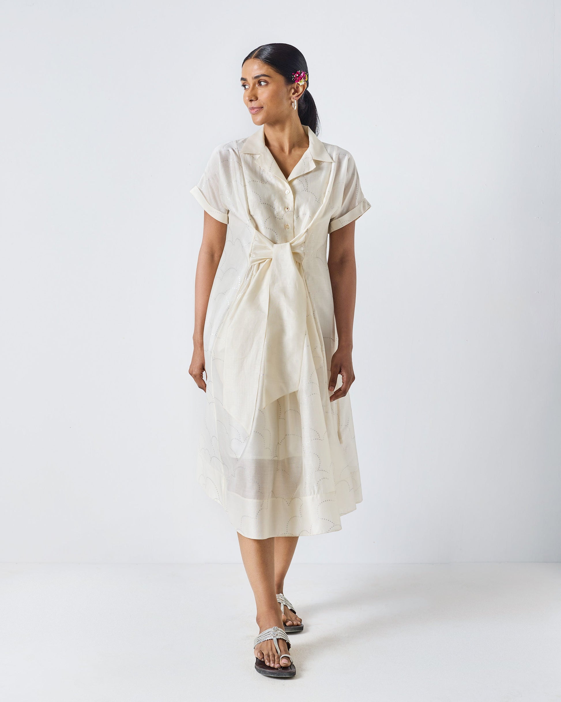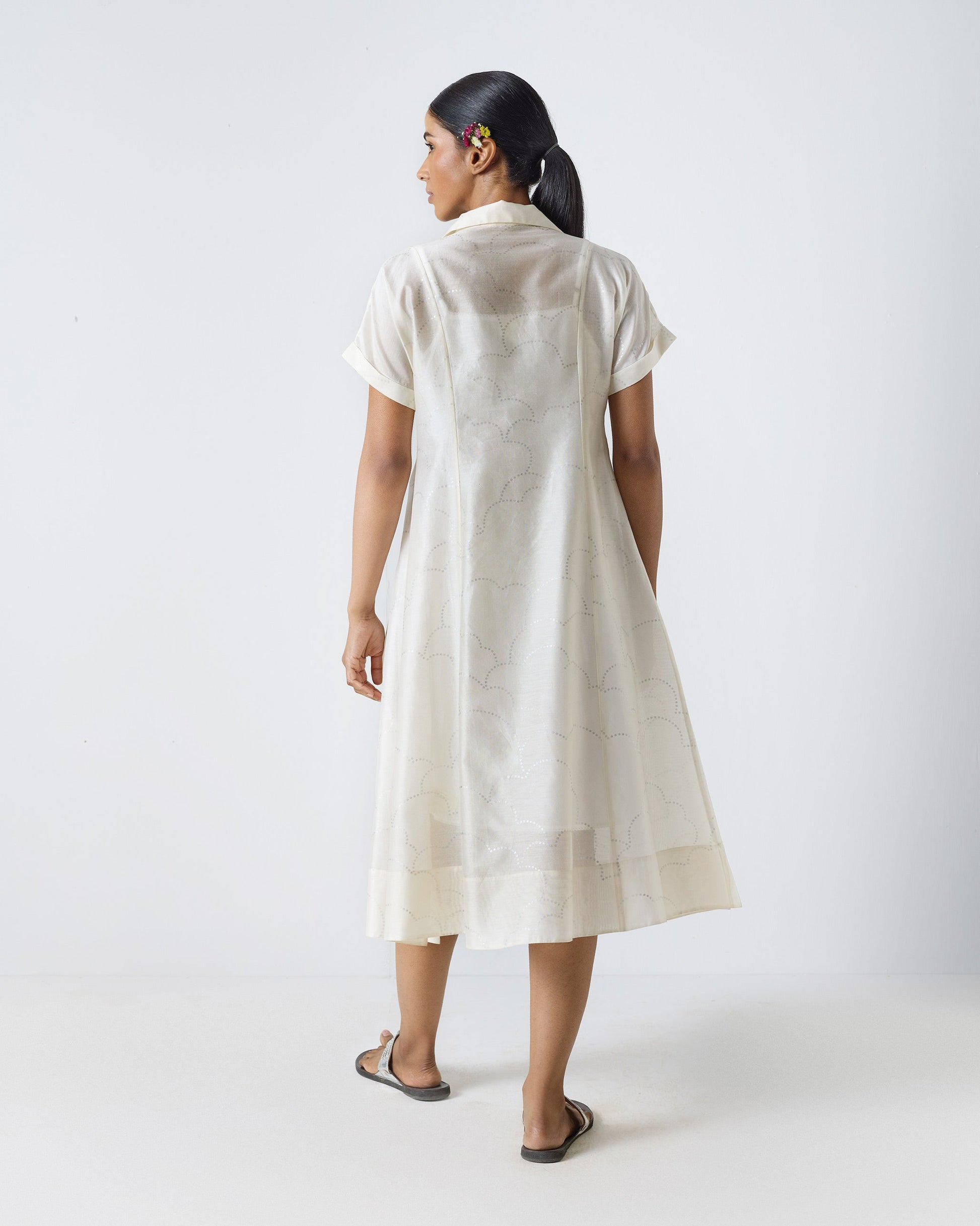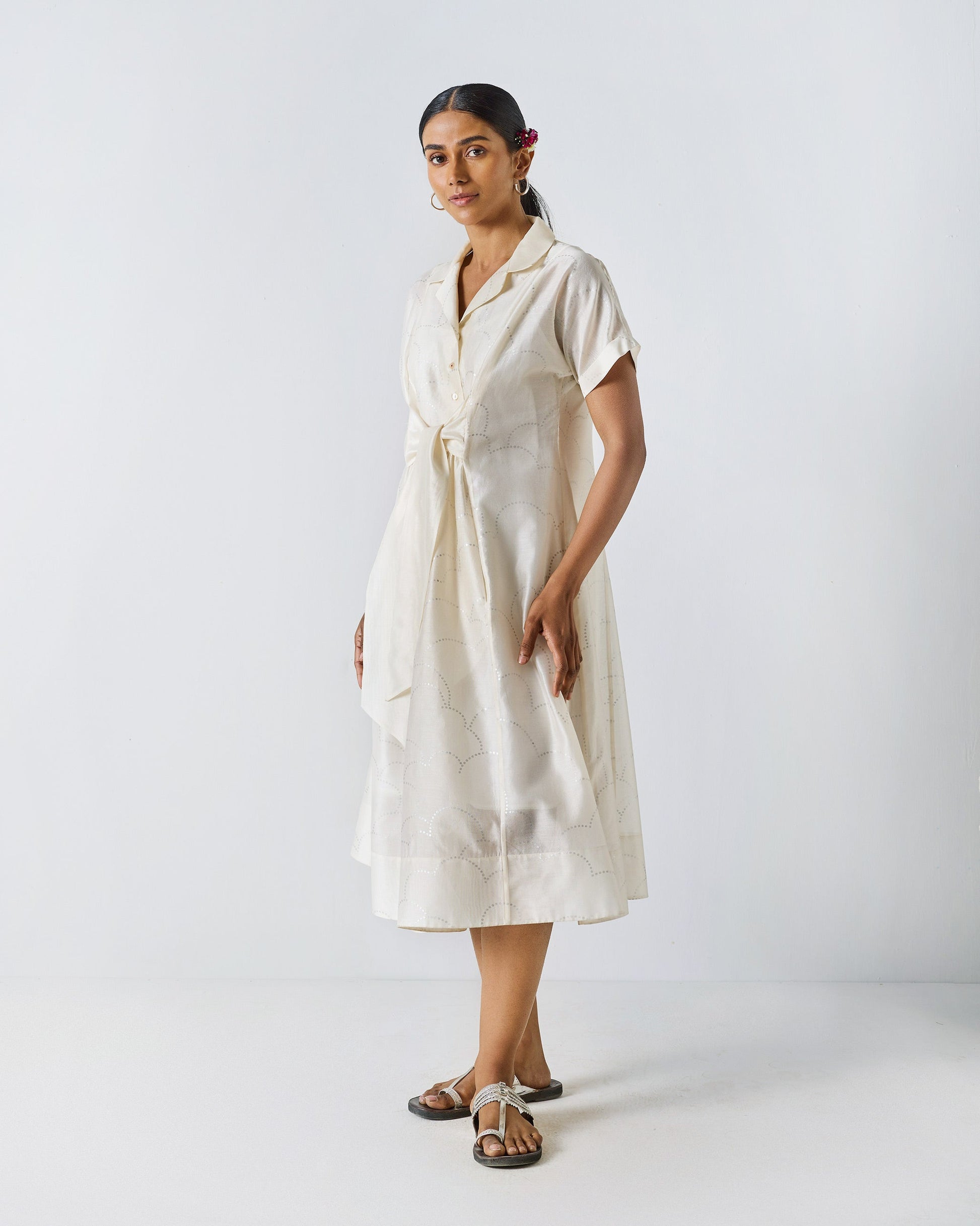 - The Cadeau Dress is crafted from luxurious cotton silk fabric, featuring a soft ivory base adorned with a shimmering silver cloud print, creating a serene, ethereal look.