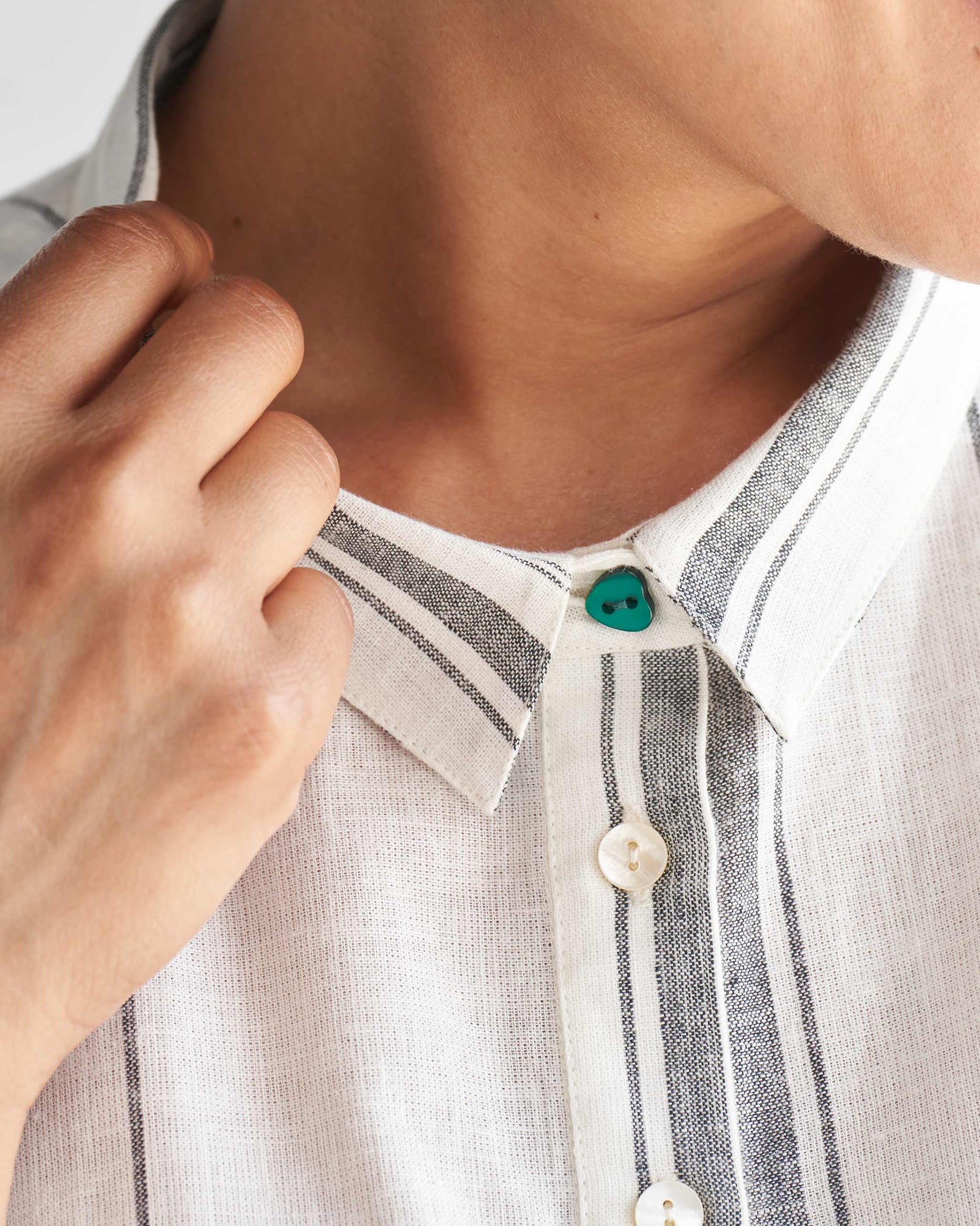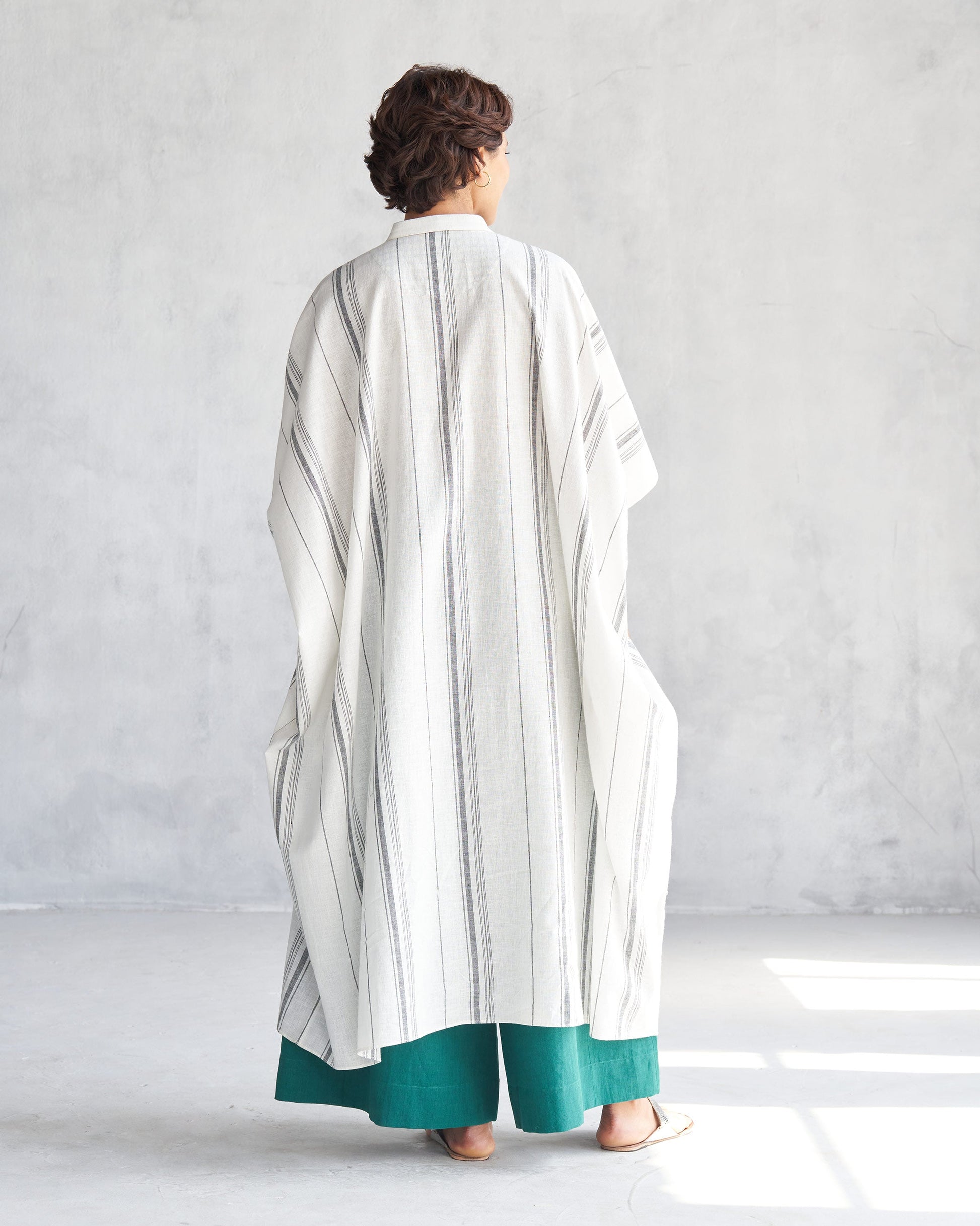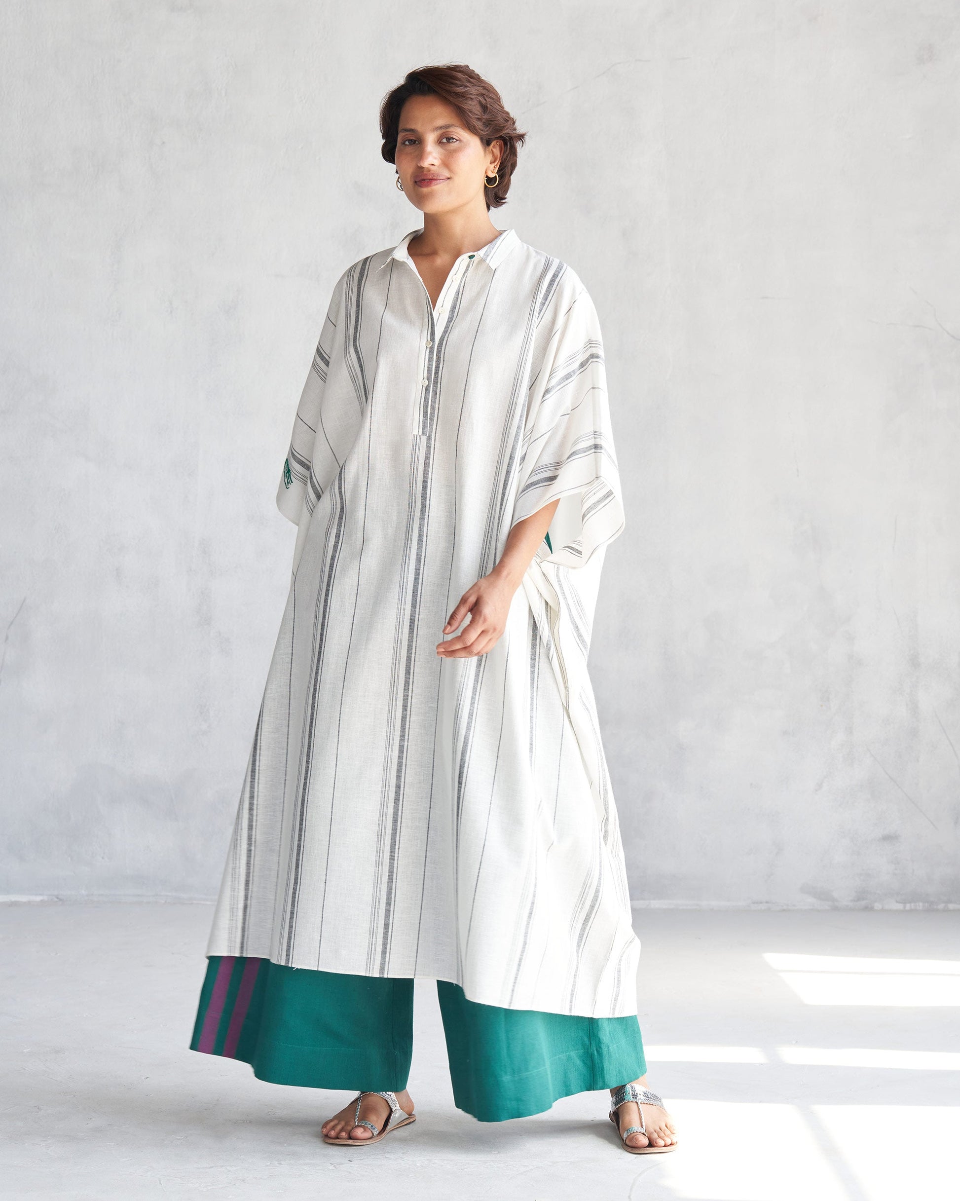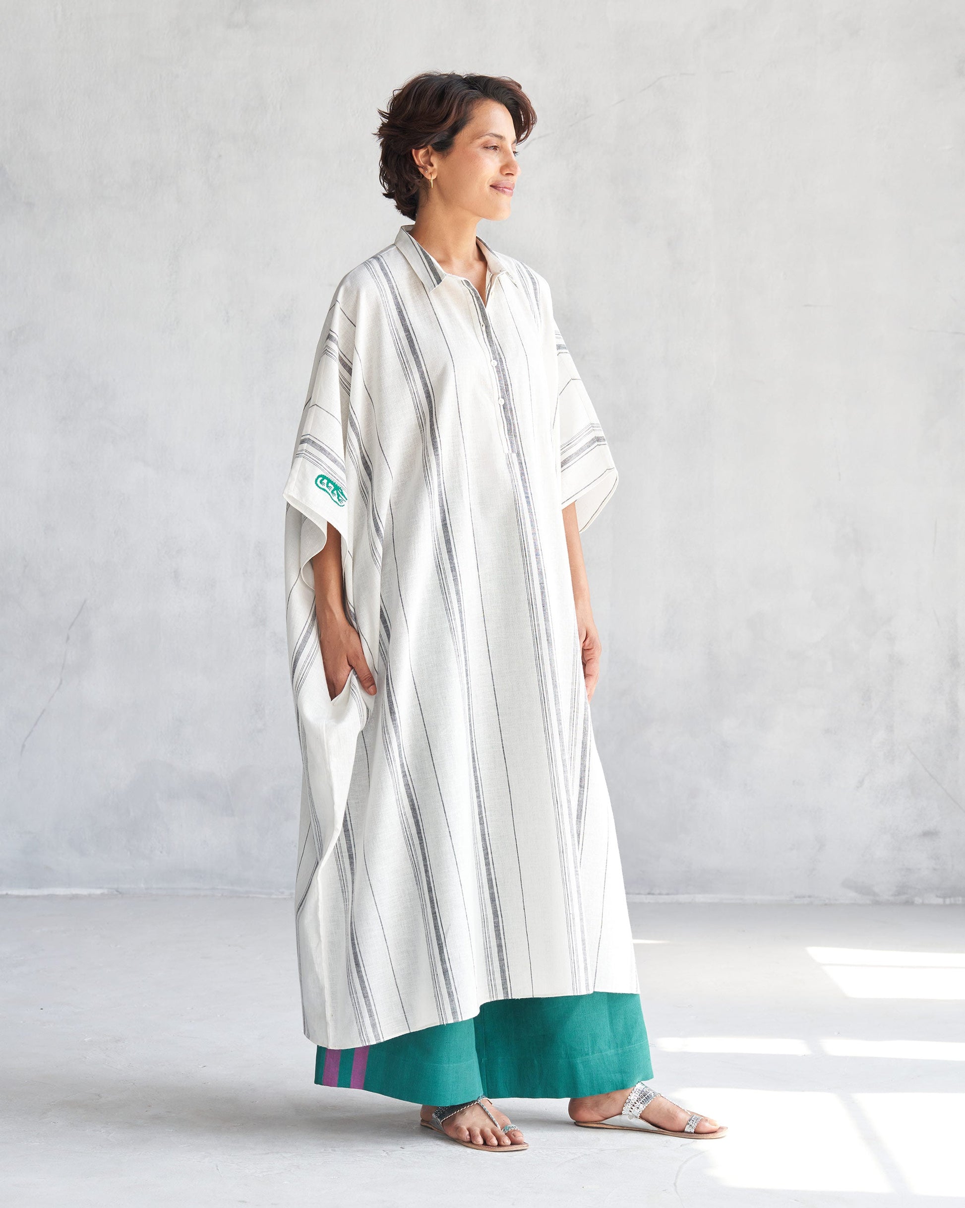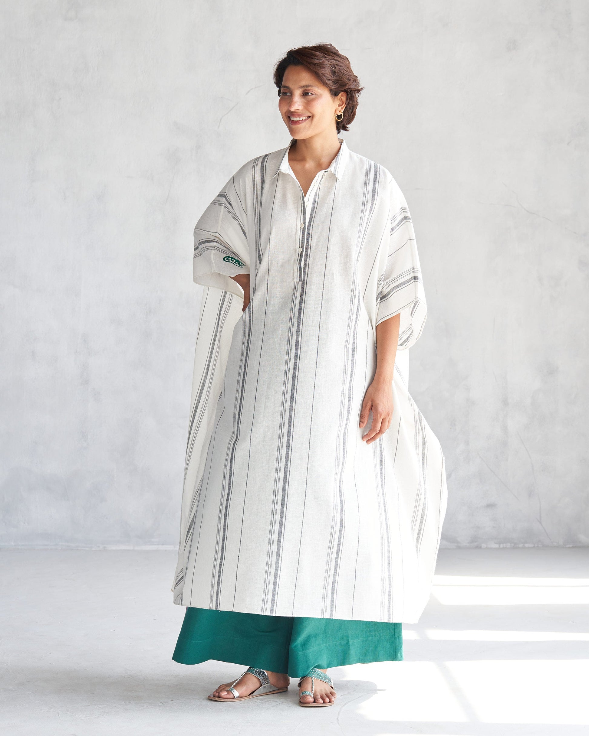 - Get ready to become the talk of the town in our Collared Kaftan, crafted from 100% yarn-dyed cotton linen, featuring grey and ivory stripes that exude an air of unparalleled chicness.