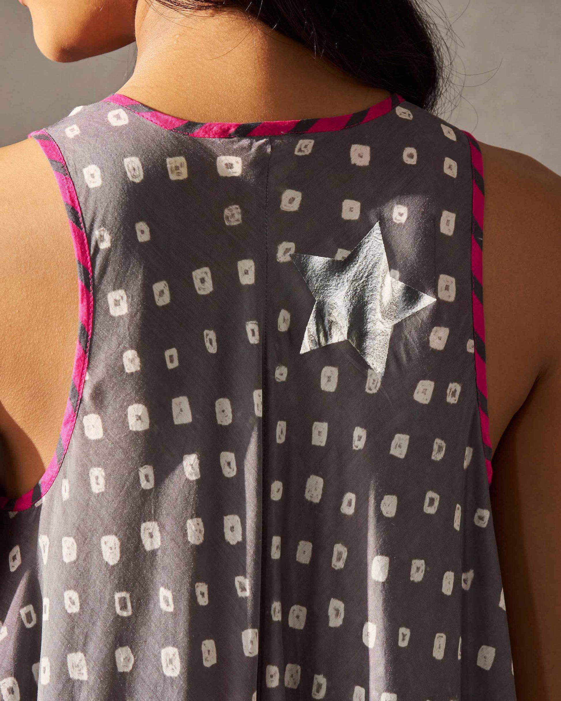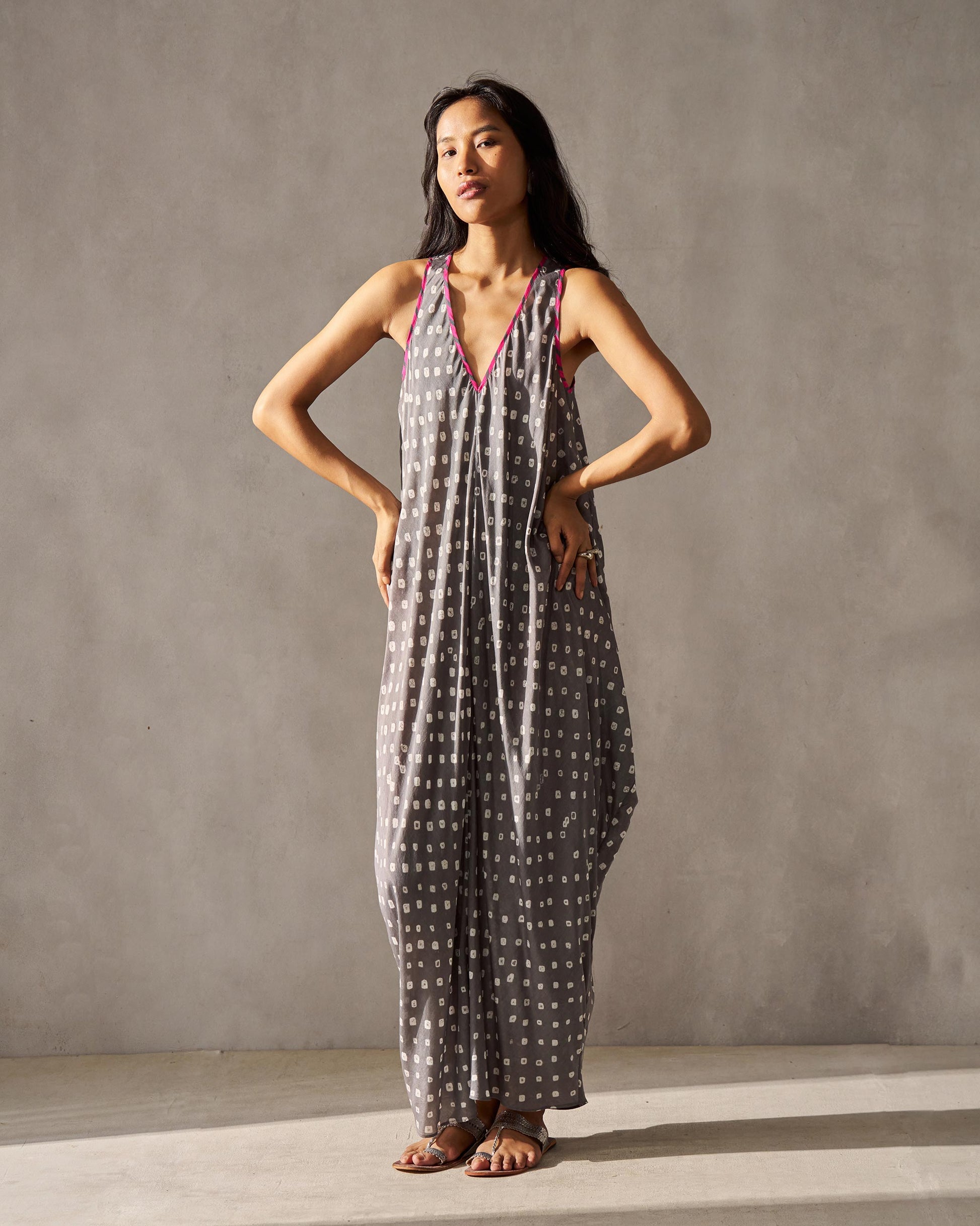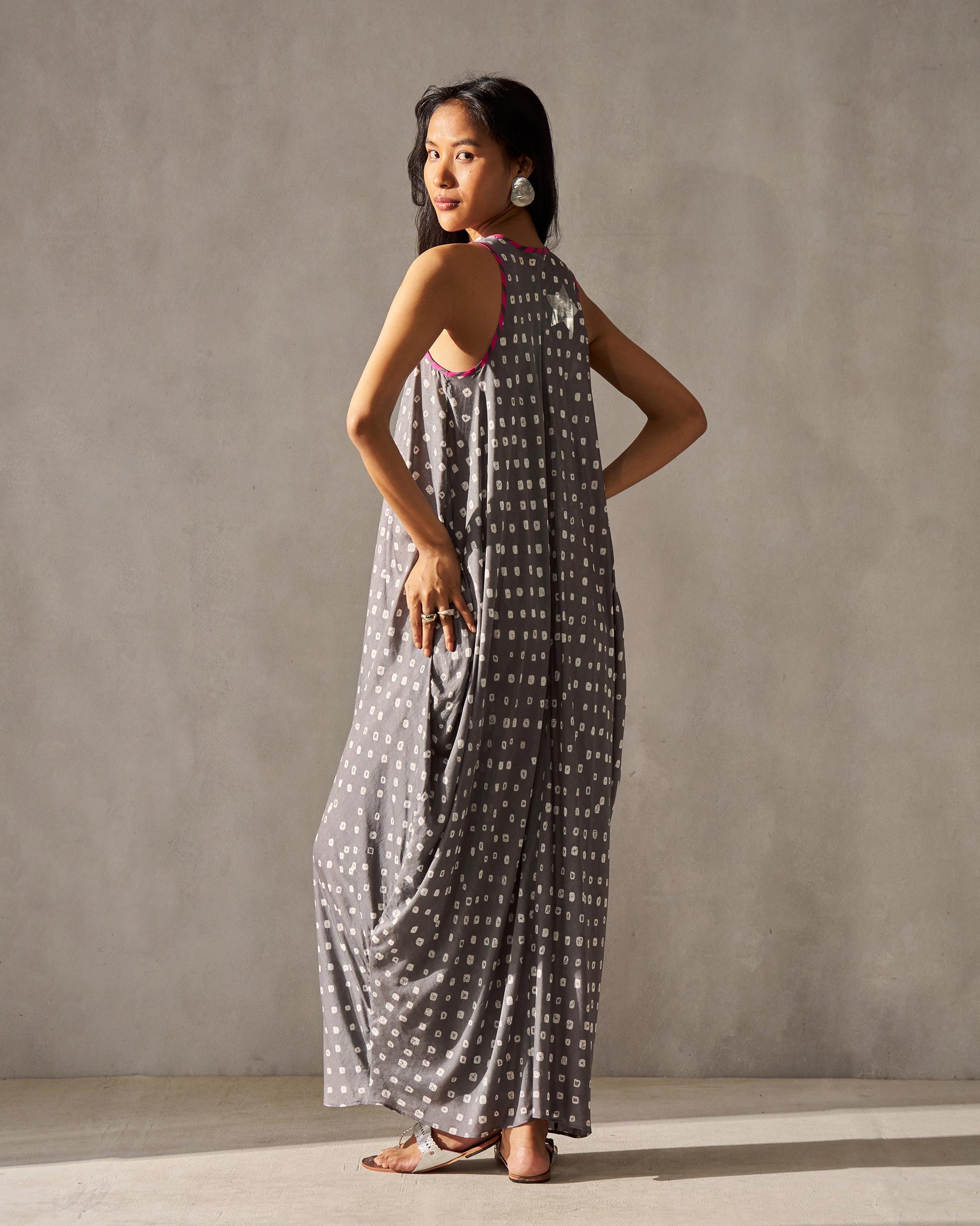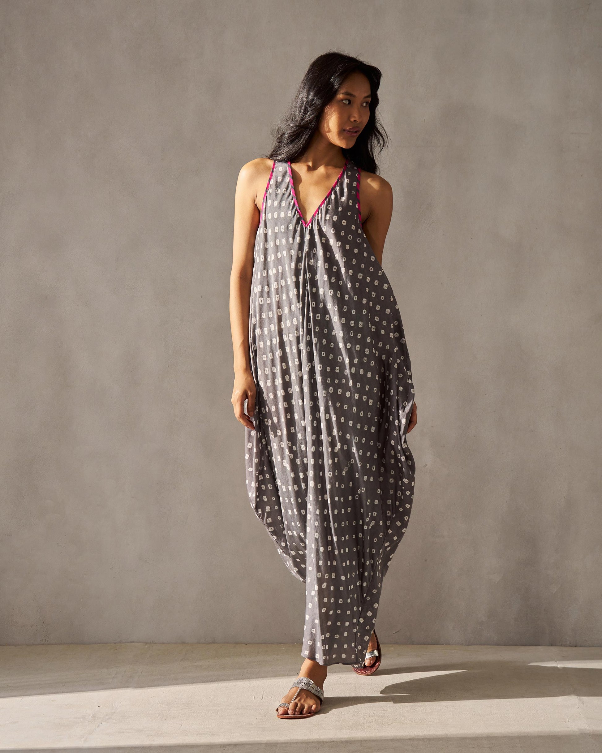 - The Easy Cowl Dress stands out in a deep grey with an all over bandhani print.