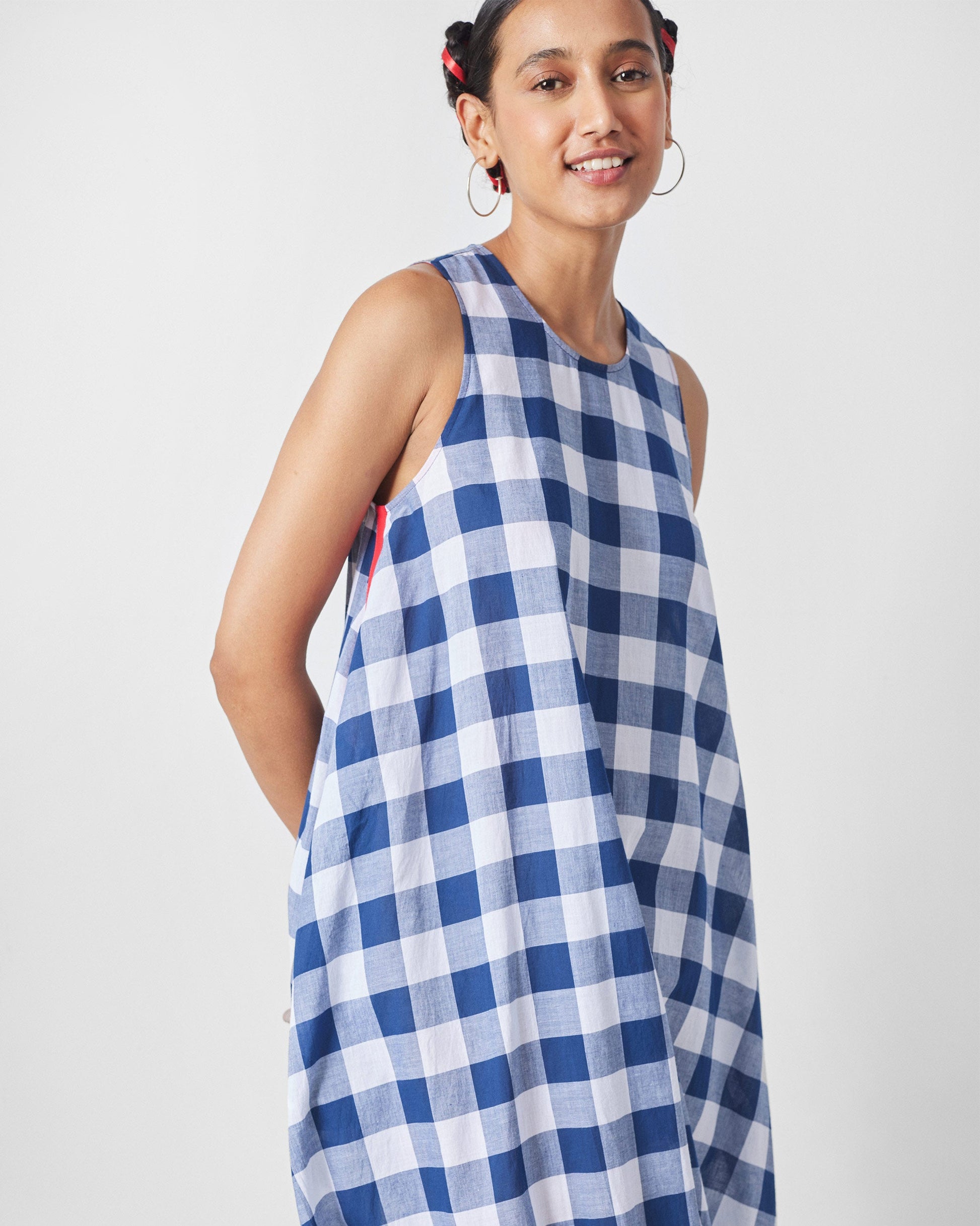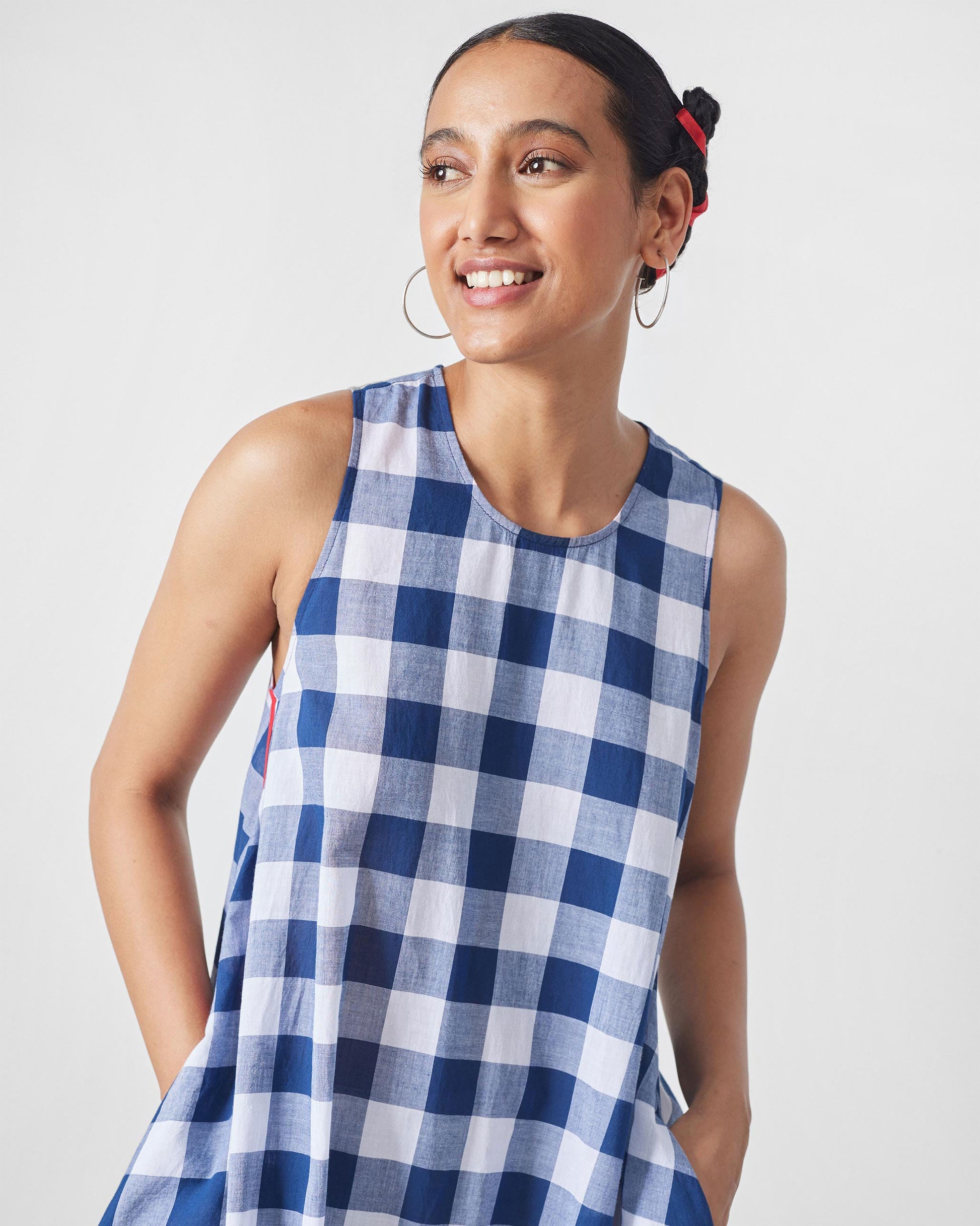 - The Fiji Dress pairs classic blue-and-white checks with an airy A-line fit in 100% cotton.