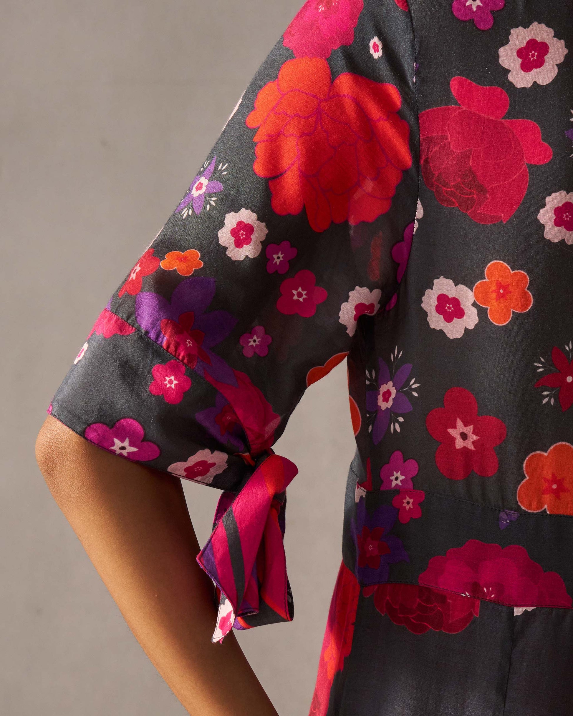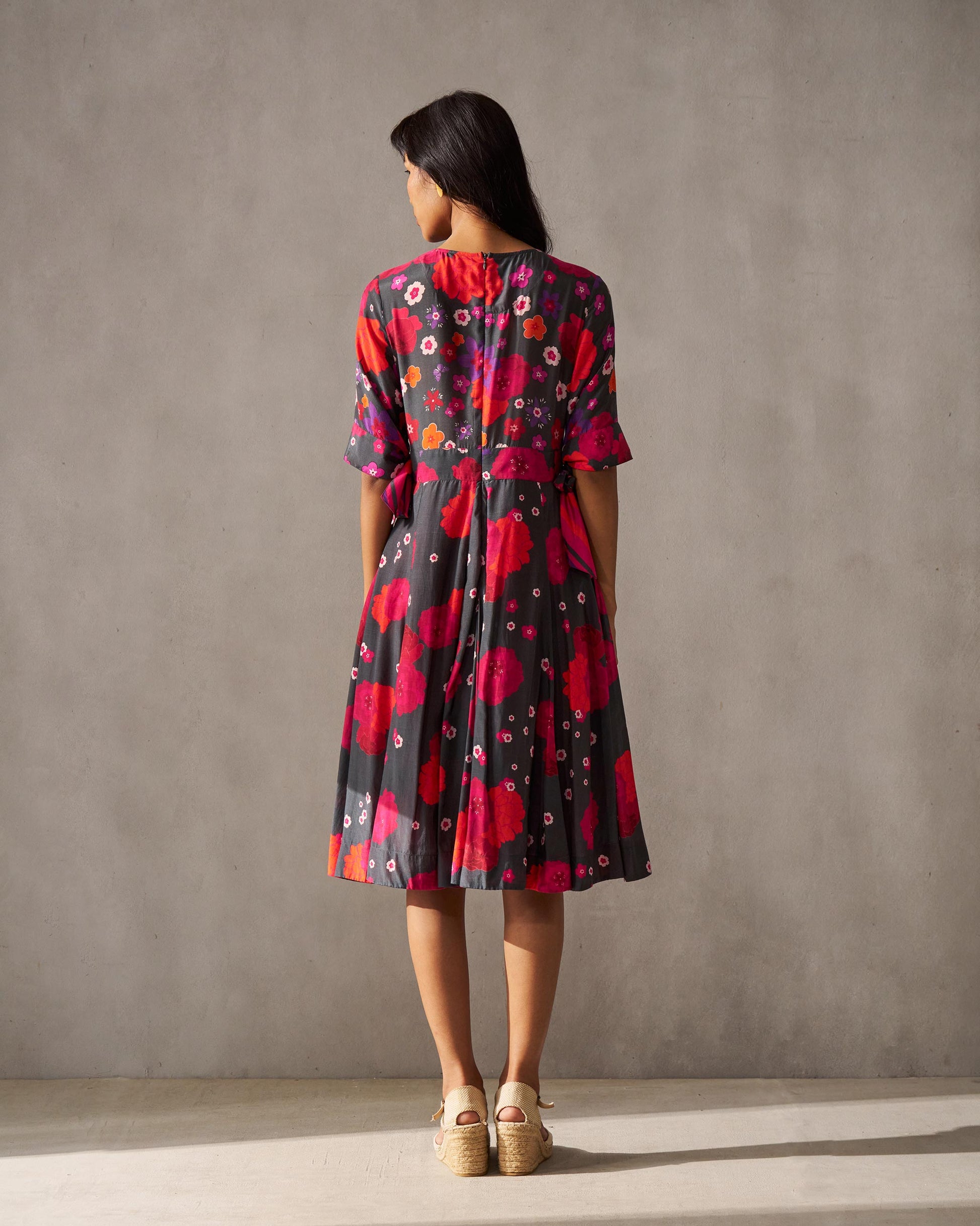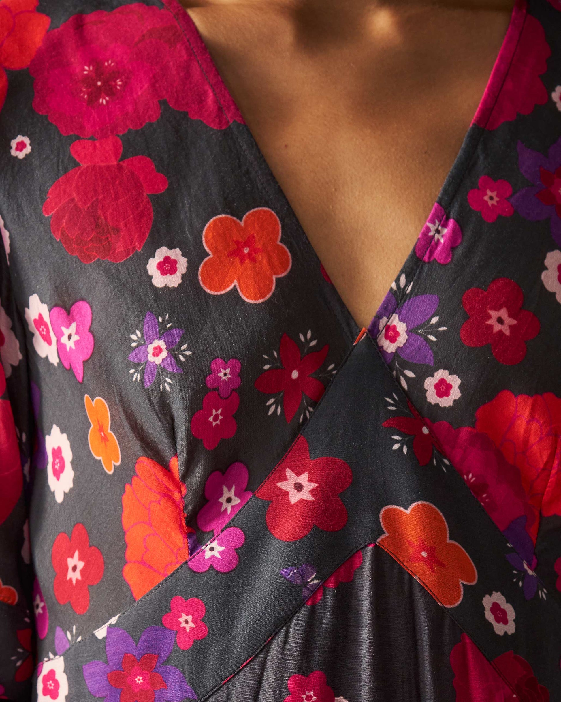 - The dress has different floral prints on different panels, making this piece a head turner.