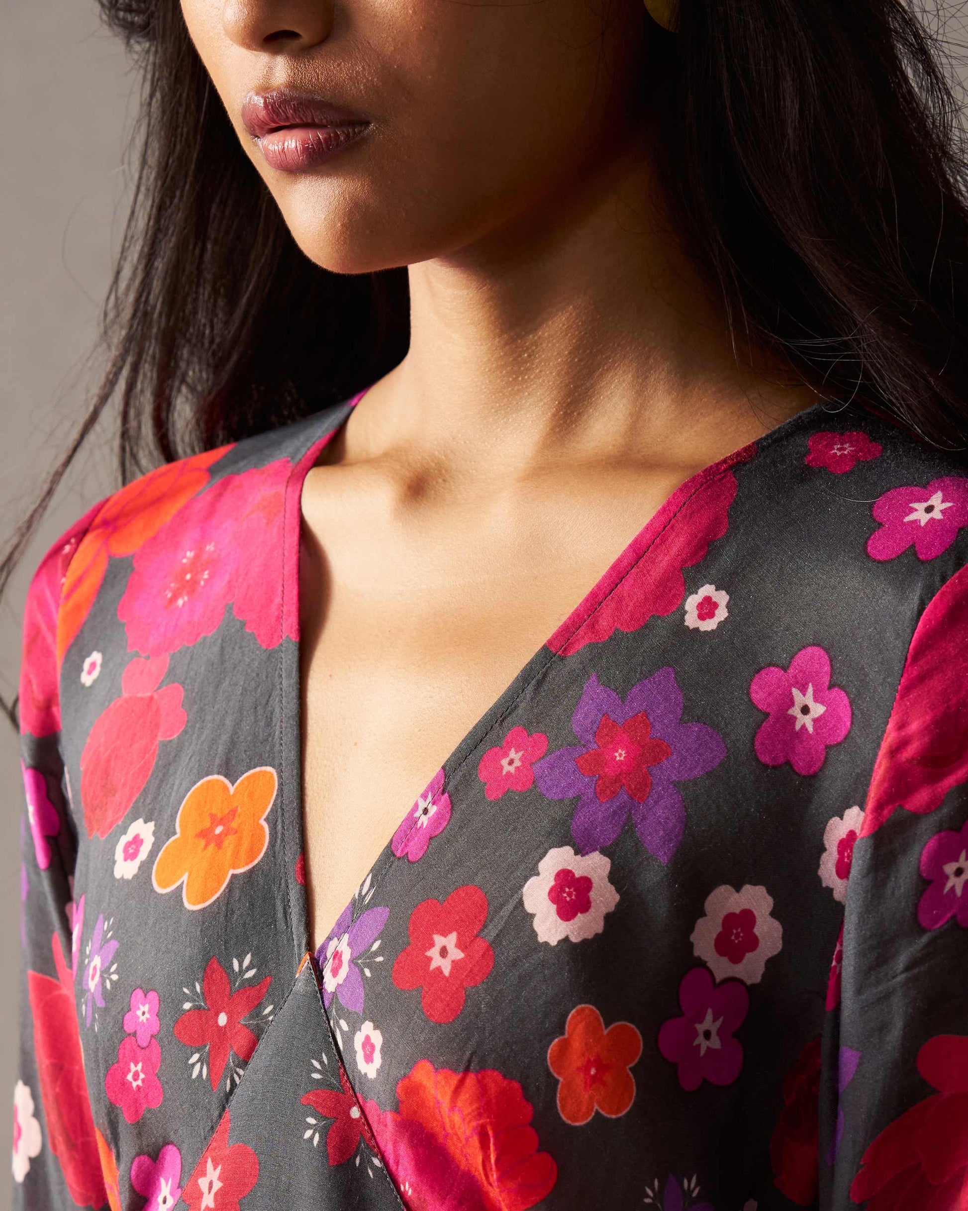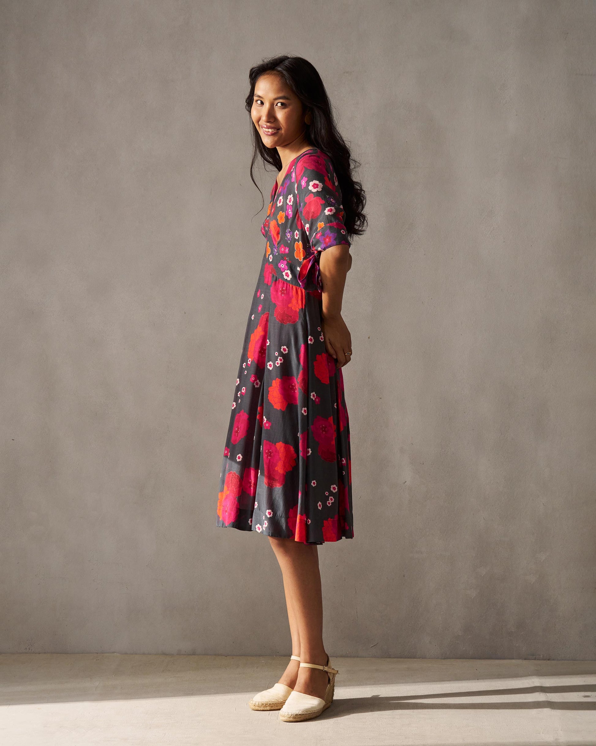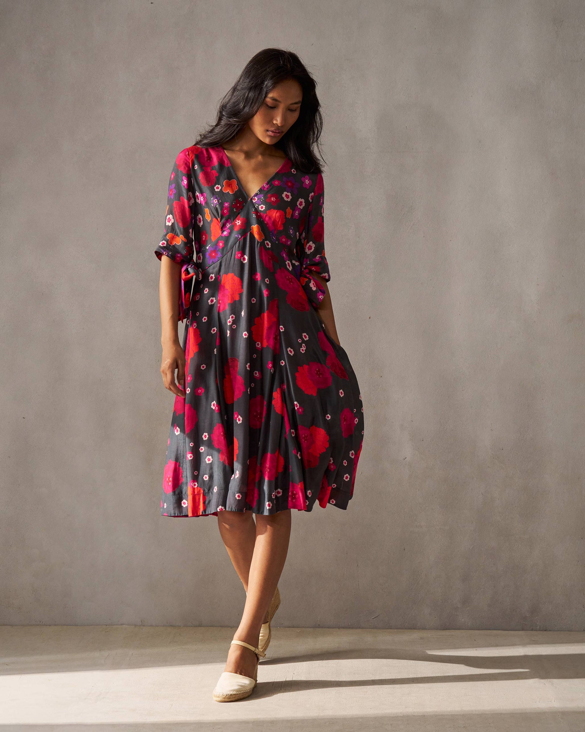 - The dress has different floral prints on different panels, making this piece a head turner.