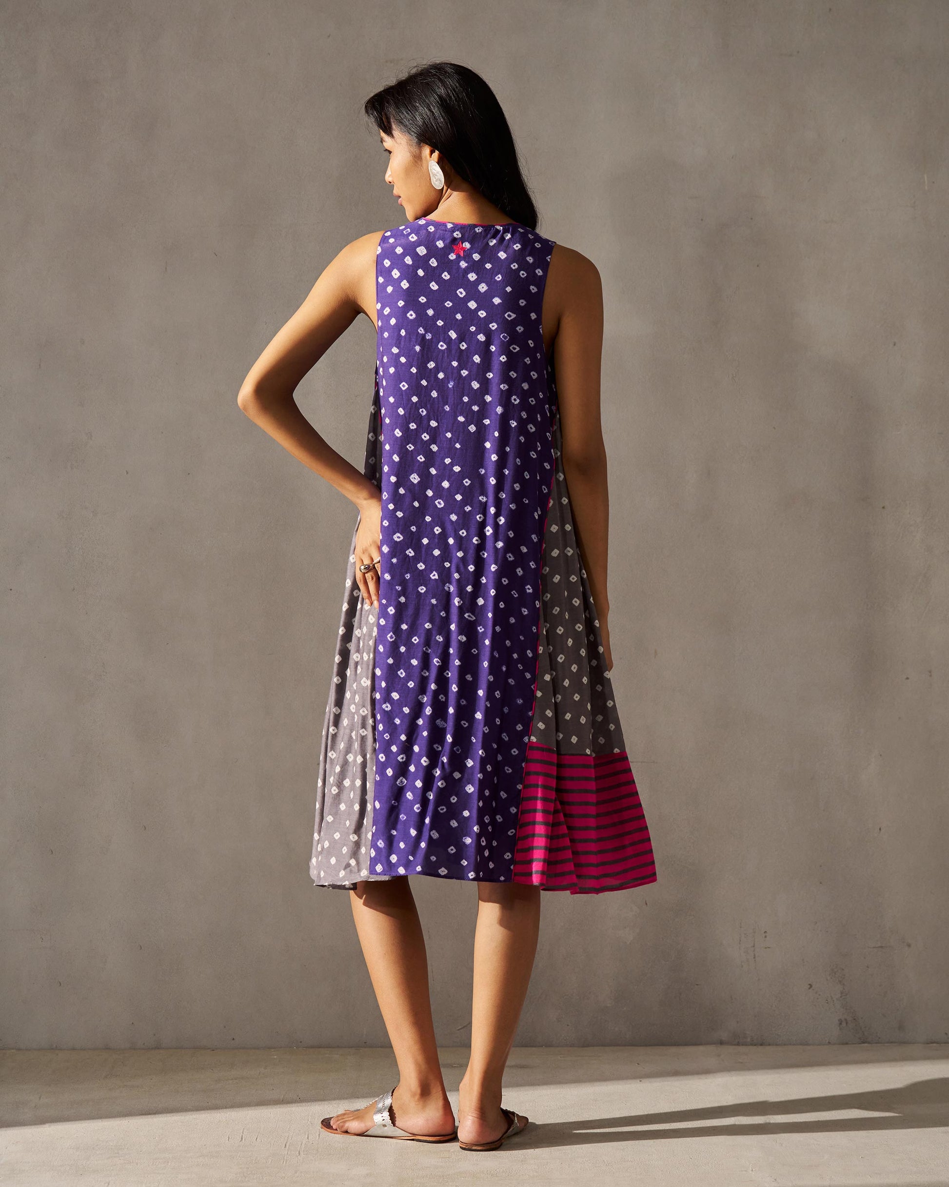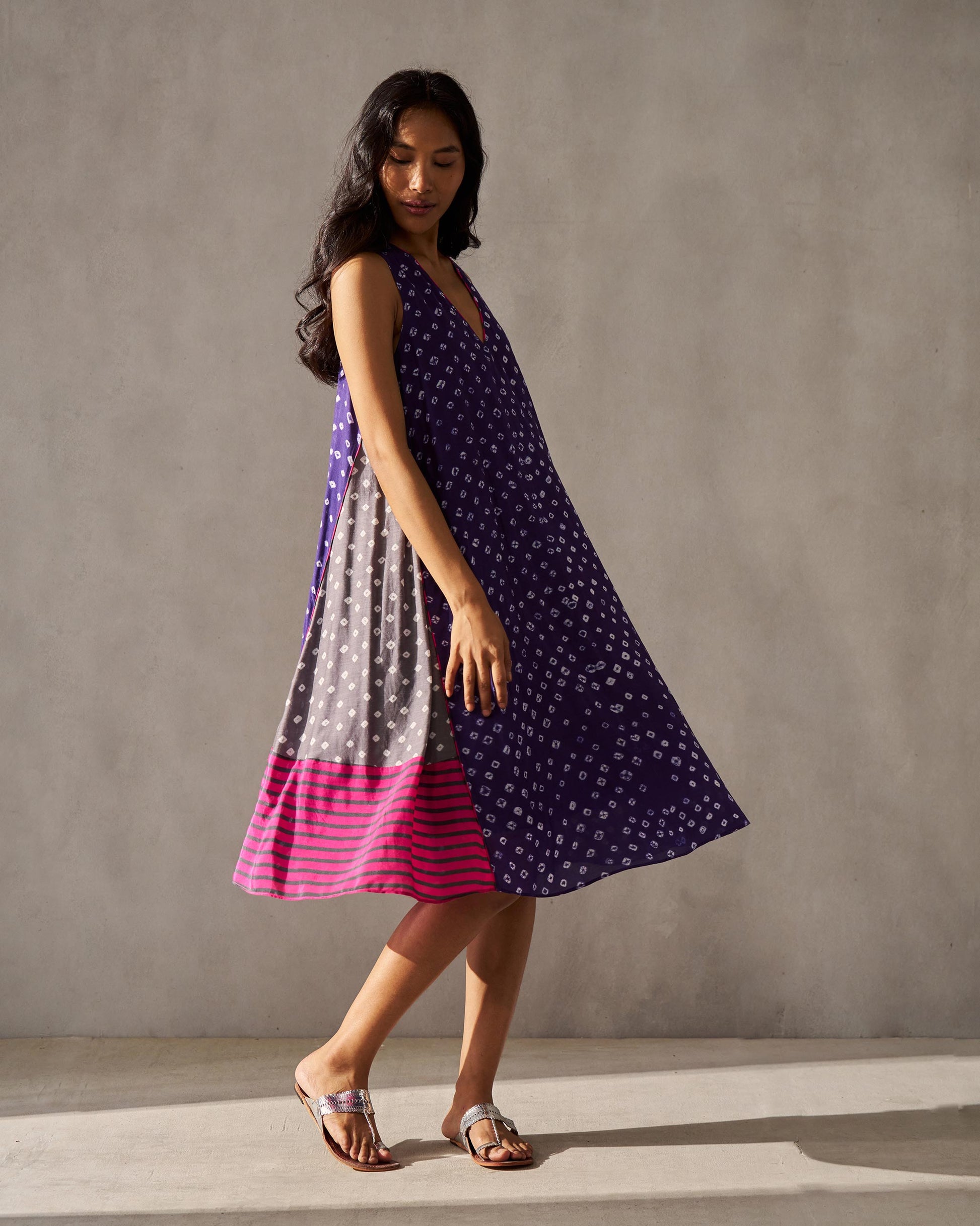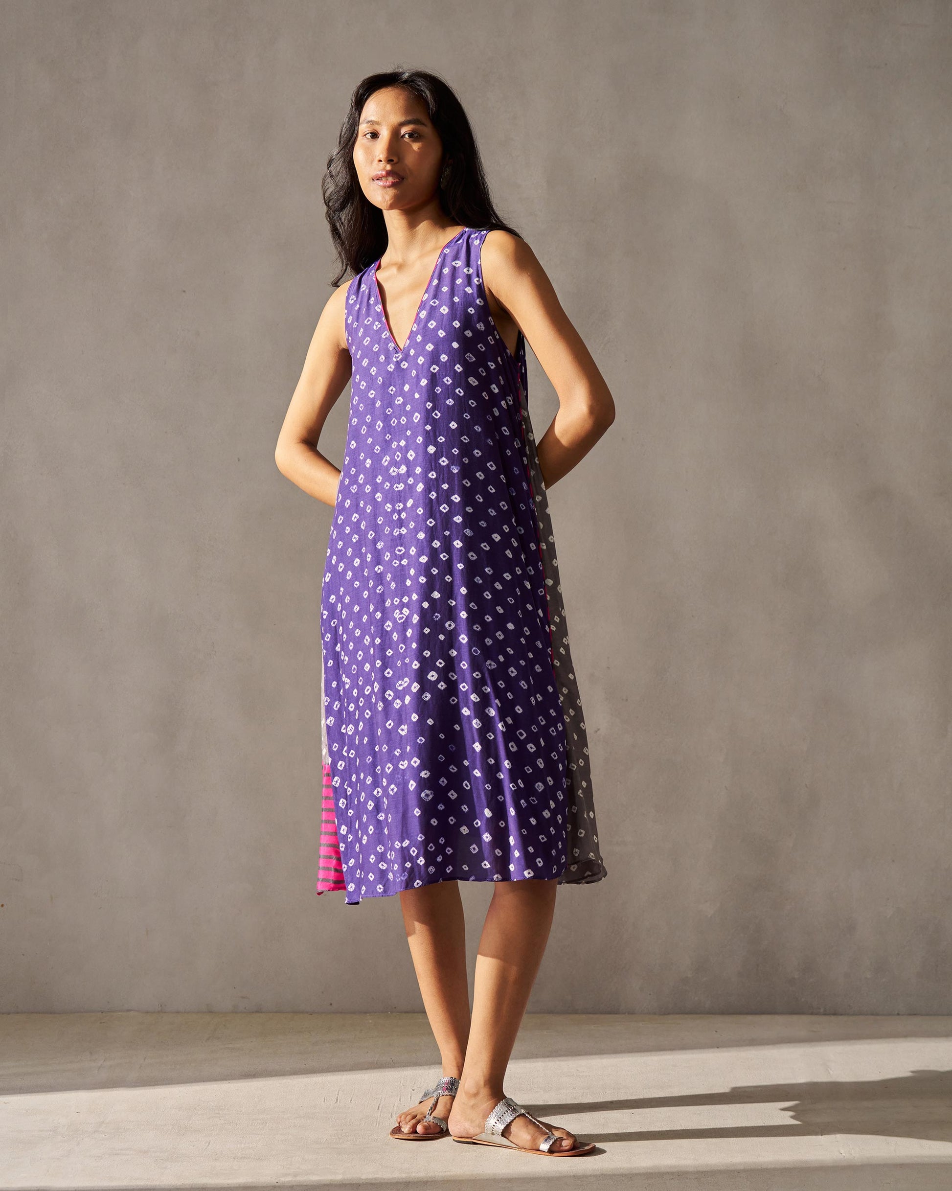 - In soft cupro modal, the Flow Gusset Dress in a purple hue and bandhani print lends itself to all sorts of occasions, making it an easy pick for special moments and your everyday alike.