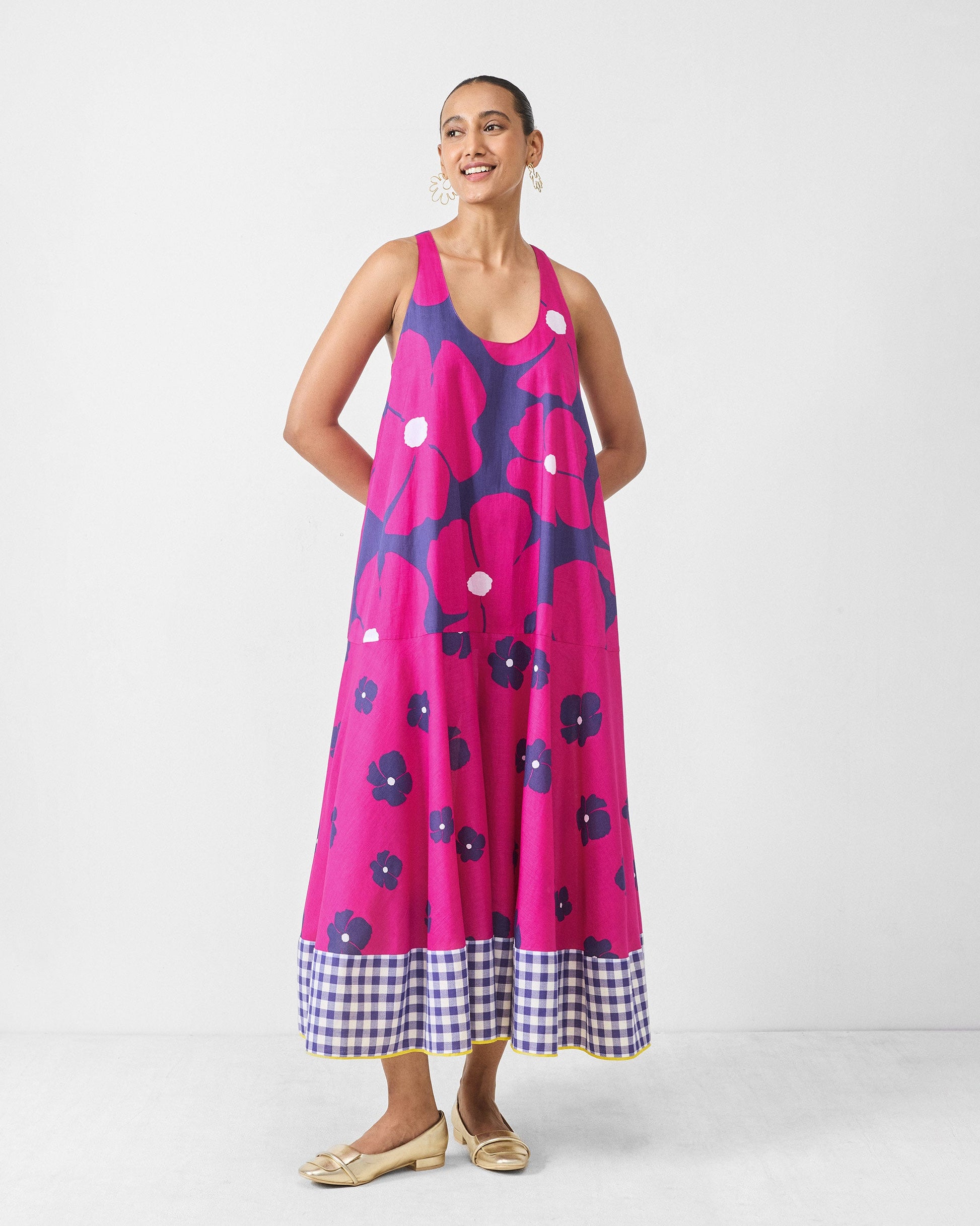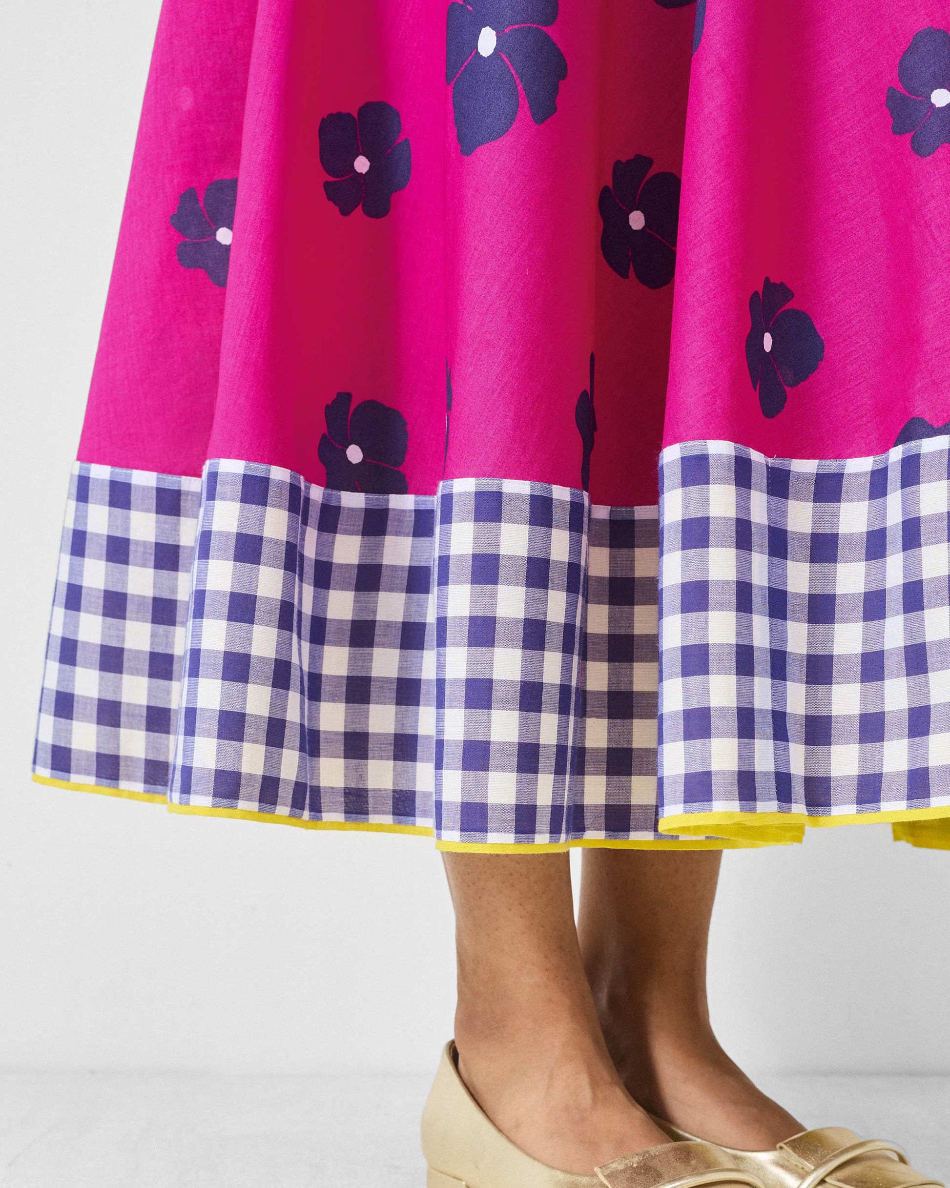 - Cut in an easy A-line silhouette, it features three distinct panels: oversized fuchsia poppies on purple, medium purple blooms on a vibrant fuchsia base and 100% yarn-dyed cotton with purple and white uneven checks, finished with extended piping in solid chartreuse yarn-dyed cotton.