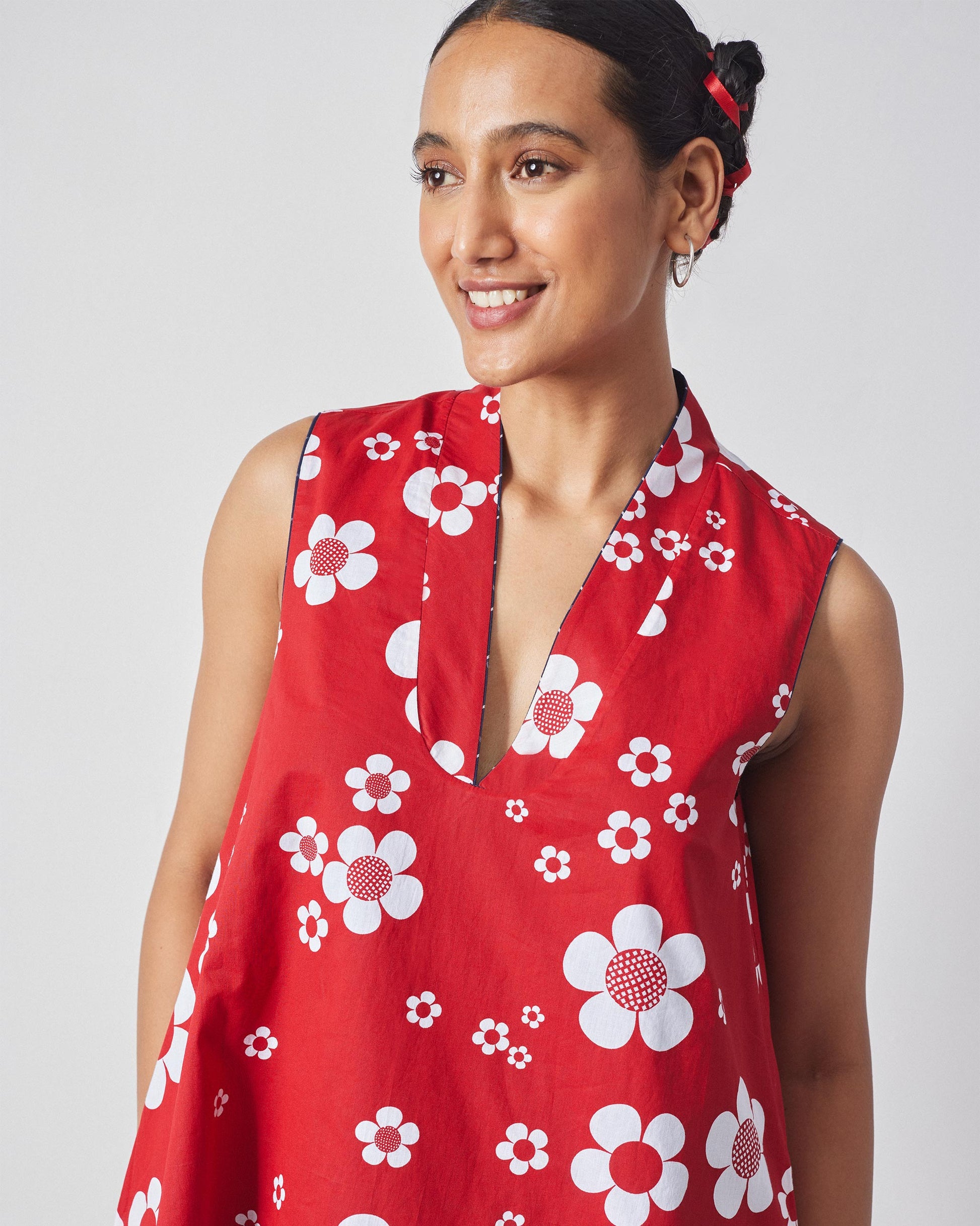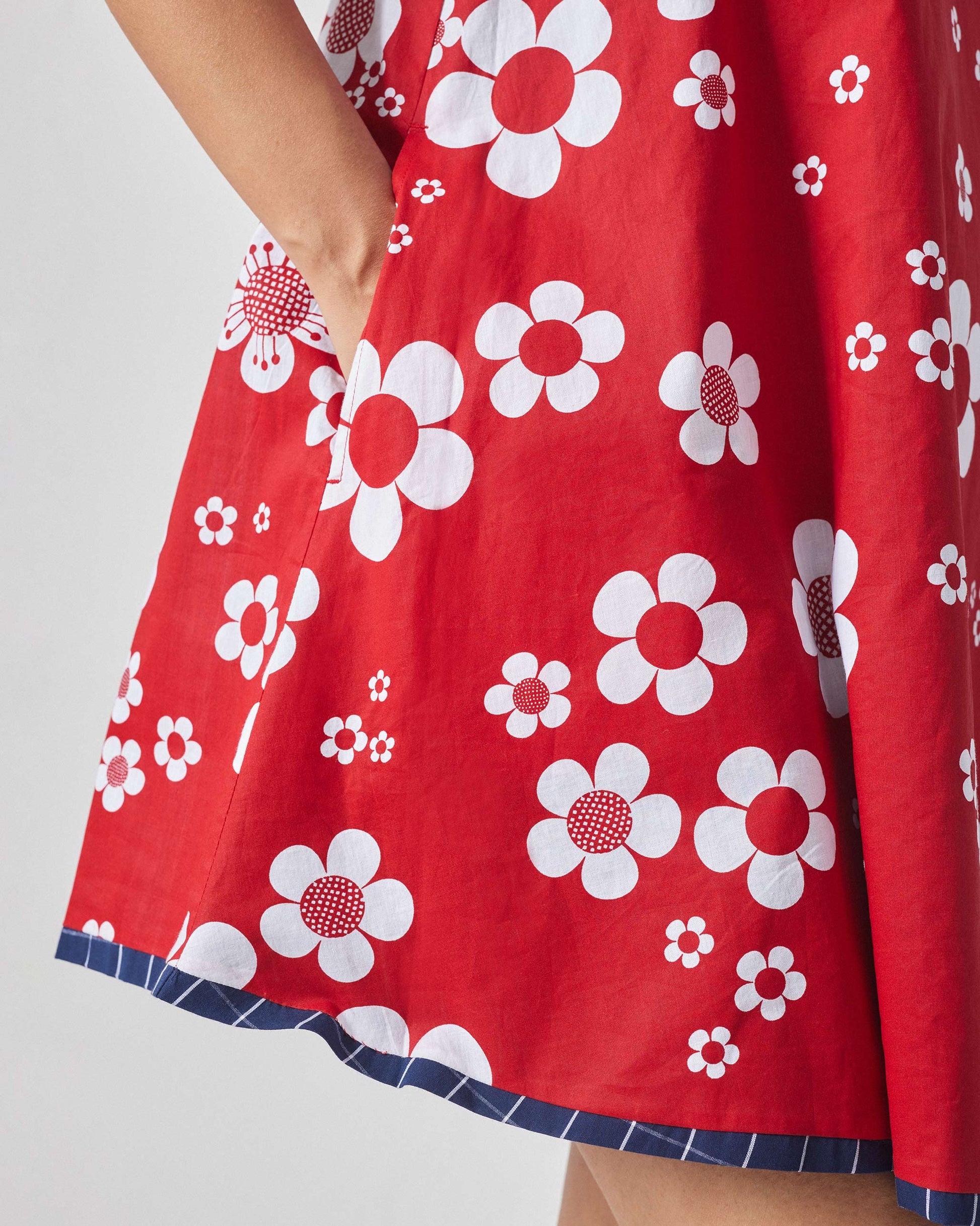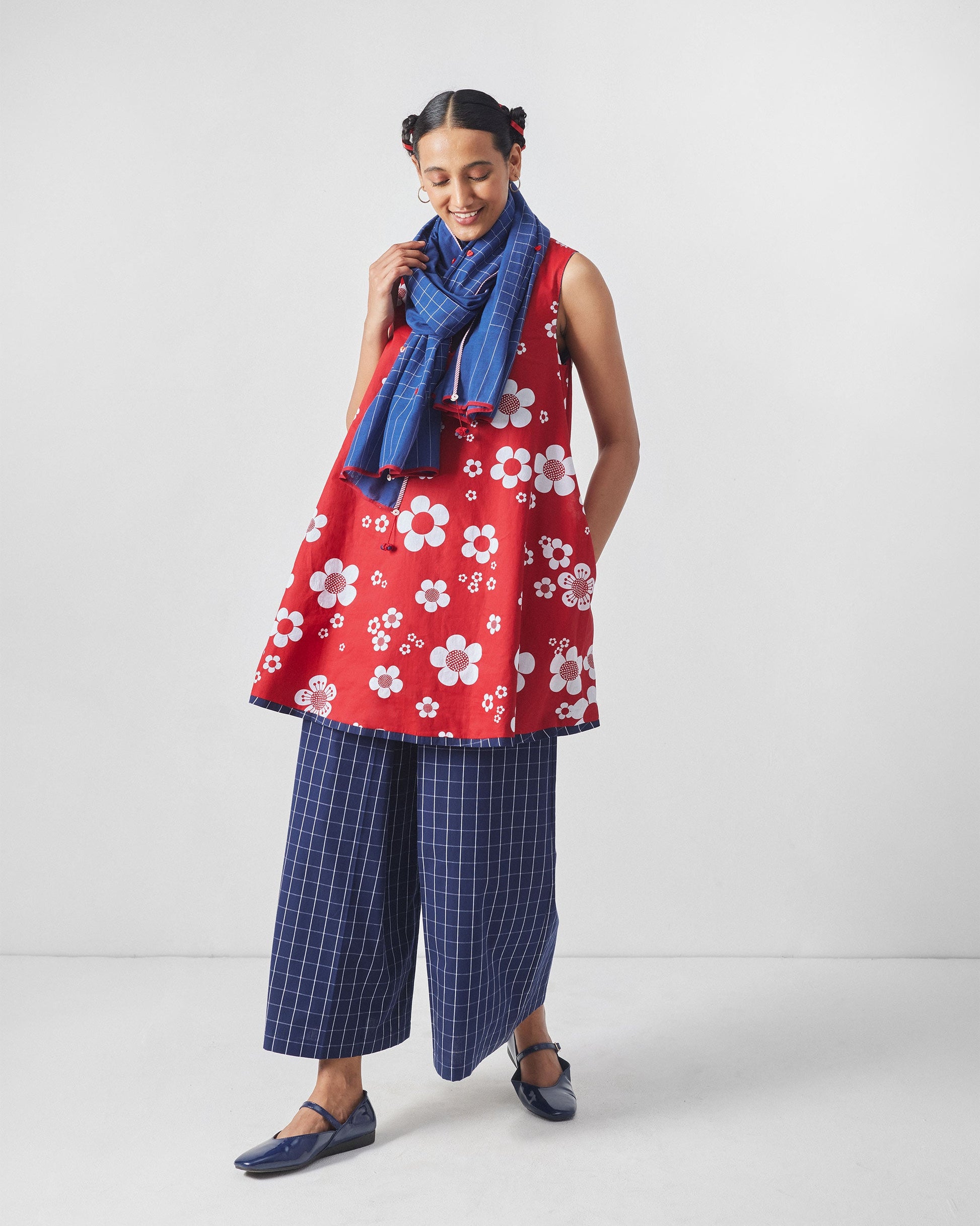- One side features navy and white checks with a red appliqu¨¦ flower near the hem; flip it over for a cherry blossom print in bold red, where oversized Sakura blooms take centre stage.
