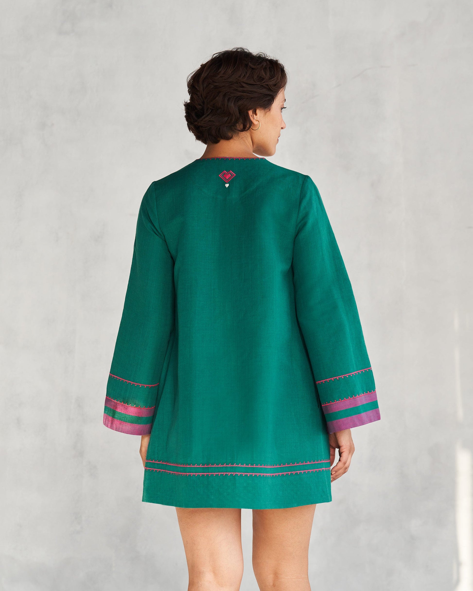 - Discover beautiful embroidery details including geometric hearts in berry and ivory, a moonpatch with a heart, and intricate designs adorning the neckline, sleeves, hem, and edges.