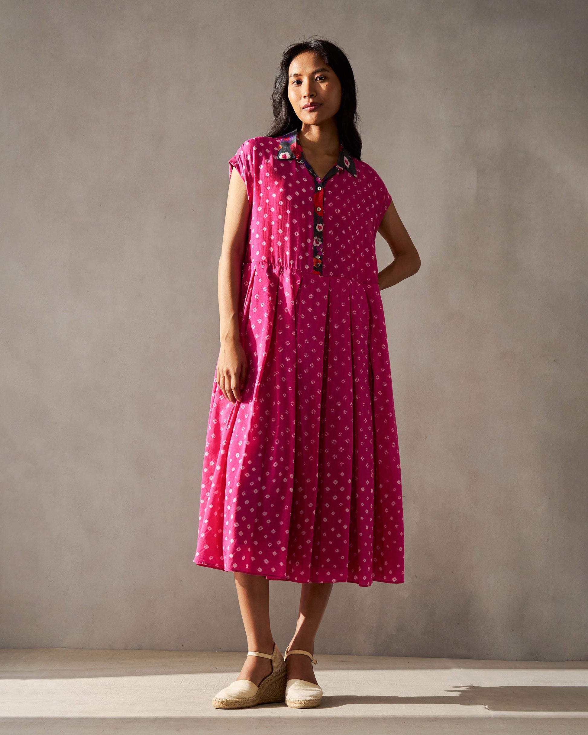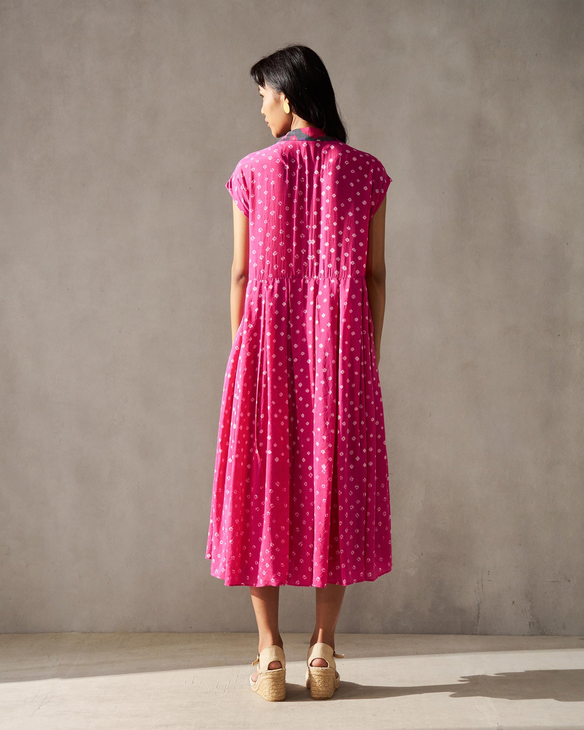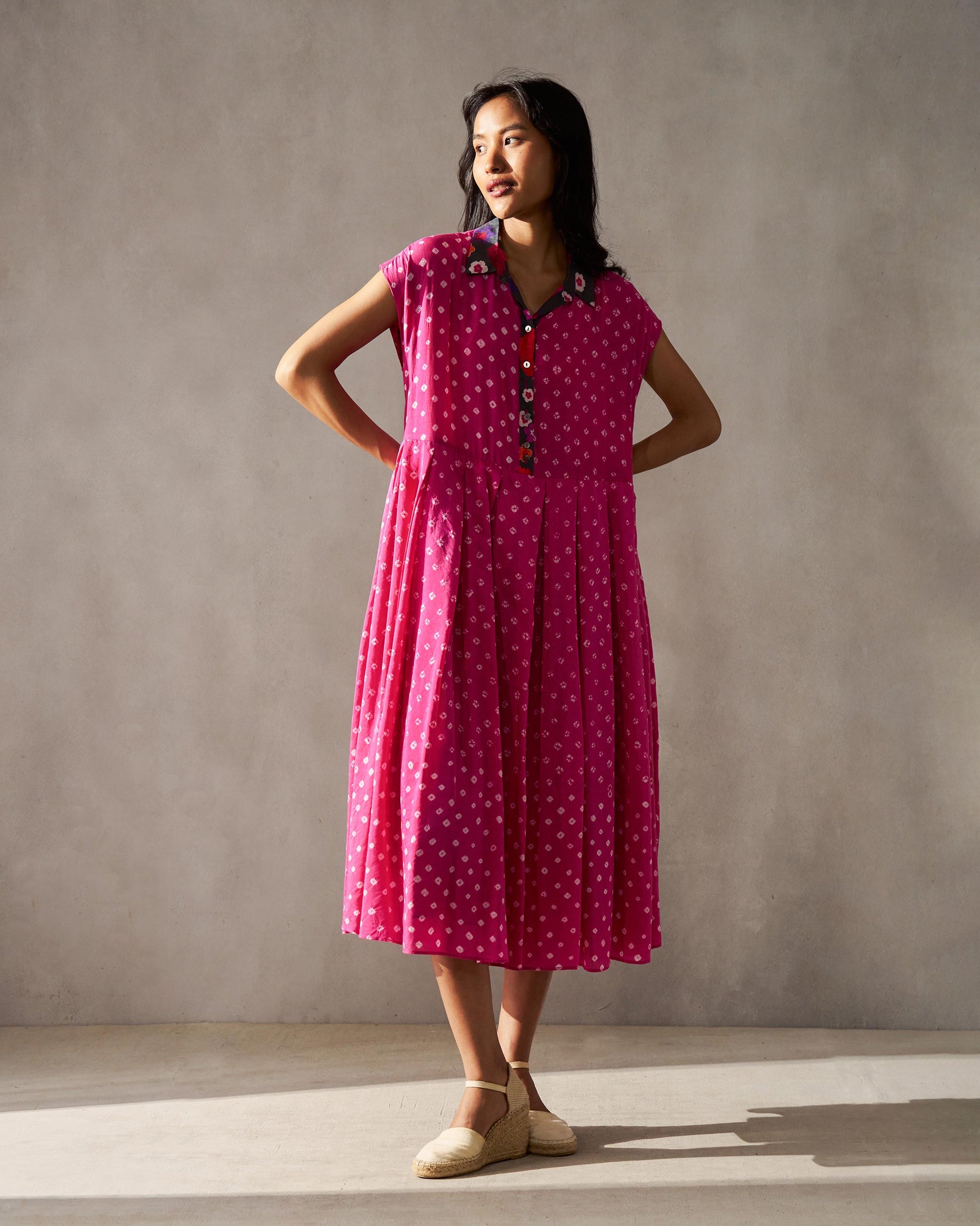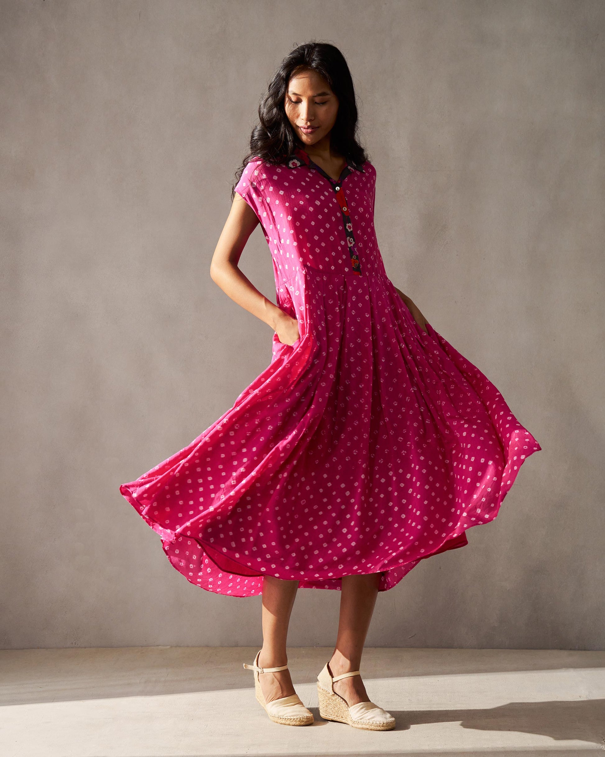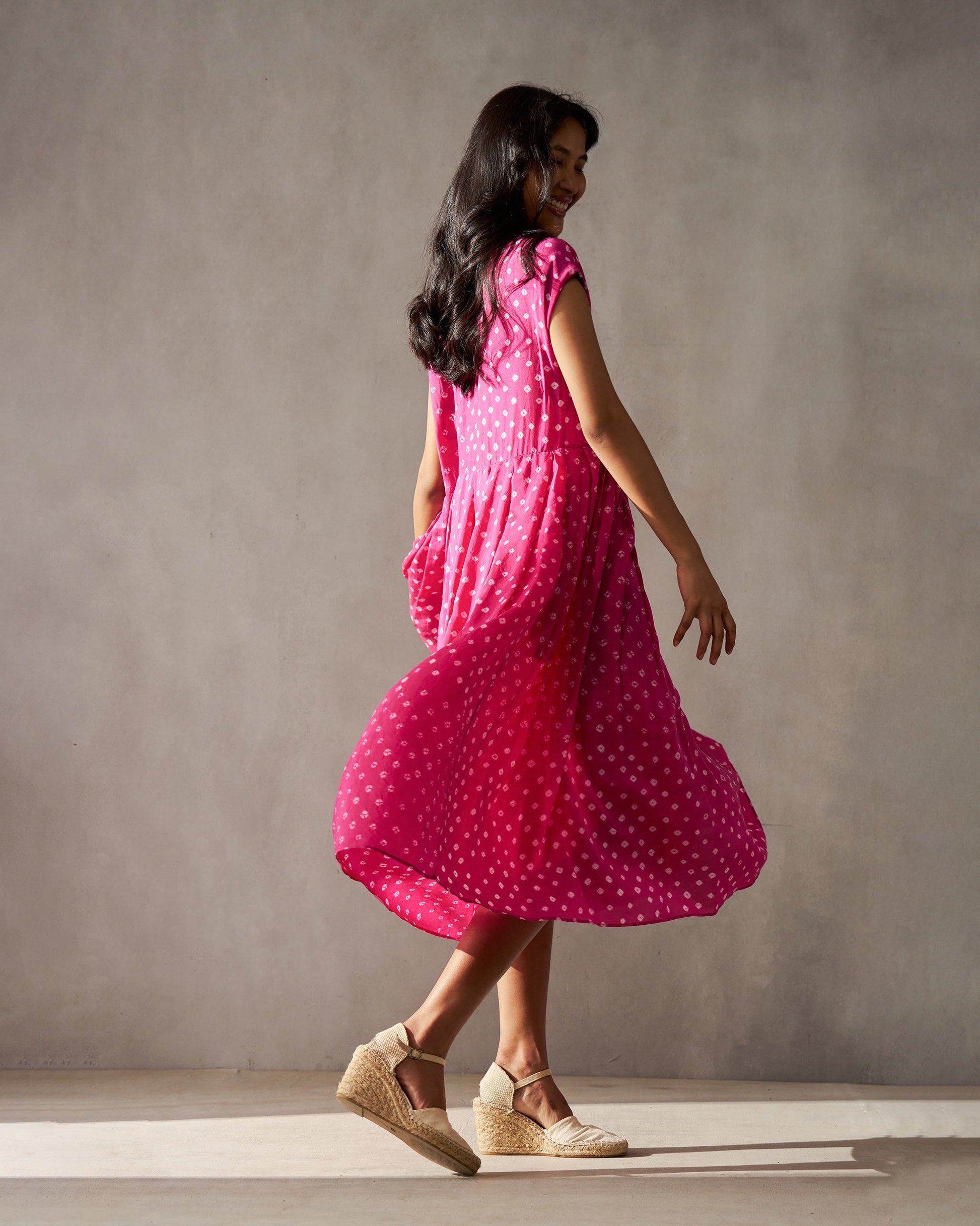 - The Midsummer Dress in bright fuchsia and bandhani print lends itself to all sorts of occasions, making it an easy pick for special moments and your everyday alike.