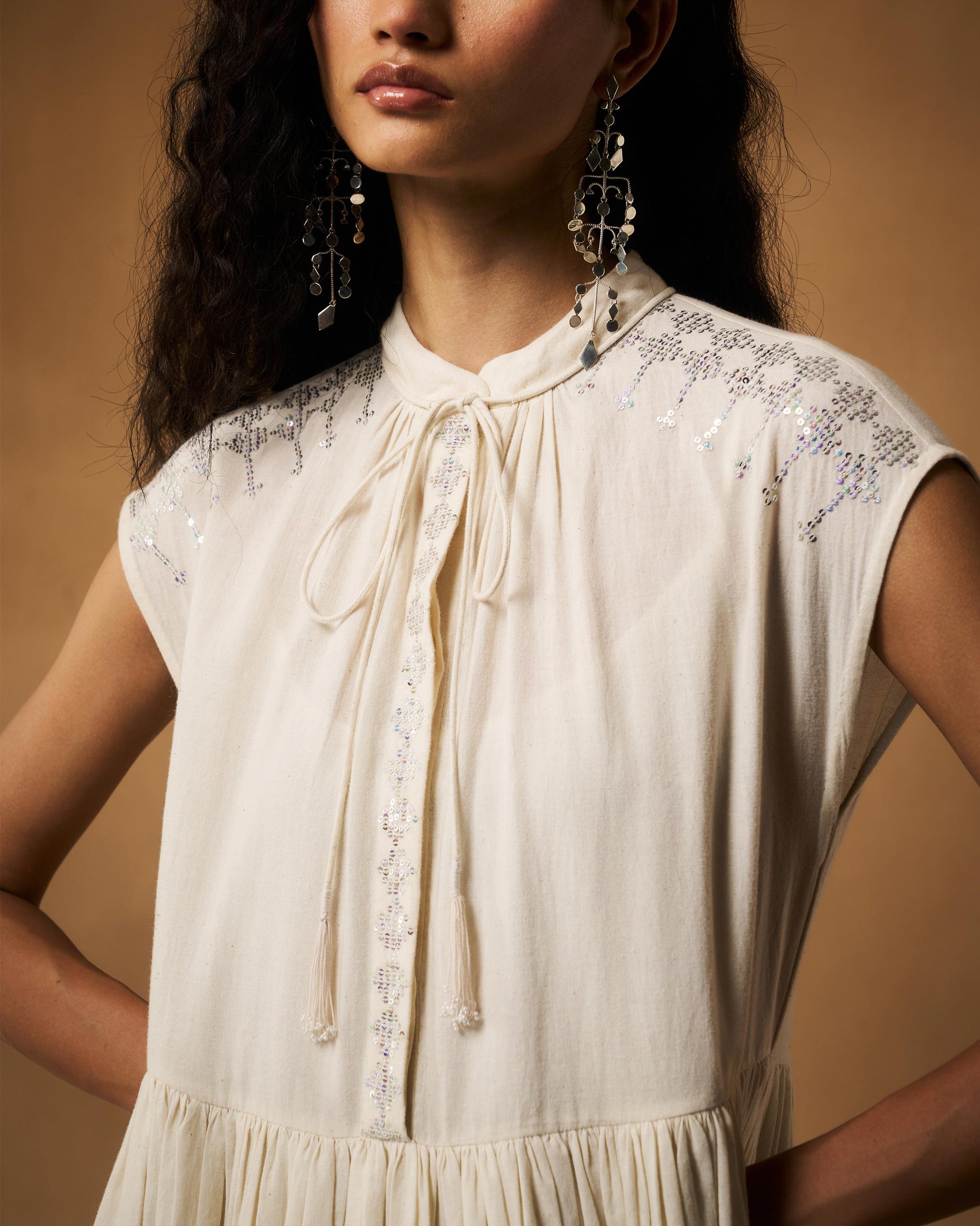 - A dreamy collection infused with heritage and opulence, the Mina Dress is a sheer delight in ivory with hand embroidered sequins, complete with an accompanying slip.