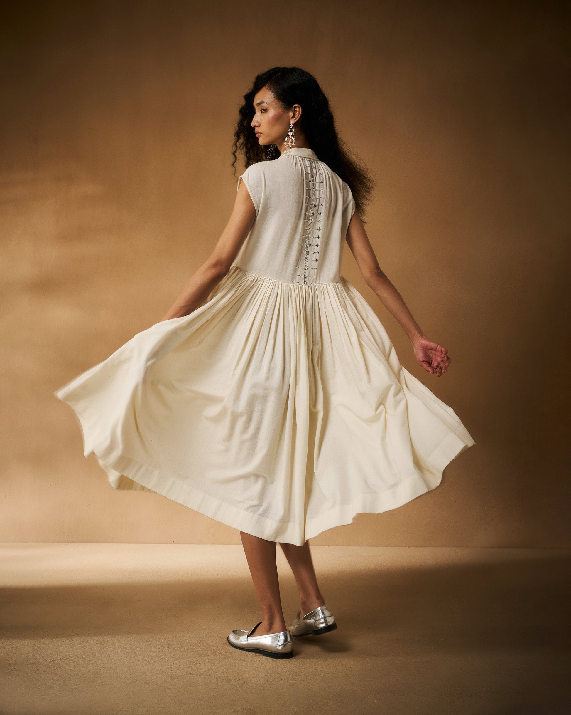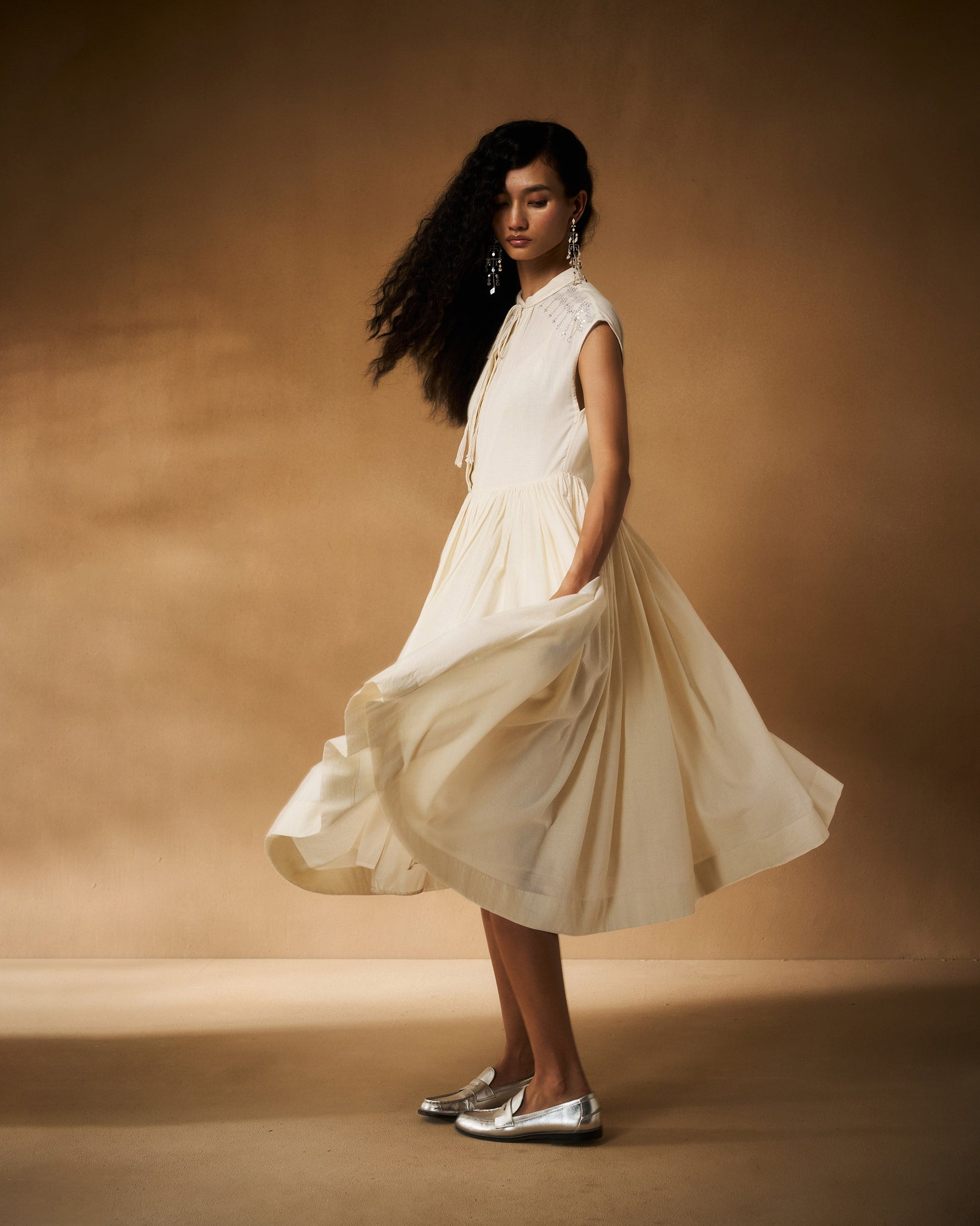 - The dress floats lighter than air, crafted in soft handwoven cotton.