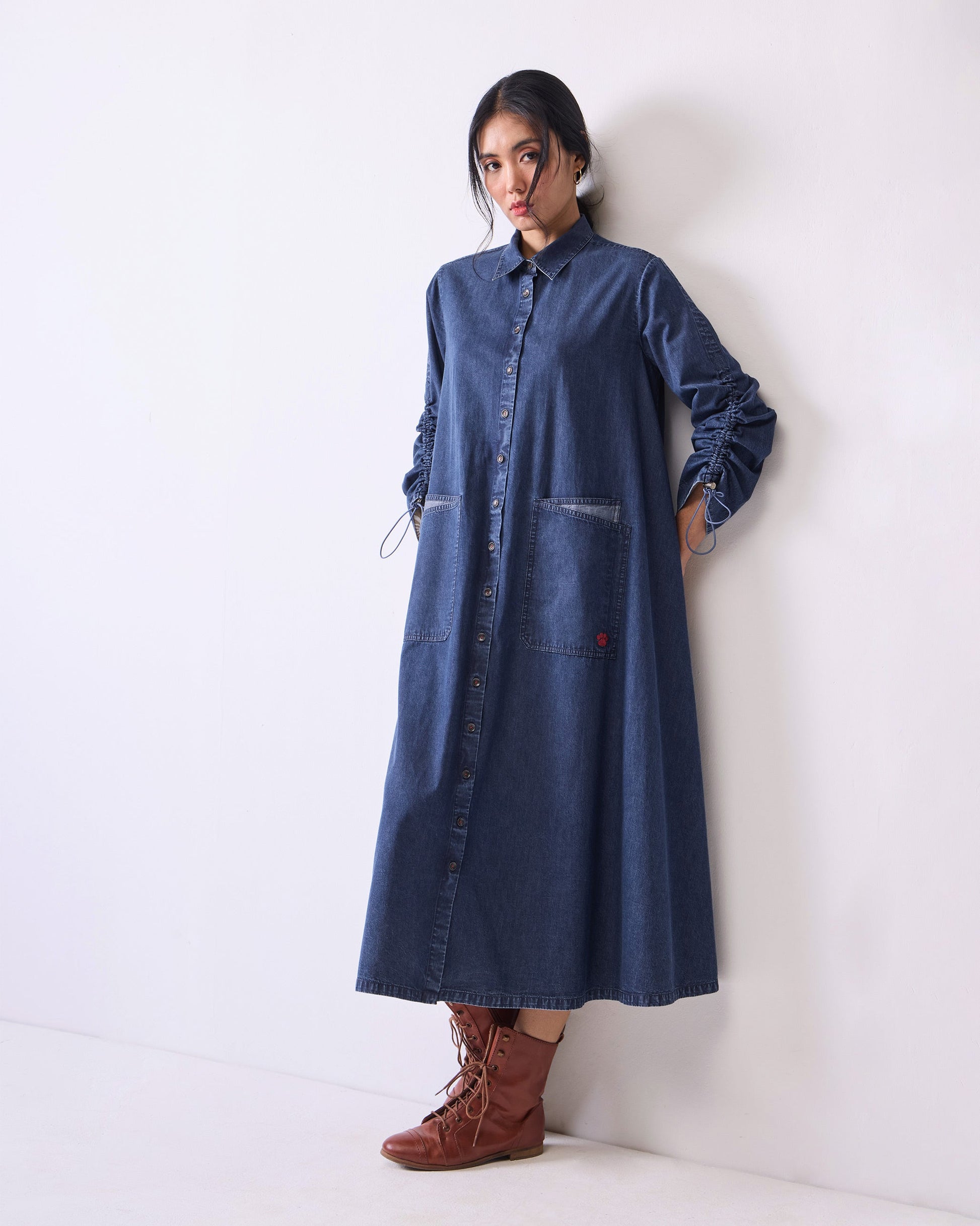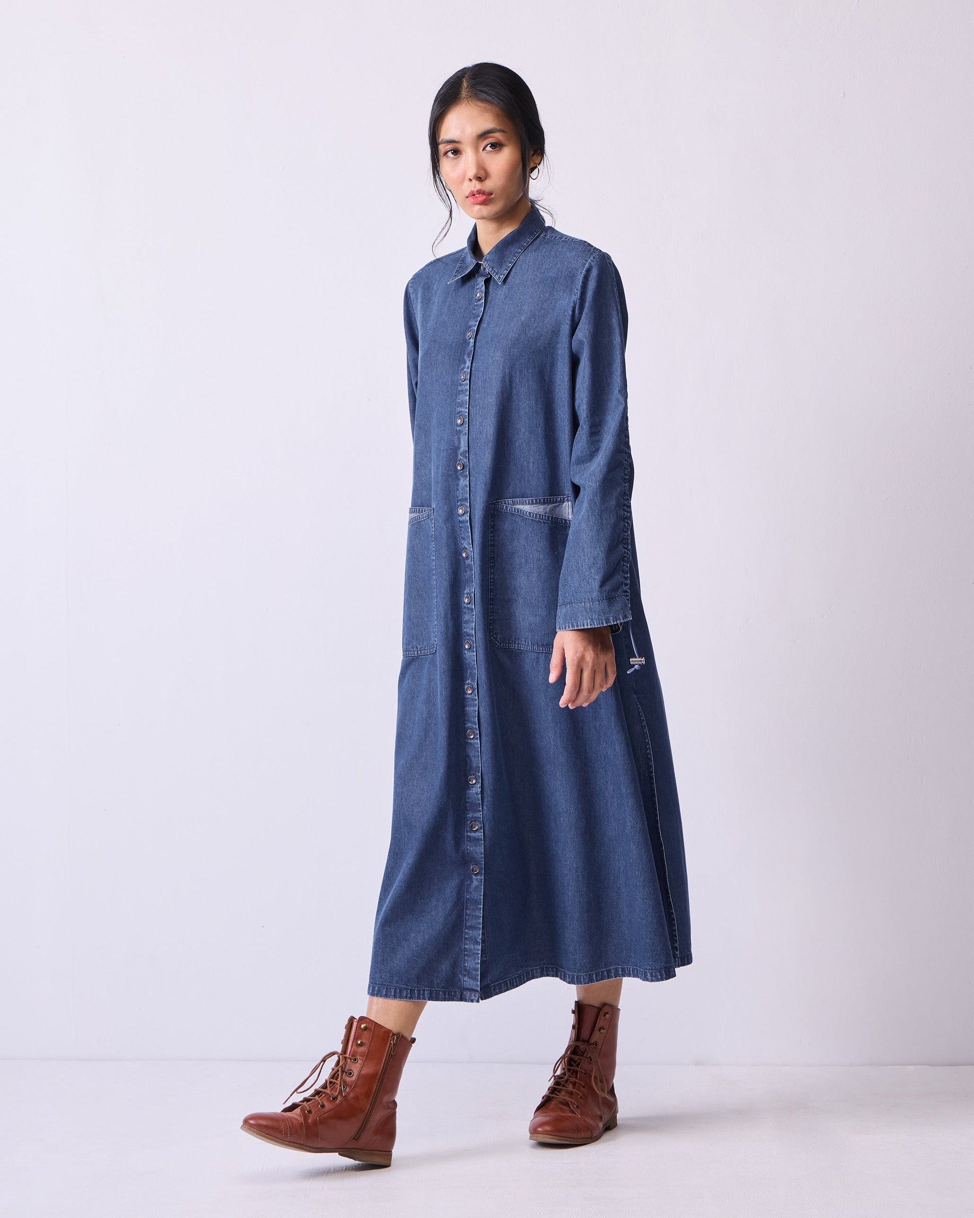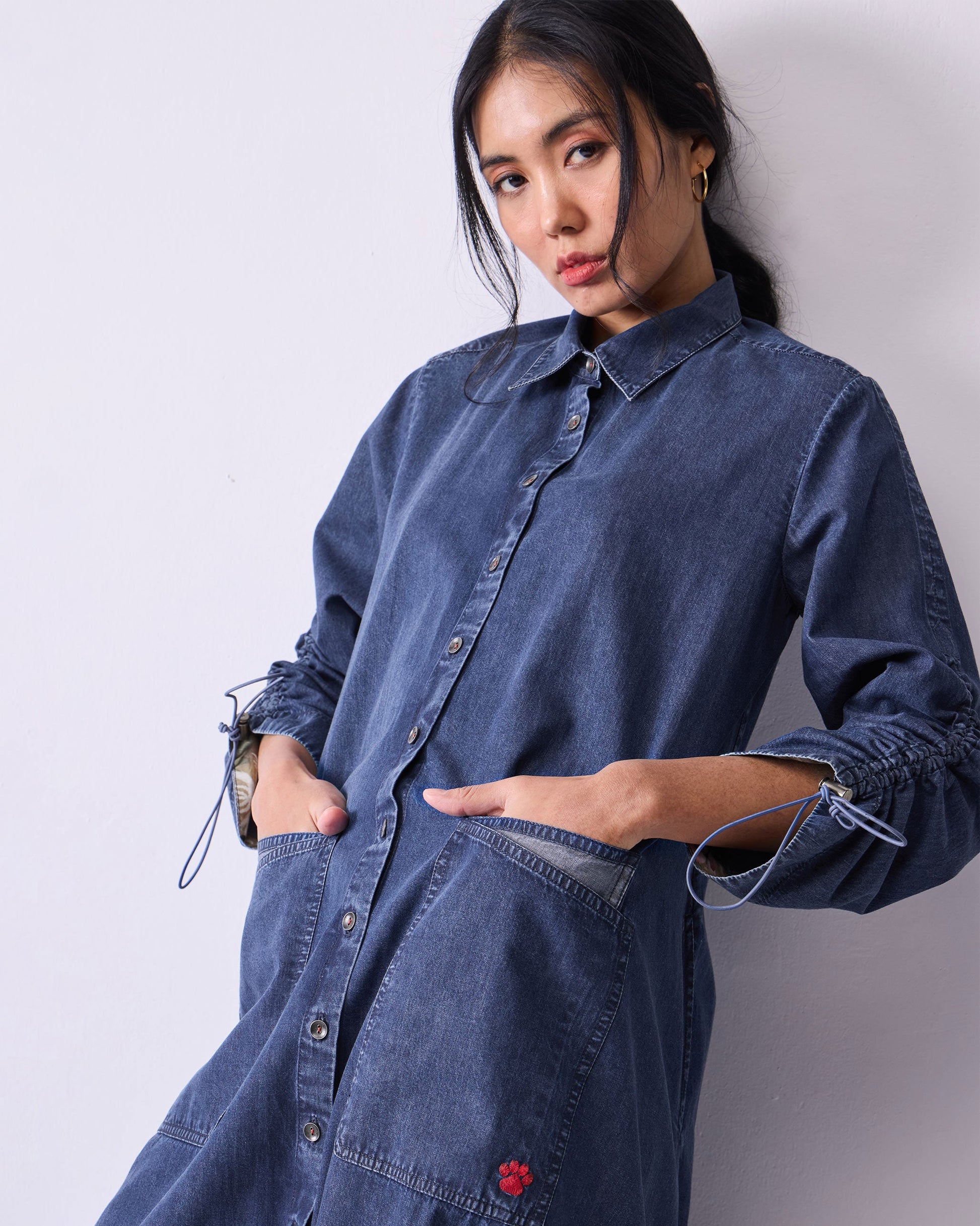 - The Pocket Dress in Denim is crafted from 100% cotton denim in a classic blue shade, offering both comfort and style.