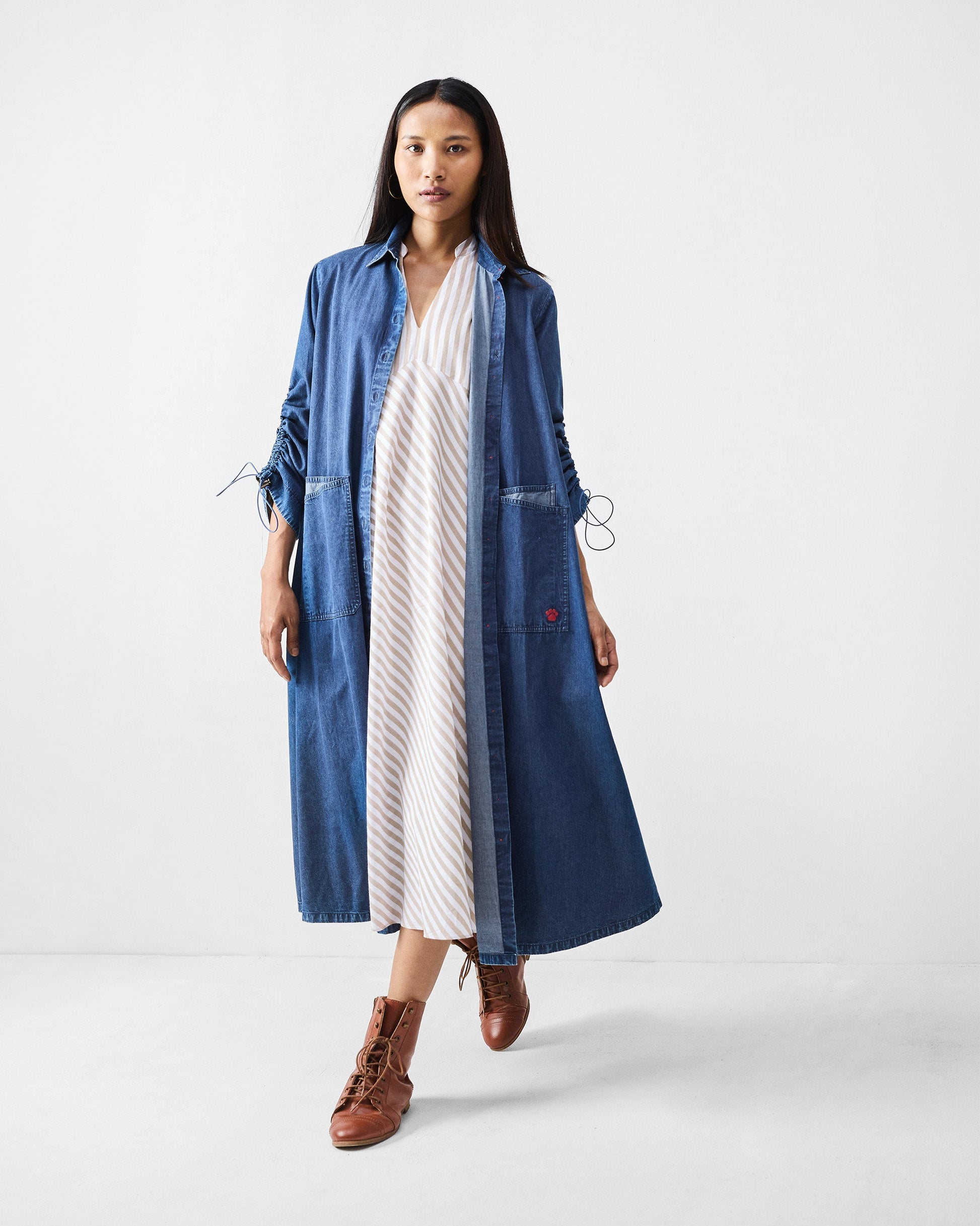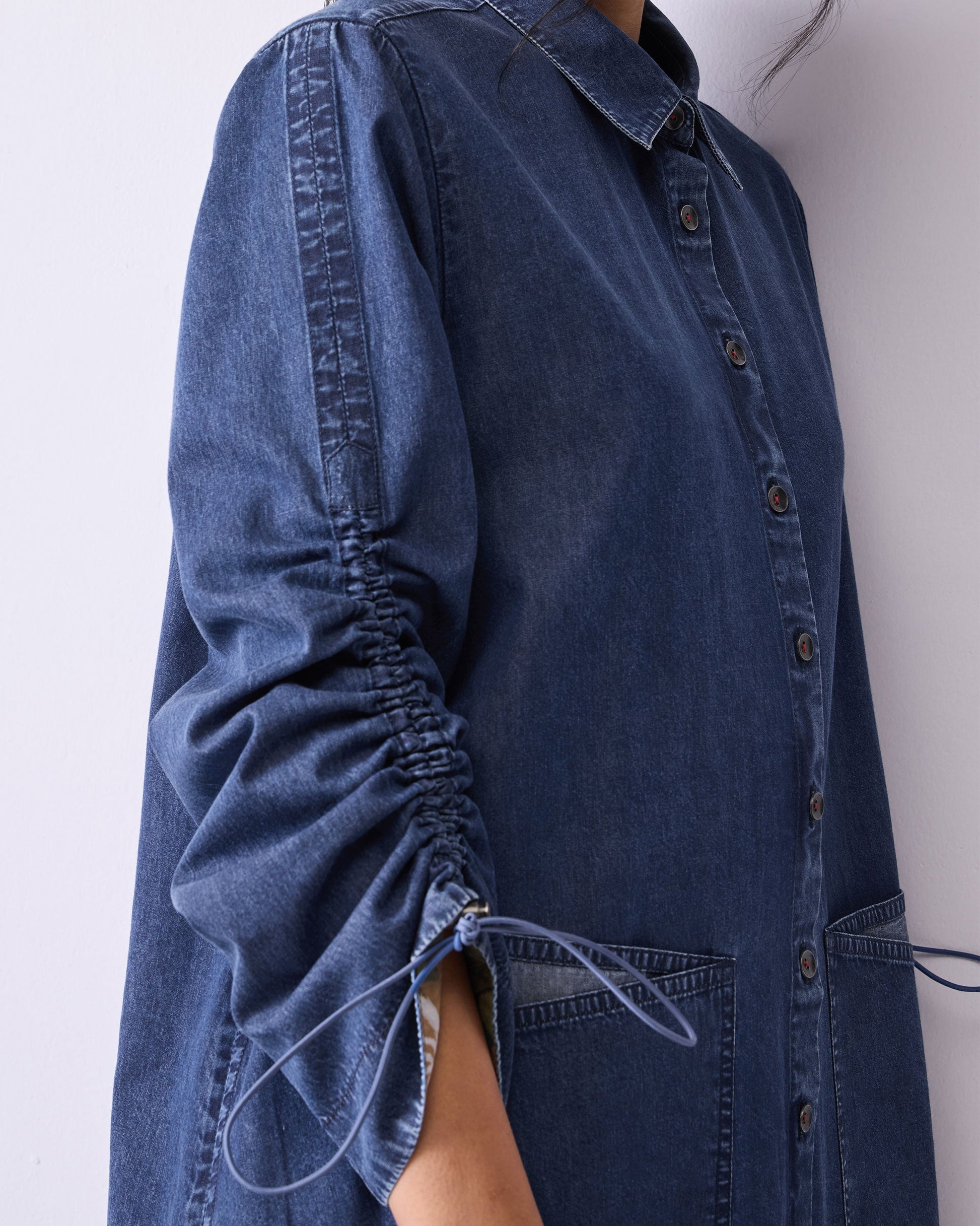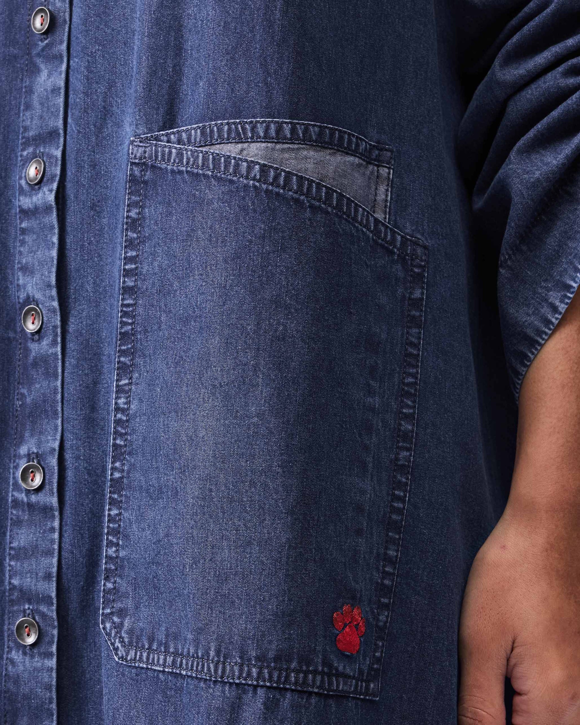 - The Pocket Dress in Denim is crafted from 100% cotton denim in a classic blue shade, offering both comfort and style.