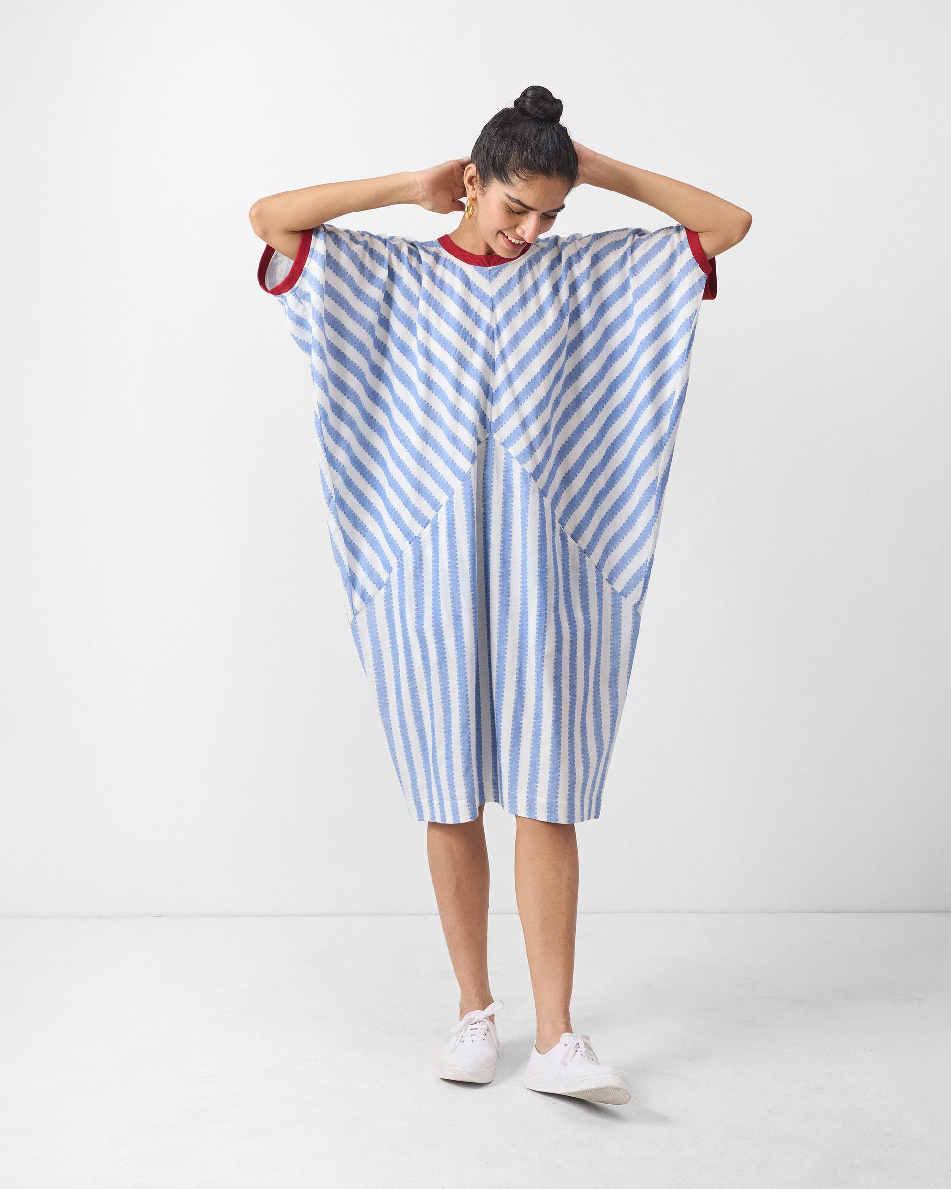 - The Samurai Dress leans into boldness with zigzagging blue-and-white stripes and striking red trims at the neck and sleeves.