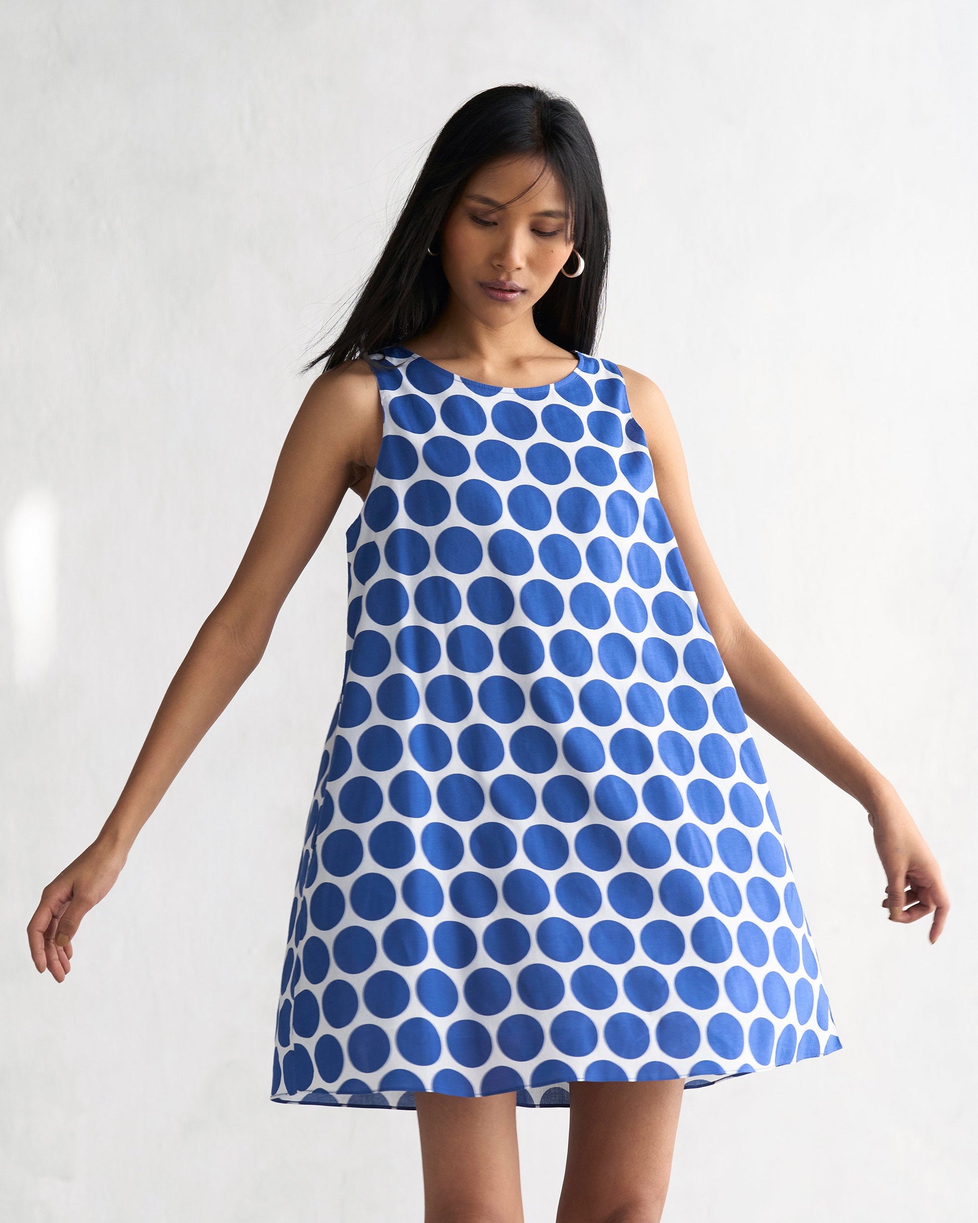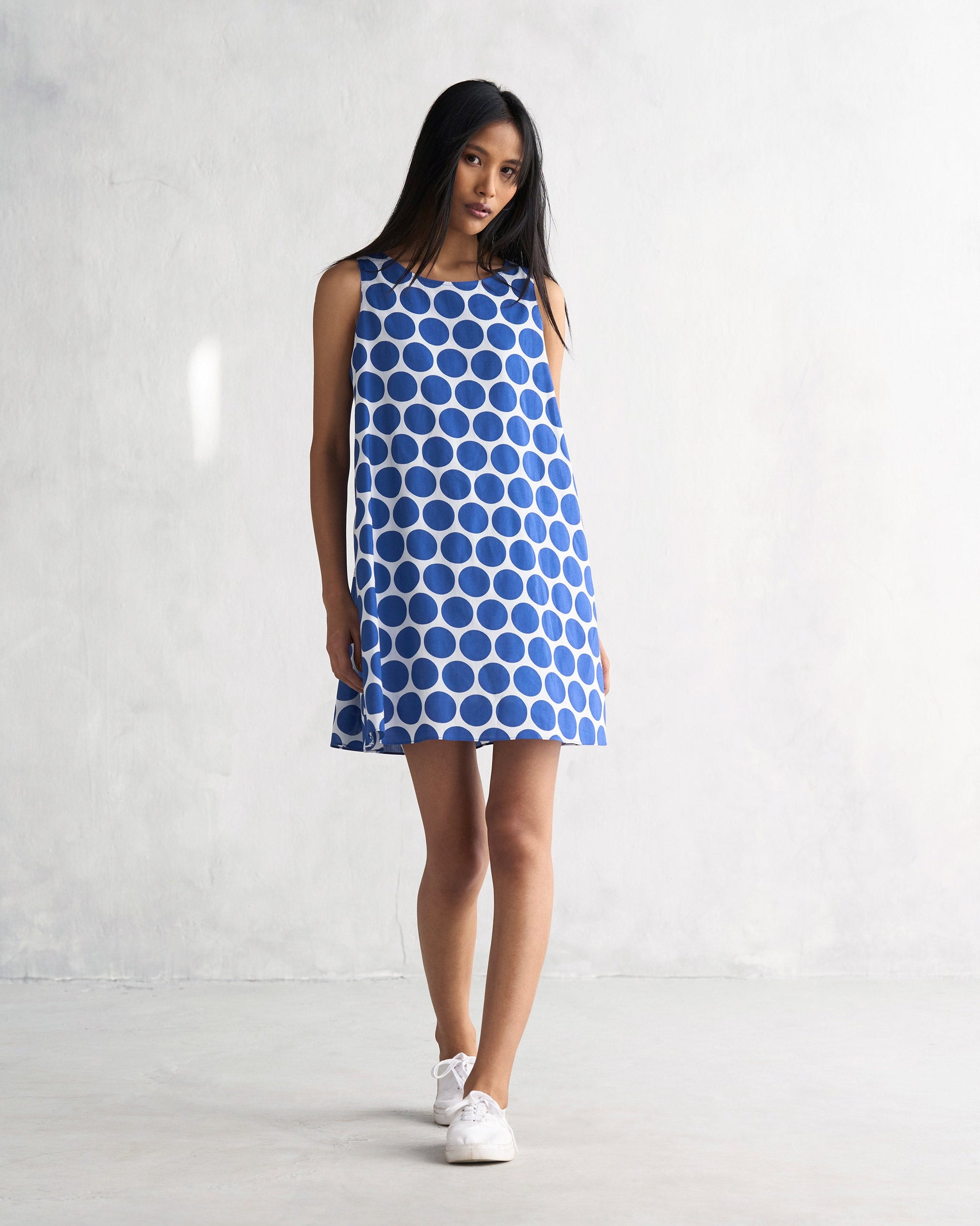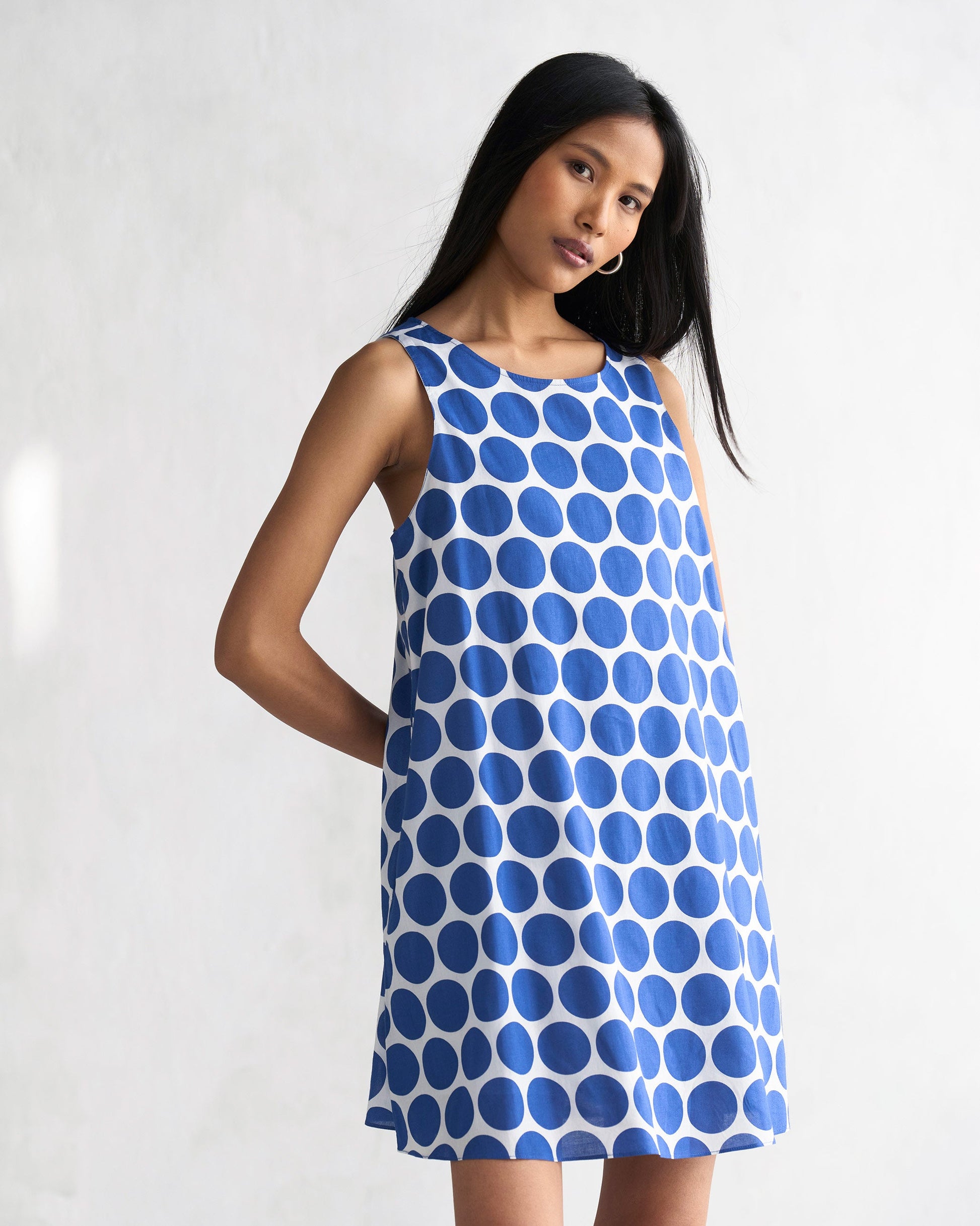 - Sweet polkas from paradise make their way into the Short Racerback Dress in a classic palette of navy and white. The striking pattern and relaxed fit takes you from dawn to dusk with ease, no matter the occasion.