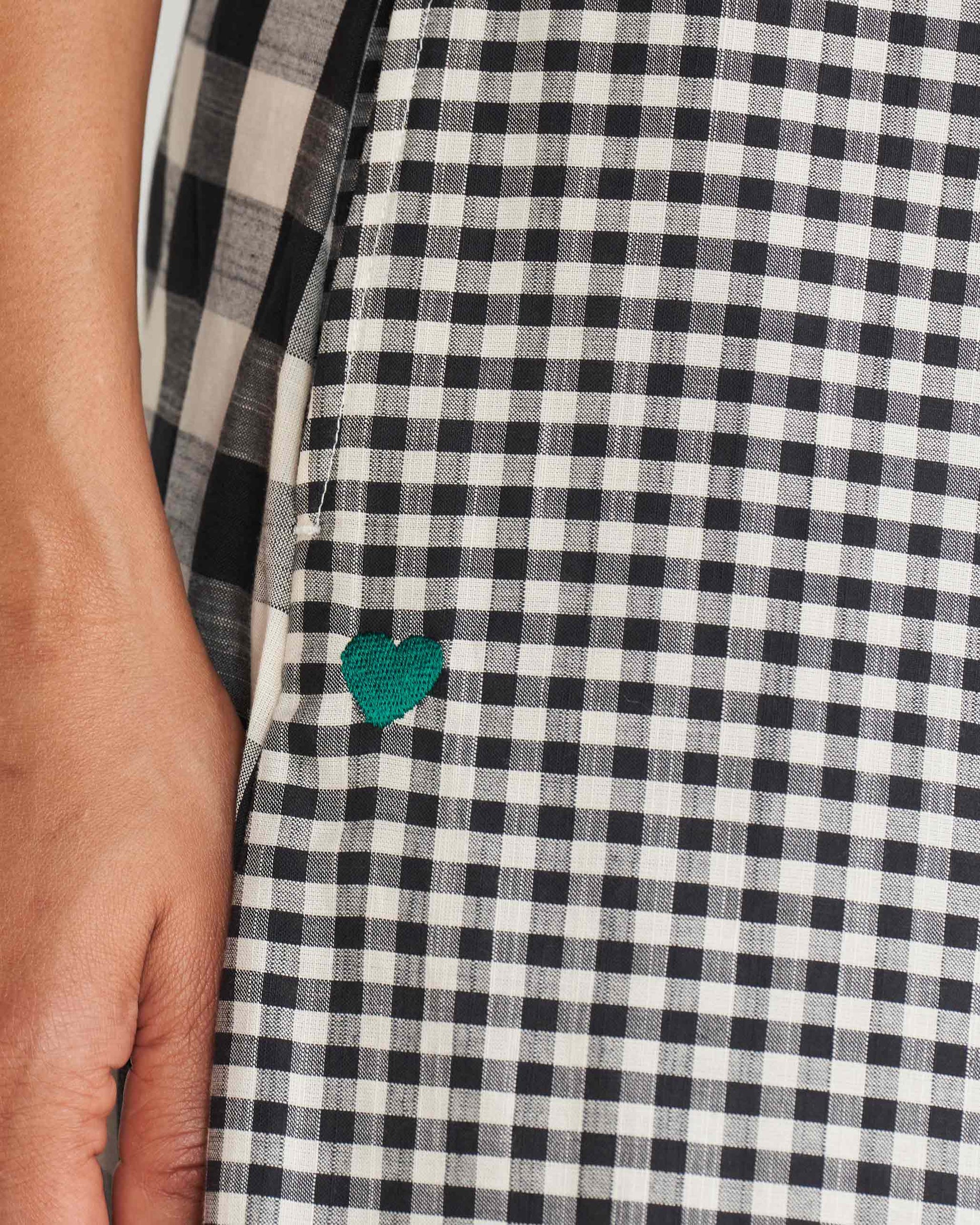 - Discover a delicate green heart embroidery on the pocket, adding a subtle pop of color against the monochrome palette.