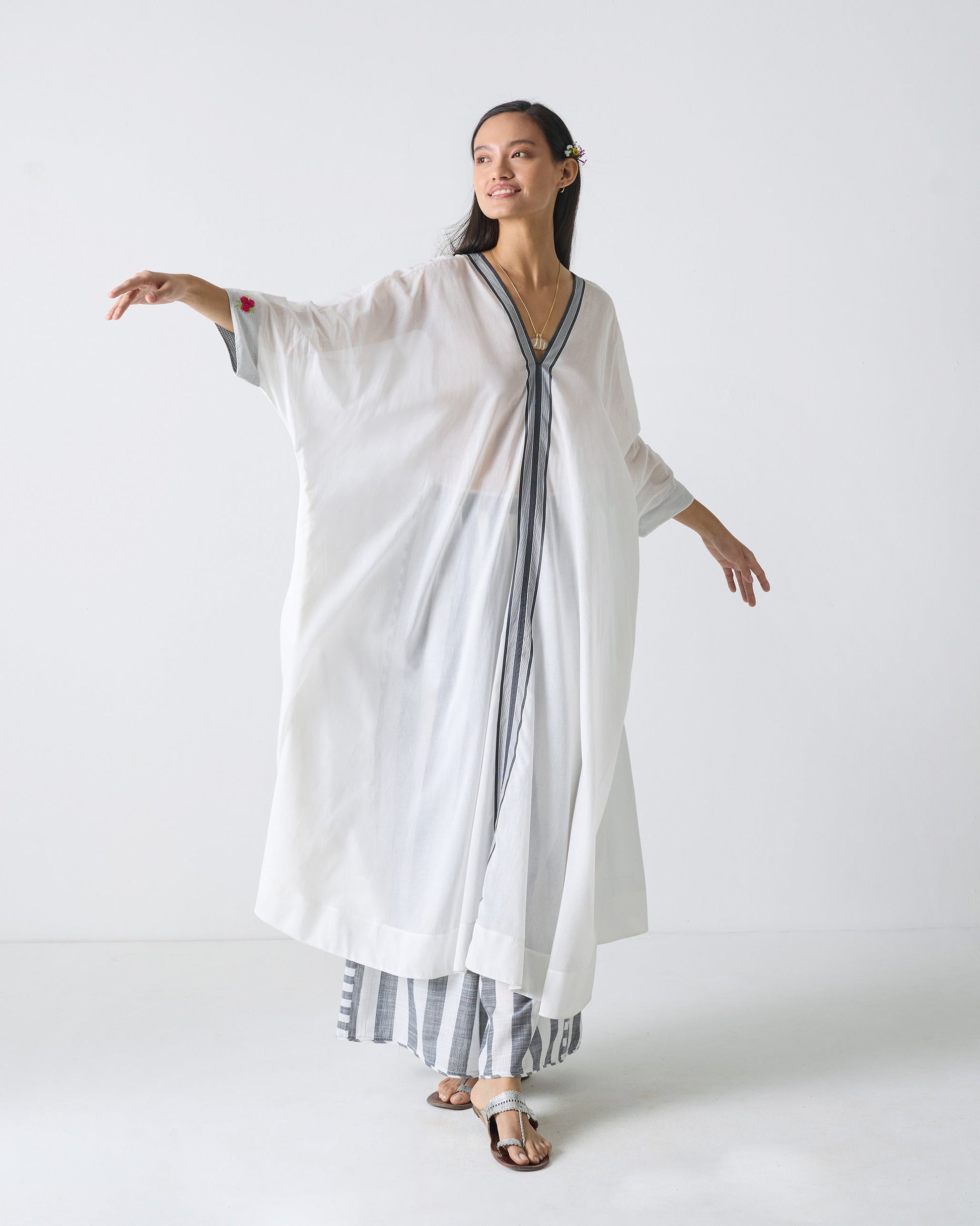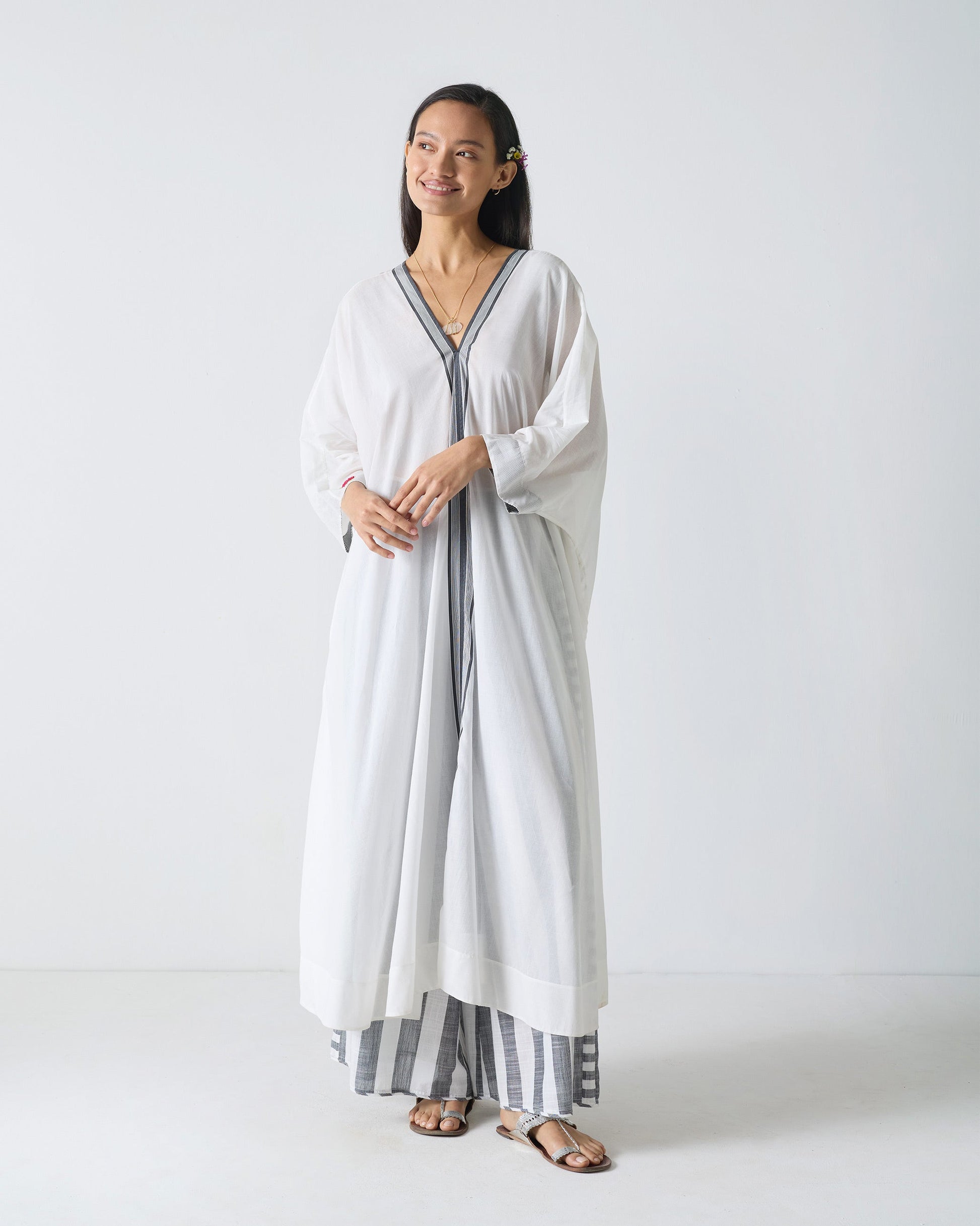 - Whether you're lounging at the beach or at a garden party, Sugato Kaftan¡¯s monochrome palette lets you effortlessly transition from day to night.In soft yarn dyed cotton, this kaftan will leave you feeling light as air.