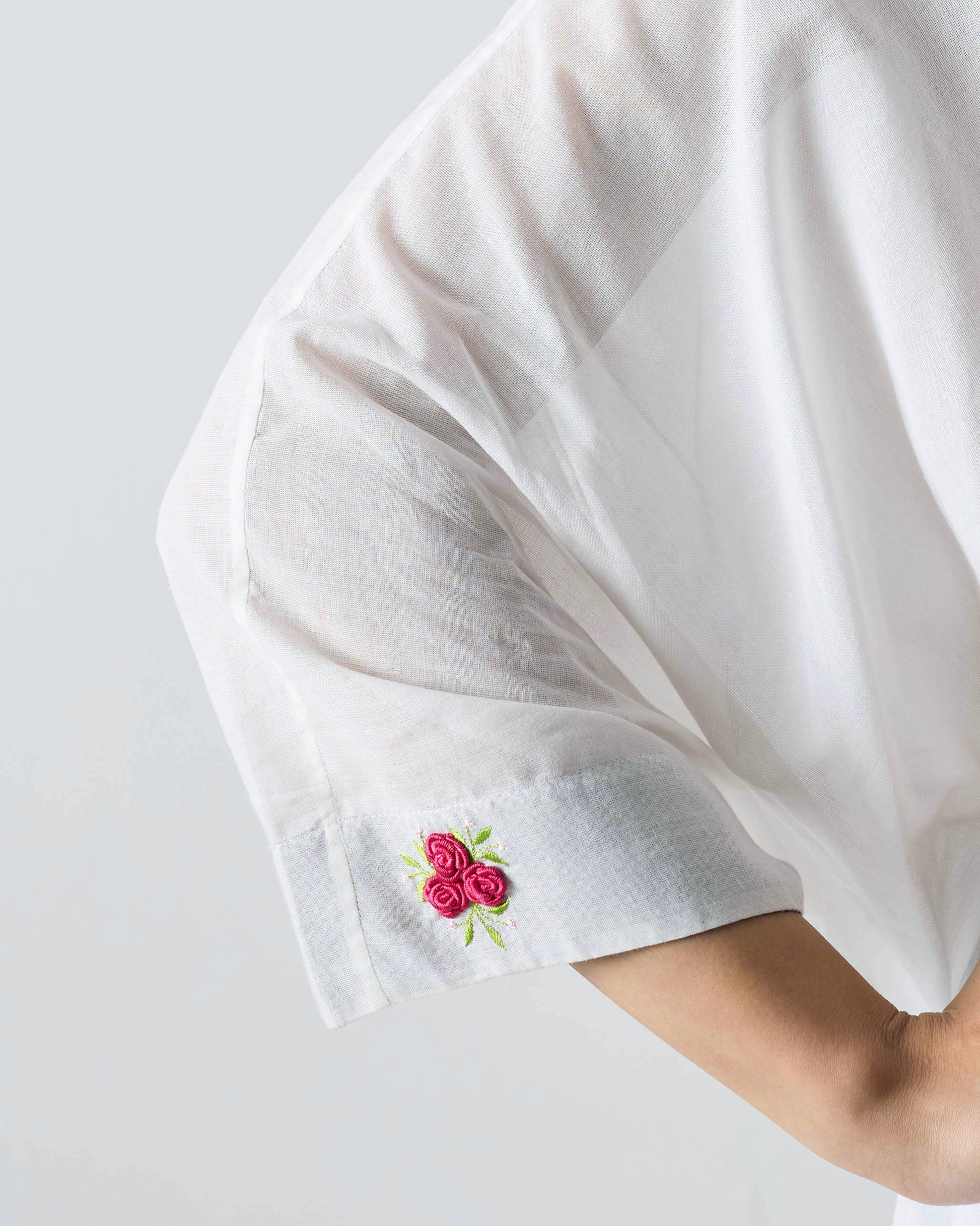 - Find a delicately embroidered bullion rose on the right sleeve.