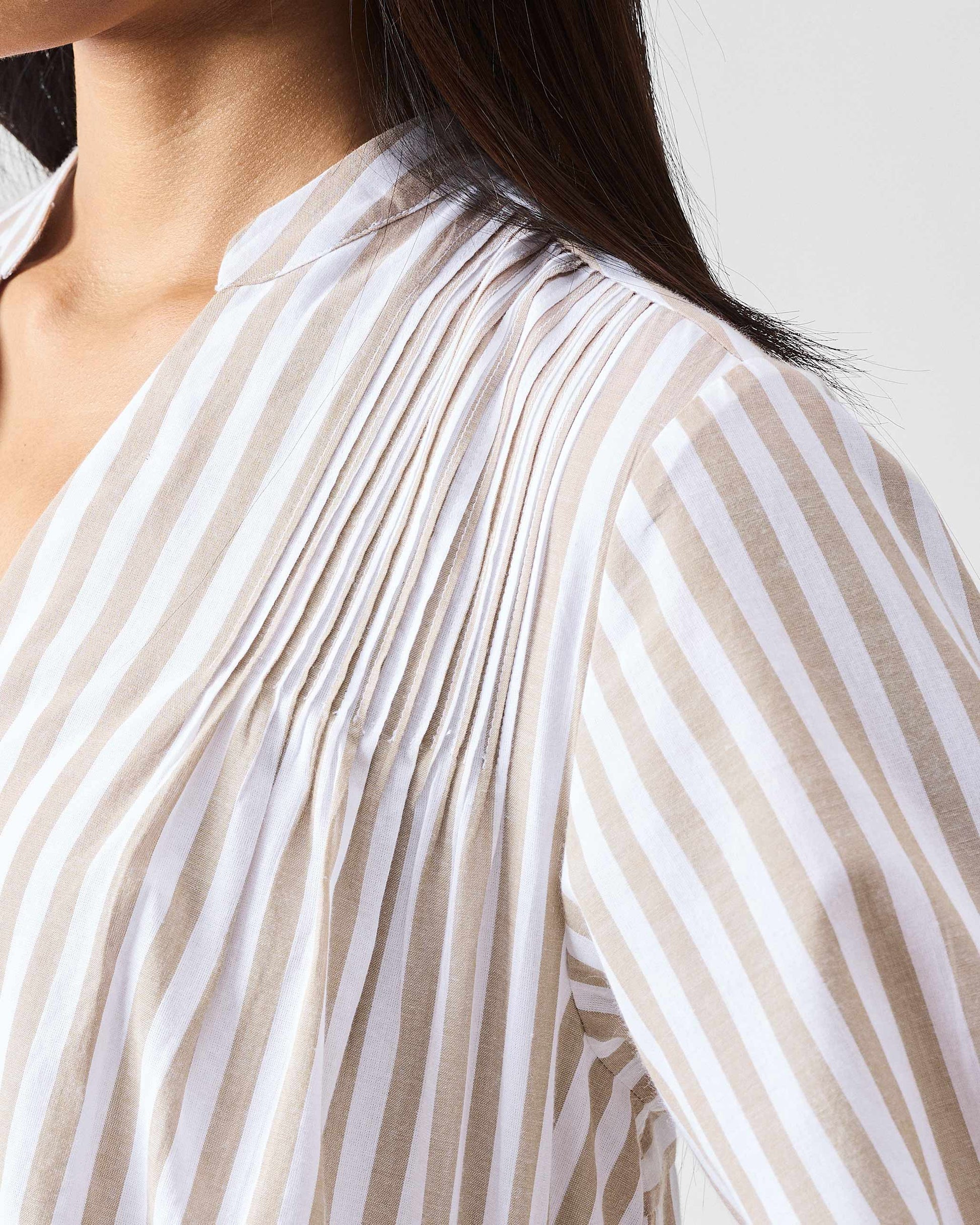 - Crafted in khaki and white yarn-dyed stripes. The yarn dyed stripes add texture and style to the design. Find different stripe directions for different panels, making this piece a statement one