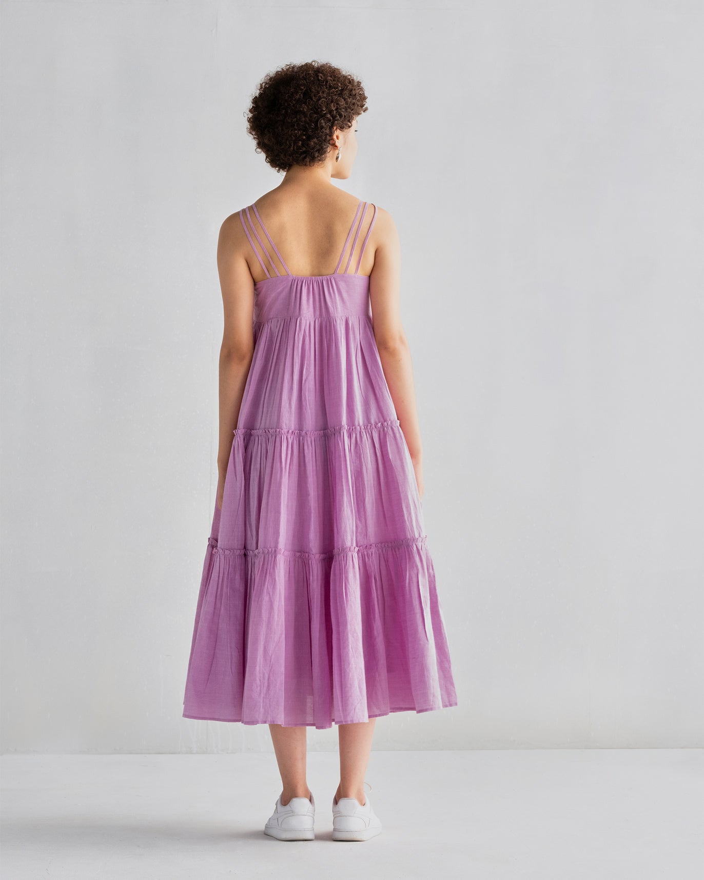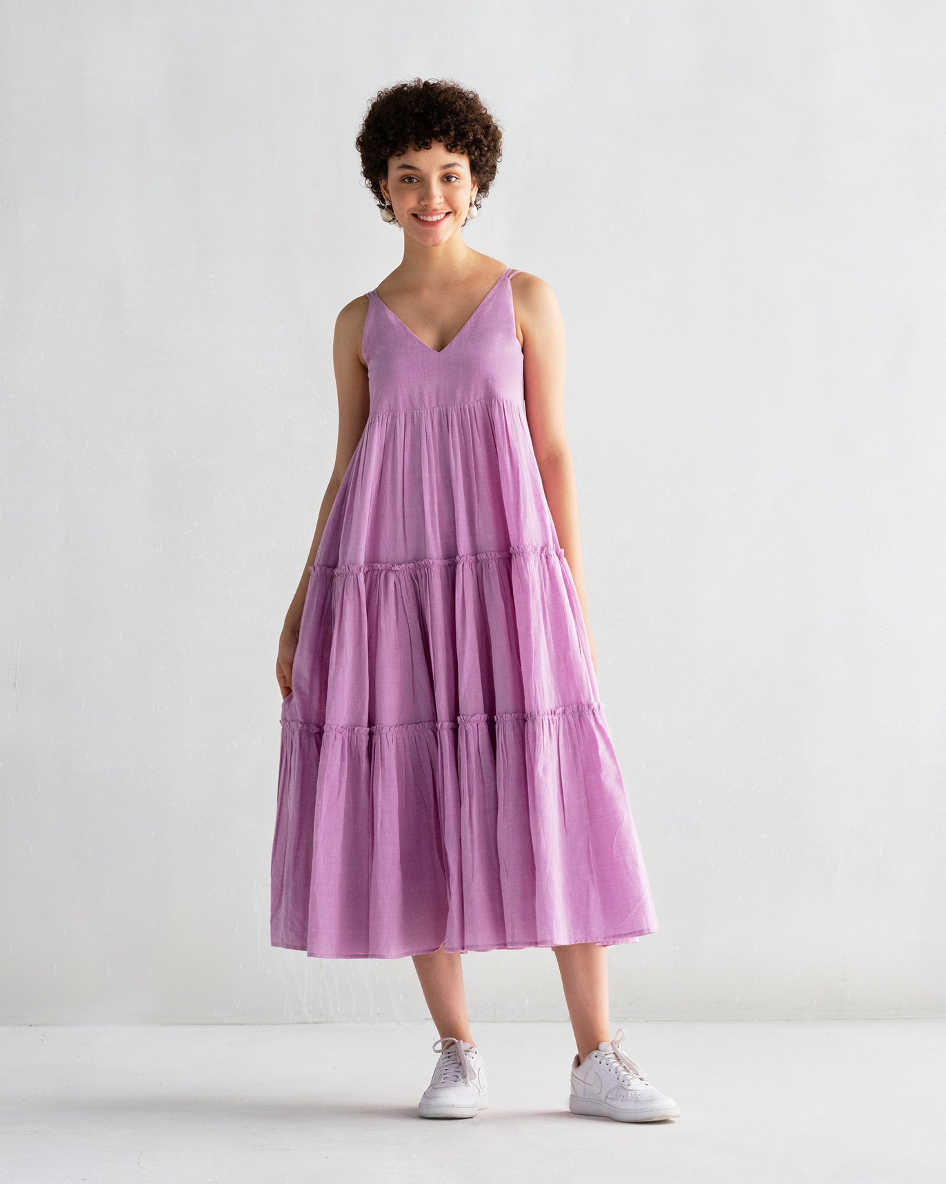 - Elevate your summer wardrobe with this lilac dress, inspired by the stunning Cambodian skies. Featuring a breezy silhouette and graceful tiers, it's perfect for both professional and casual settings.