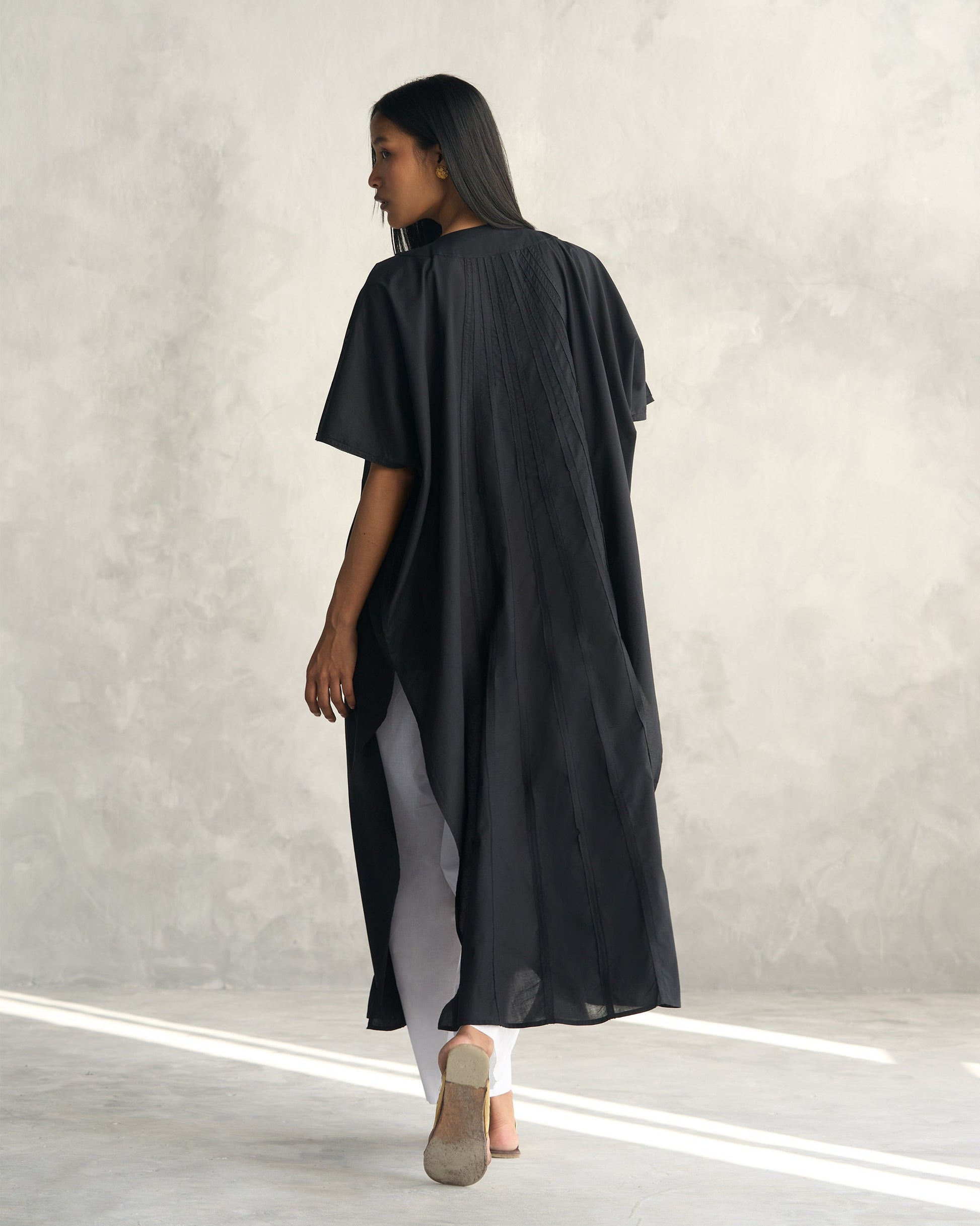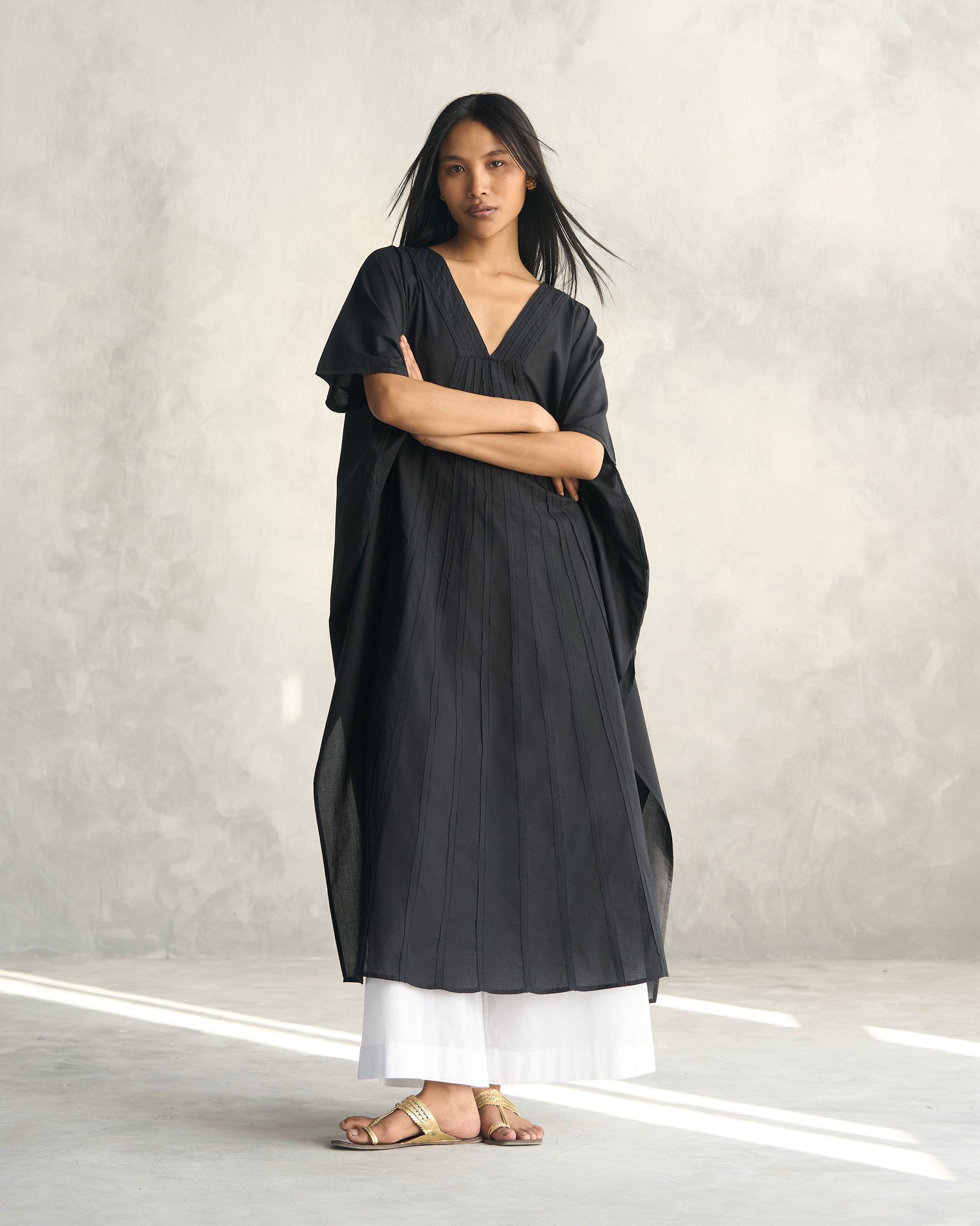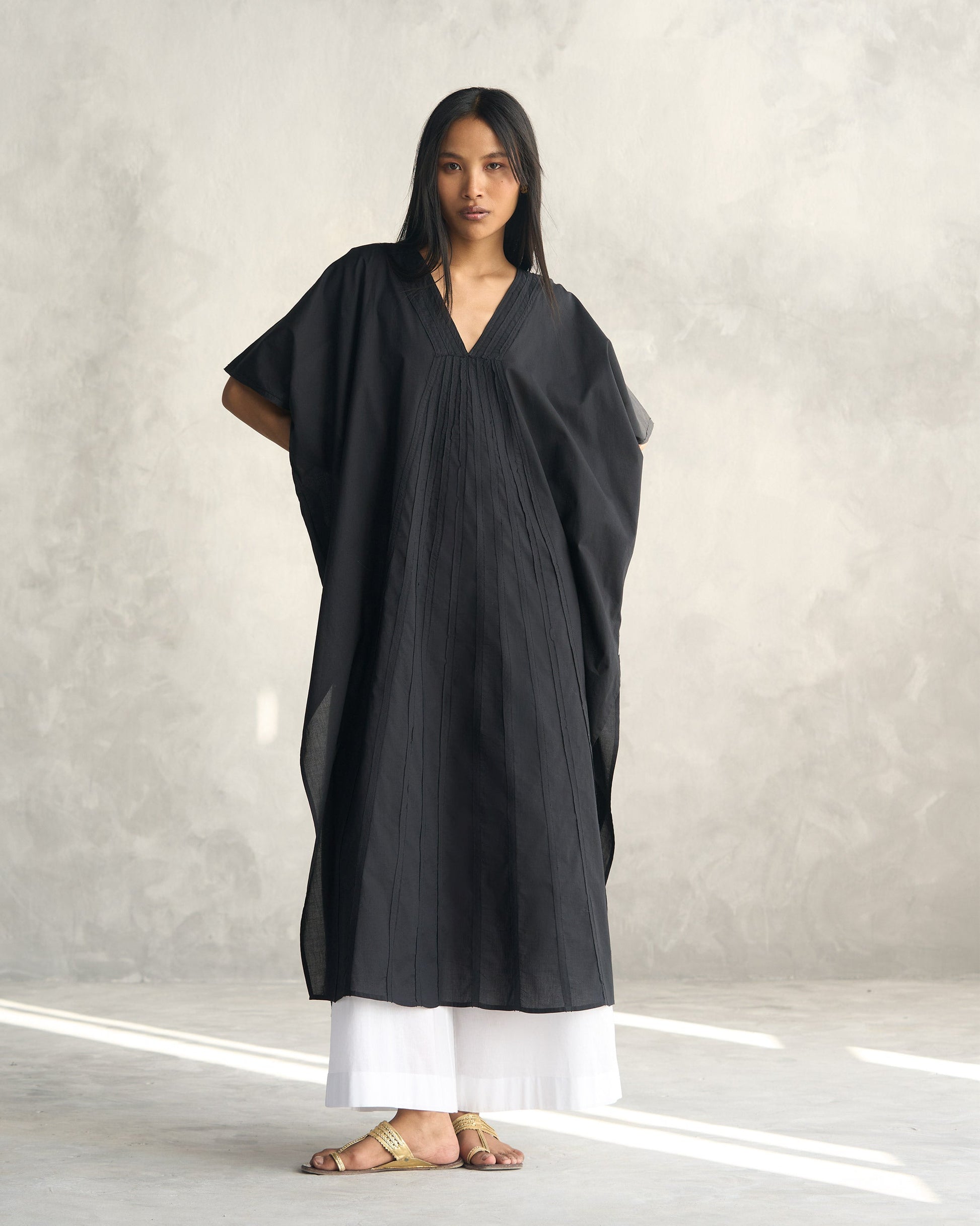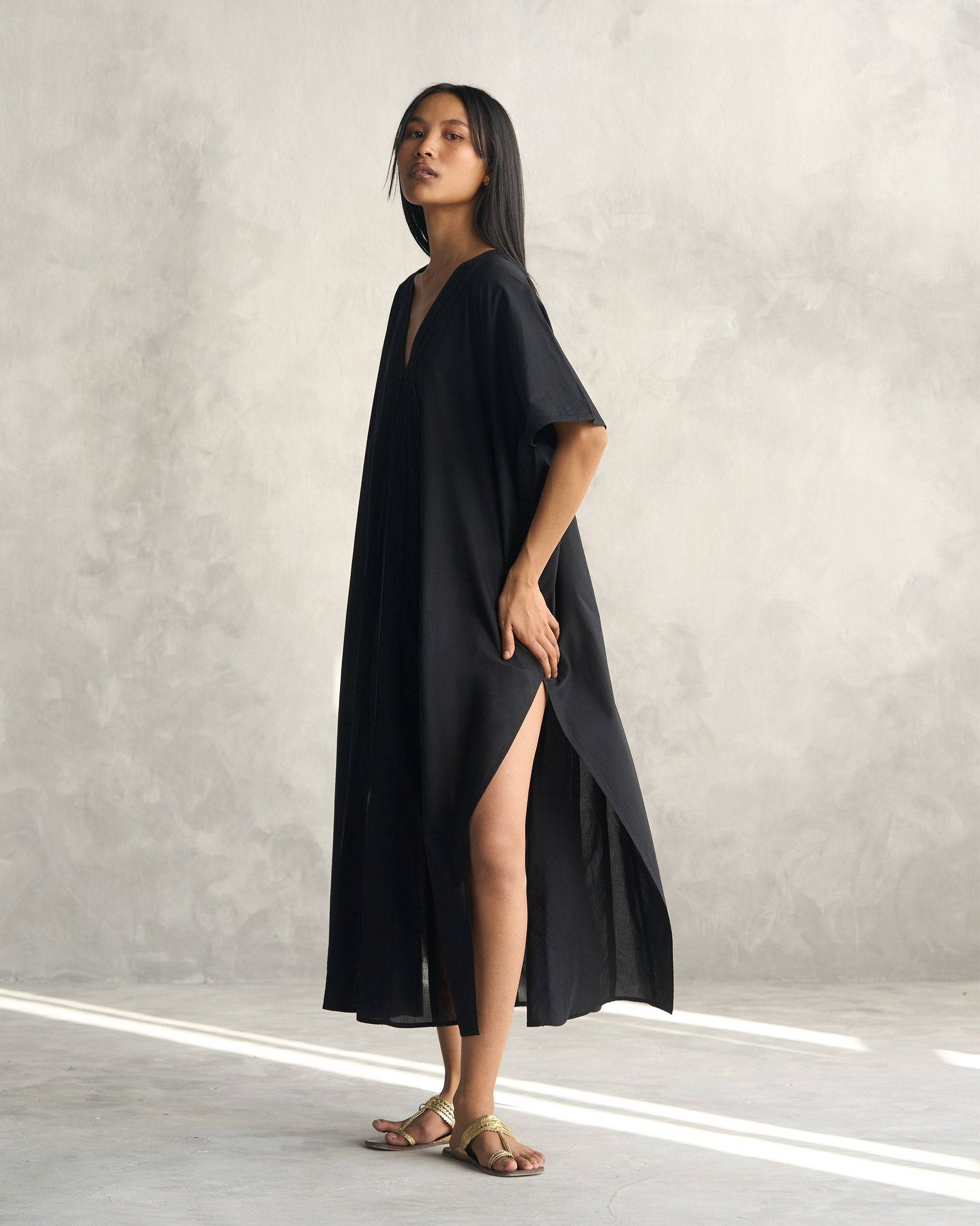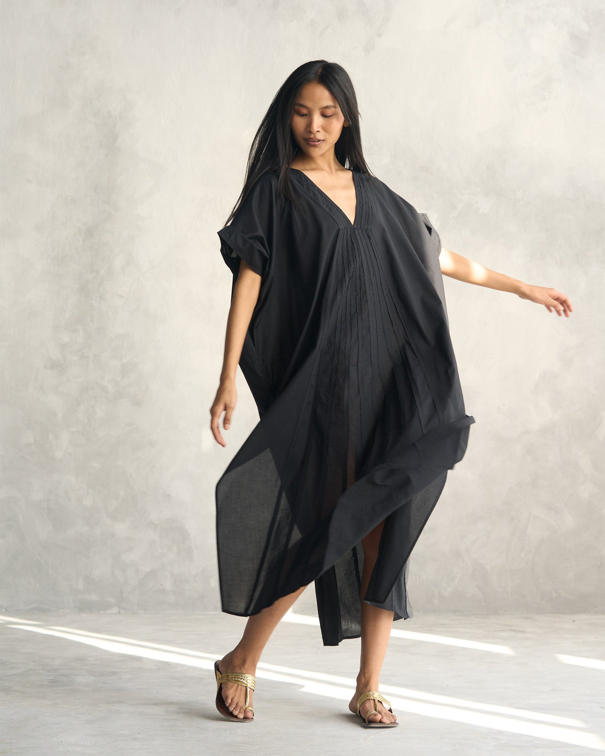 - Our calf-grazing cotton kaftan features a v-neck with panels flowing down the front, and a little flourish with frayed edges at the neck, sleeves, and panels.