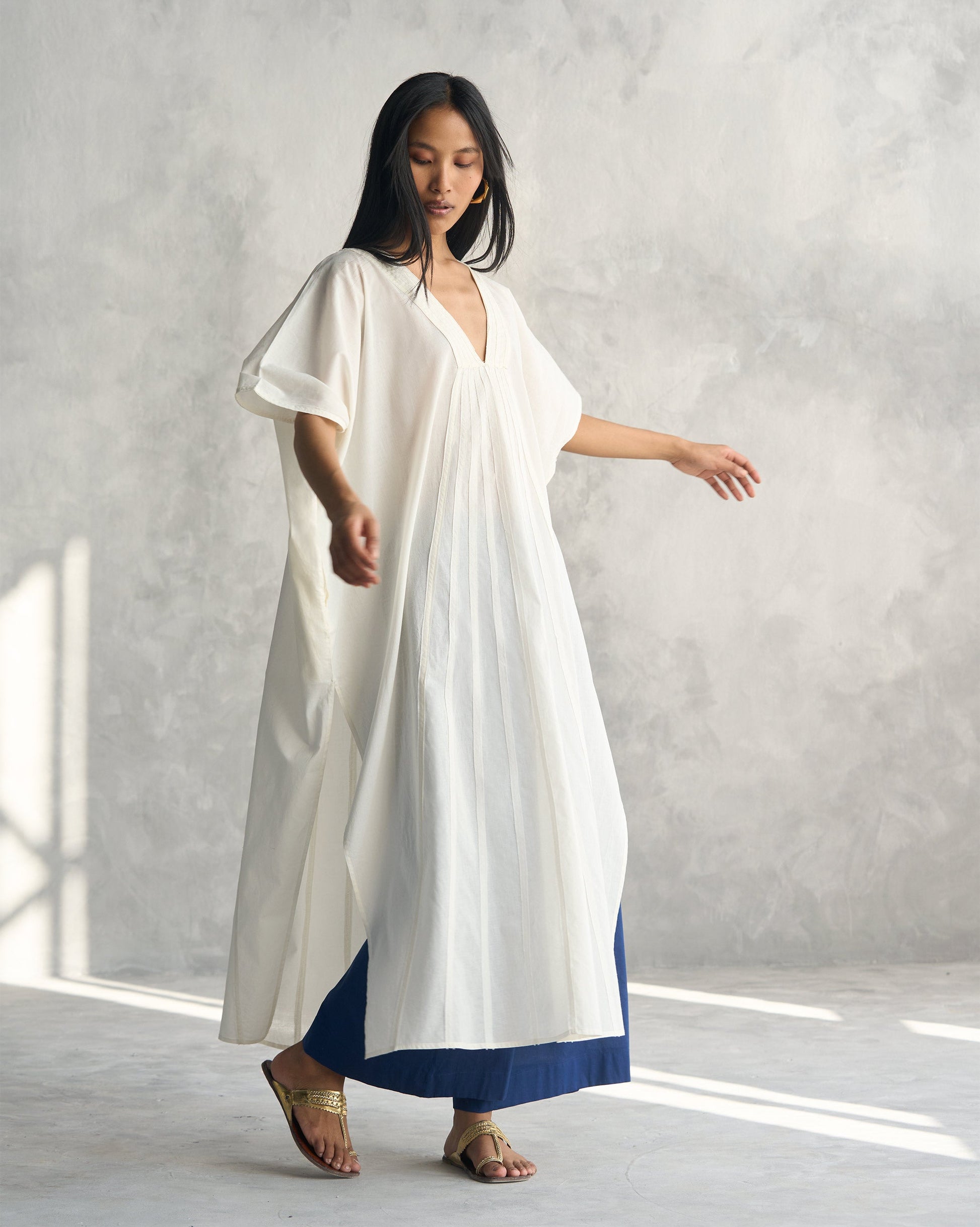 - Our calf-grazing cotton kaftan features a v-neck with panels flowing down the front, and a little flourish with frayed edges at the neck, sleeves, and panels.