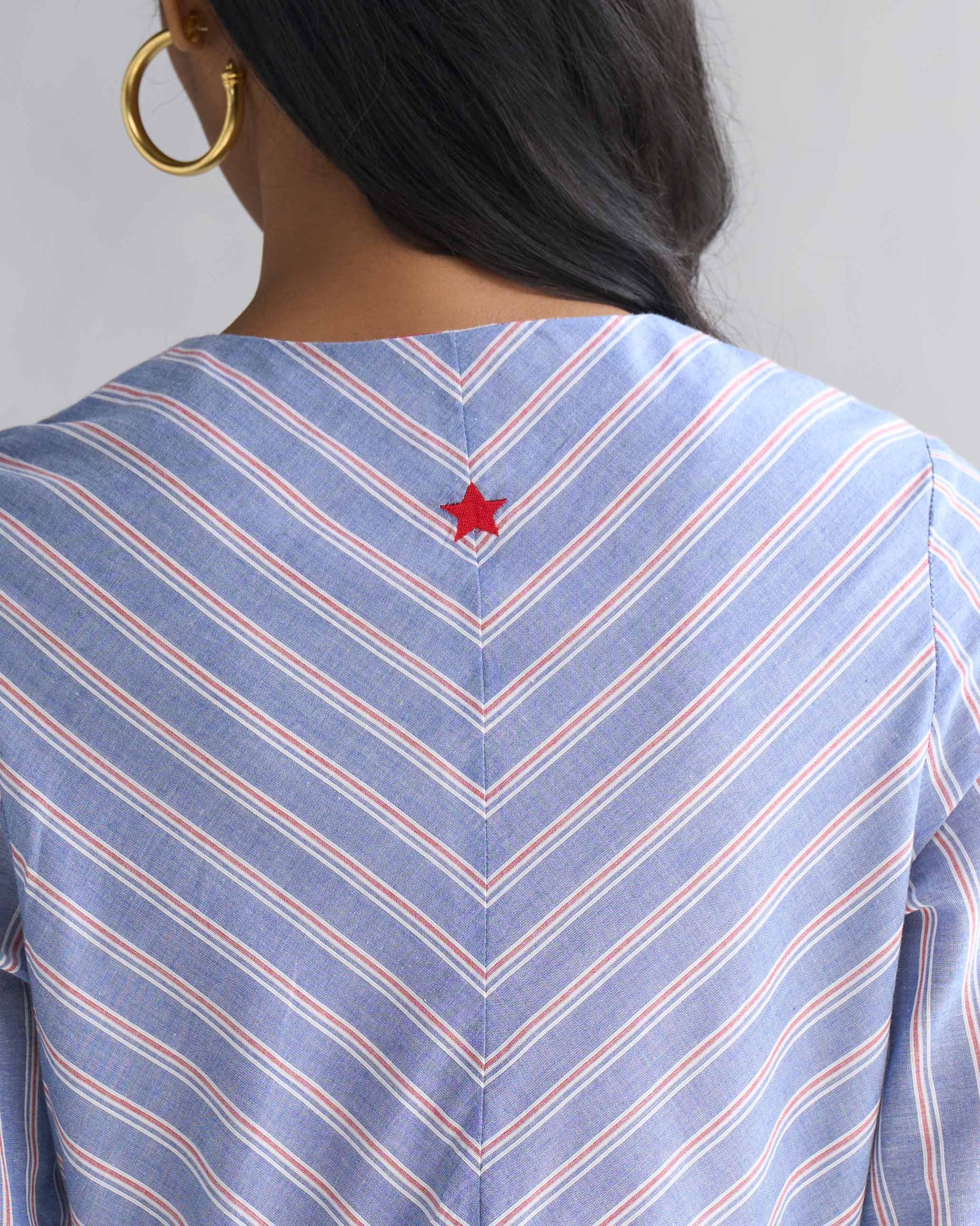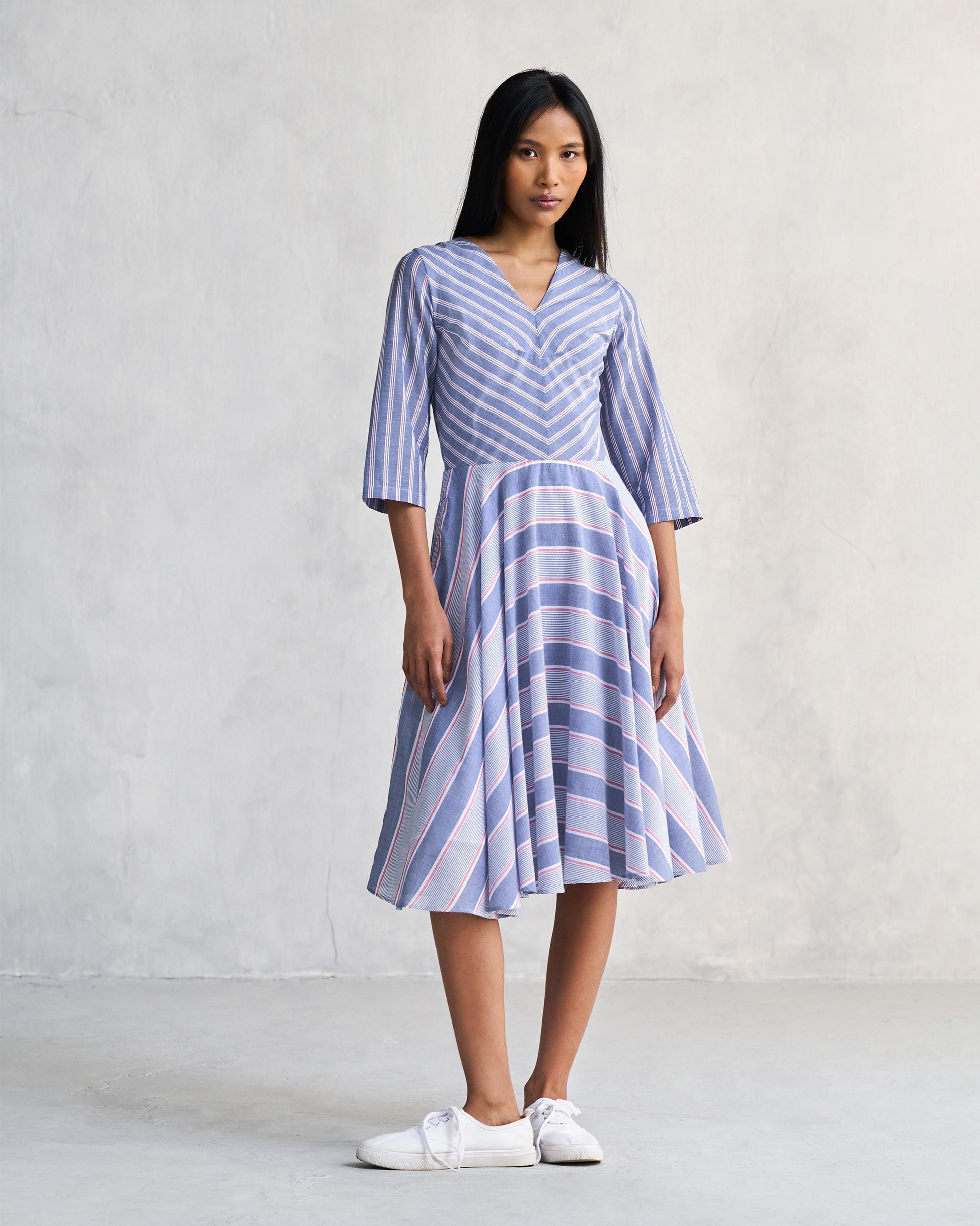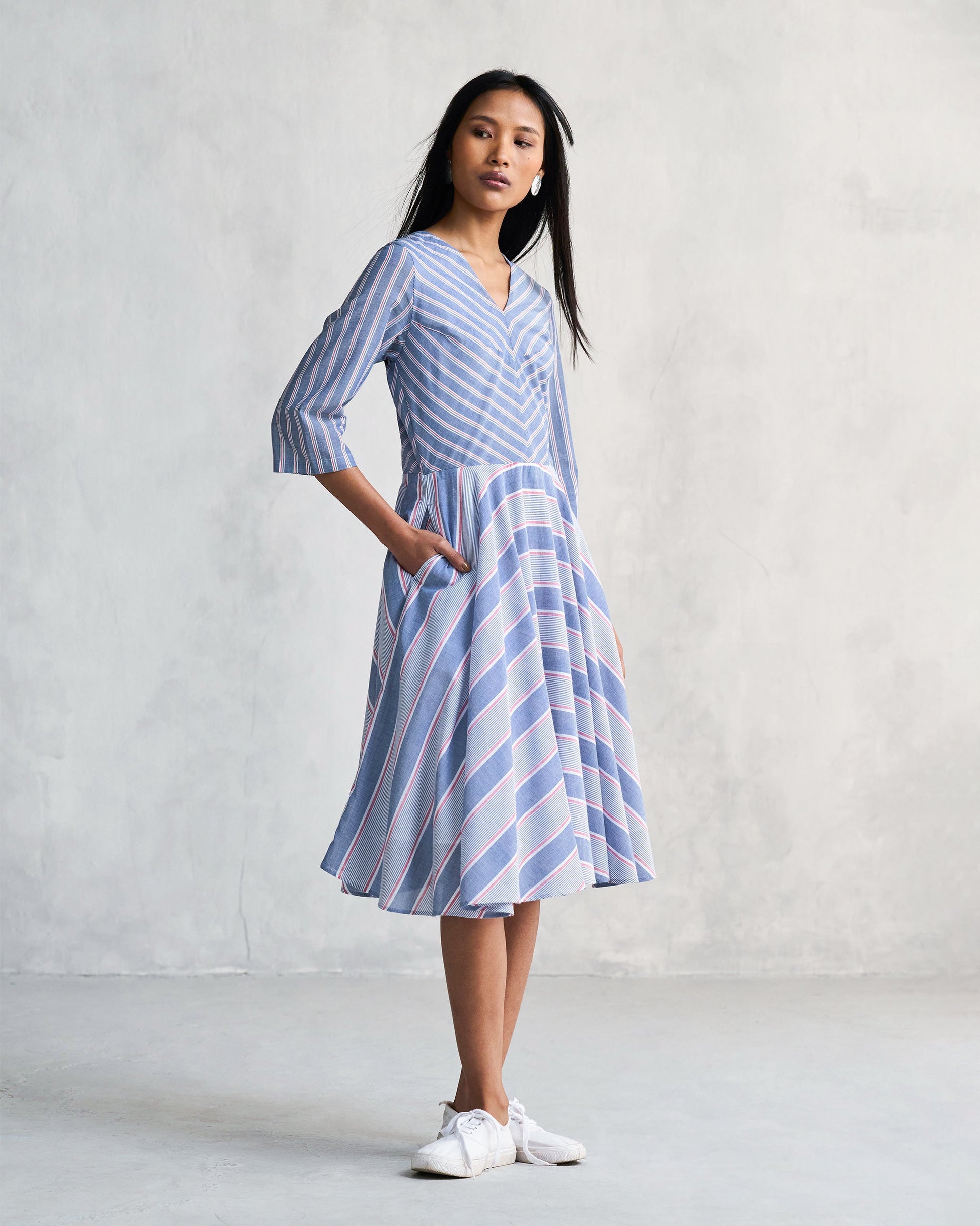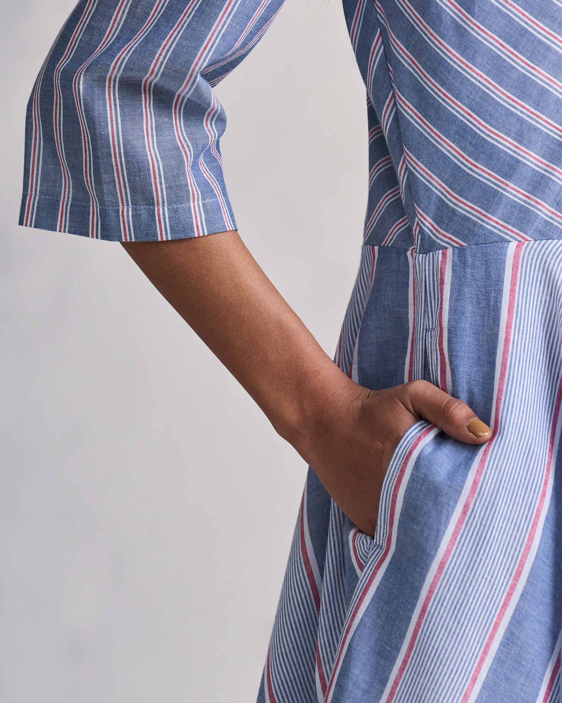 - The dress features a play of broad and narrow stripes in shades of blue and red.