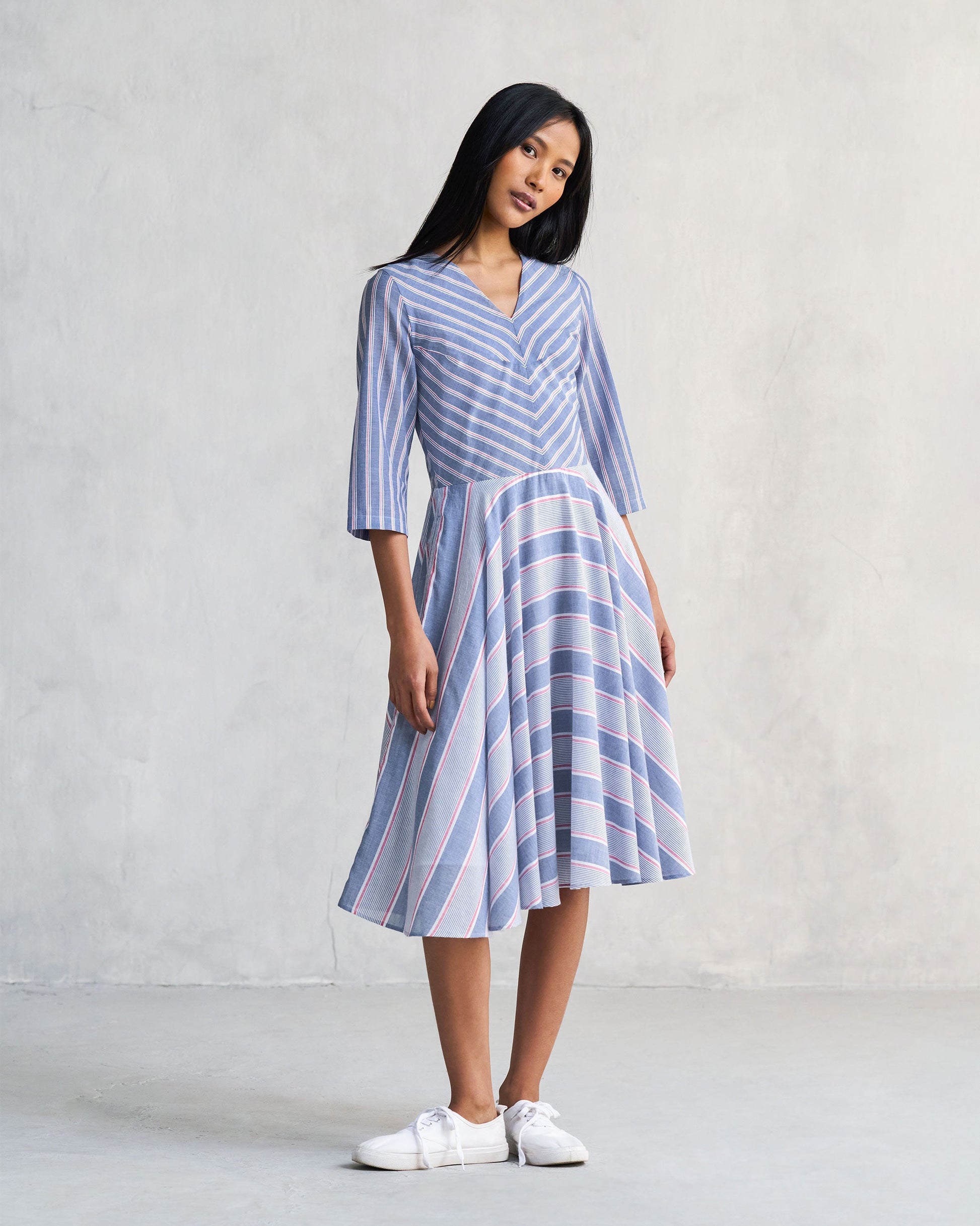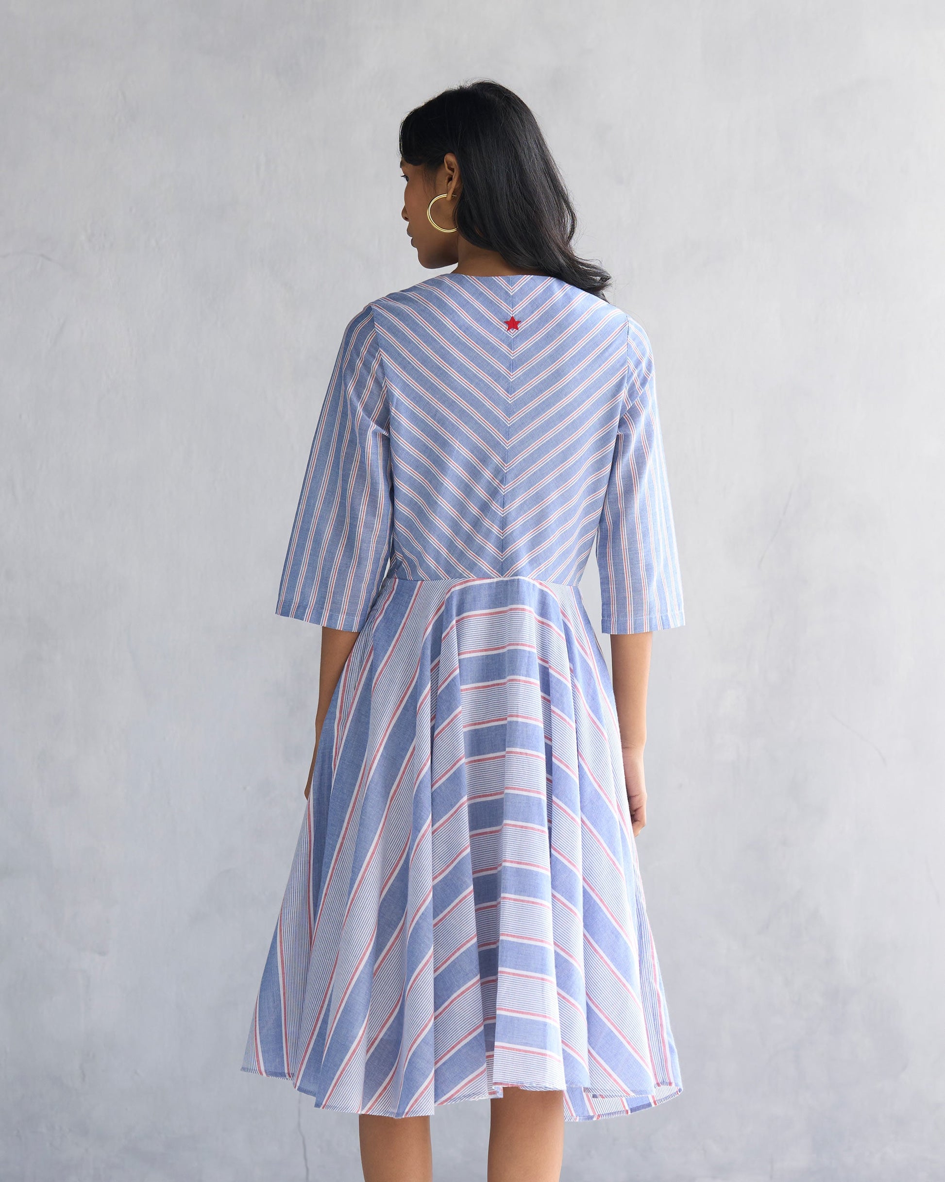 - The dynamic interplay of blue and red stripes, combined with the flattering fit and flare silhouette, makes this dress a wardrobe essential.
