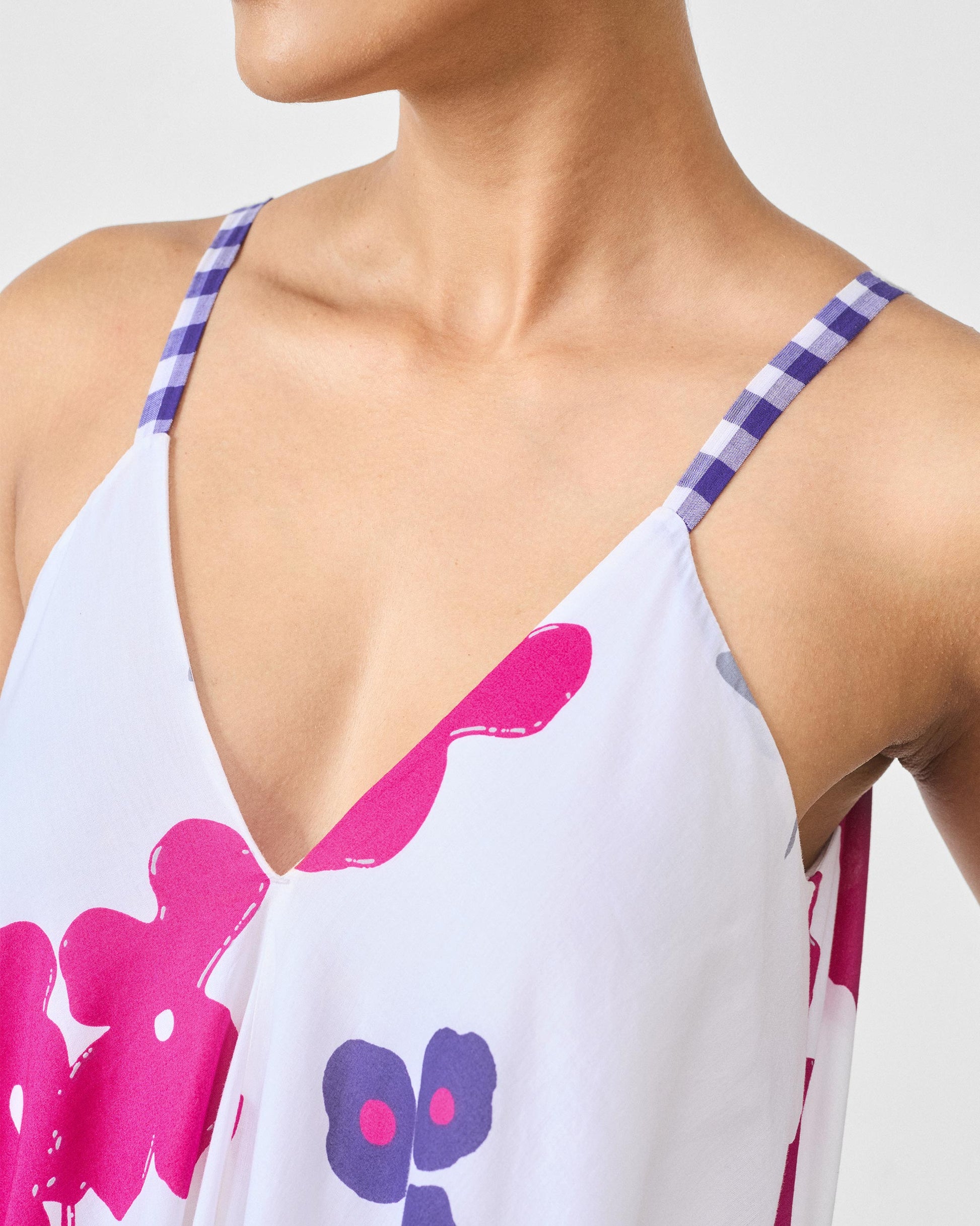 - The contrast comes alive in the details¡ªchartreuse binding at the hem and purple check straps add unexpected charm.