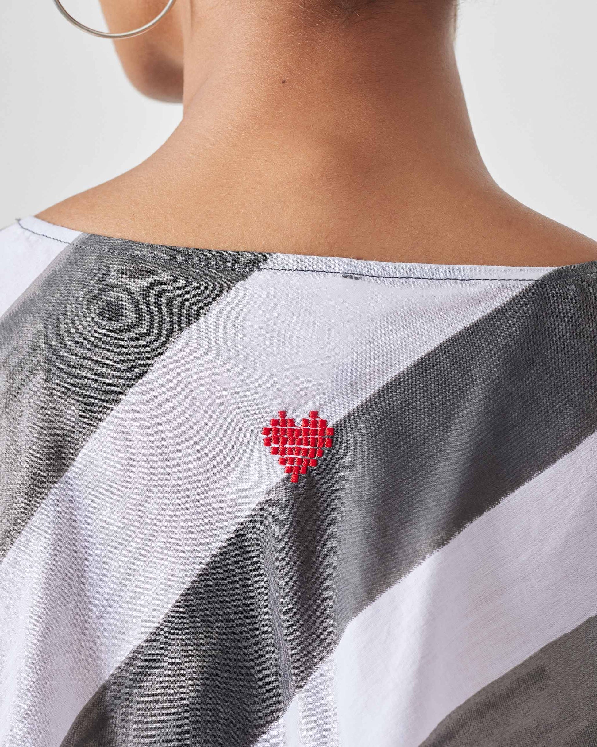 - A red pixelated heart at the back finishes the look.